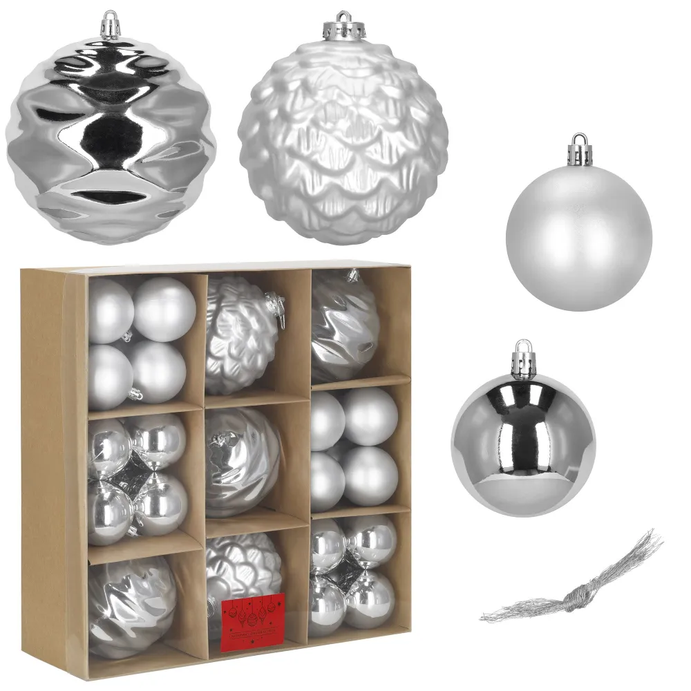 Vianočné banky strieborné mix – 12/6 cm, sada 37 ks CA0964, prinášajú do vášho domova elegantný a moderný vzhľad . Kombinácia lesklých a matných povrchov v striebornom odtieni pôsobí čisto, štýlovo a ľahko ladí s akoukoľvek farebnou výzdobou. Gule rôznych veľkostí sú ideálne na vianočný stromček , ale aj ako doplnok do sviatočných aranžmánov či stolných dekorácií.