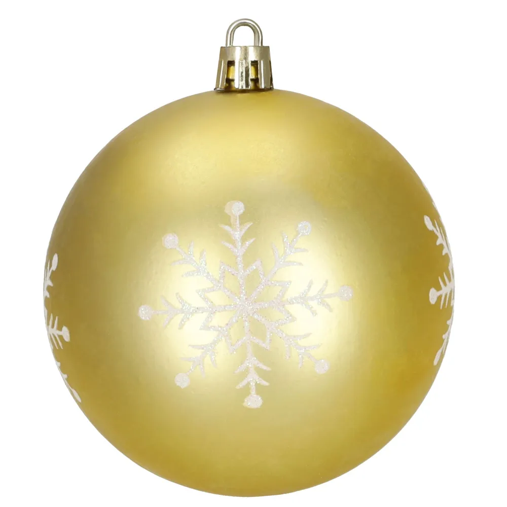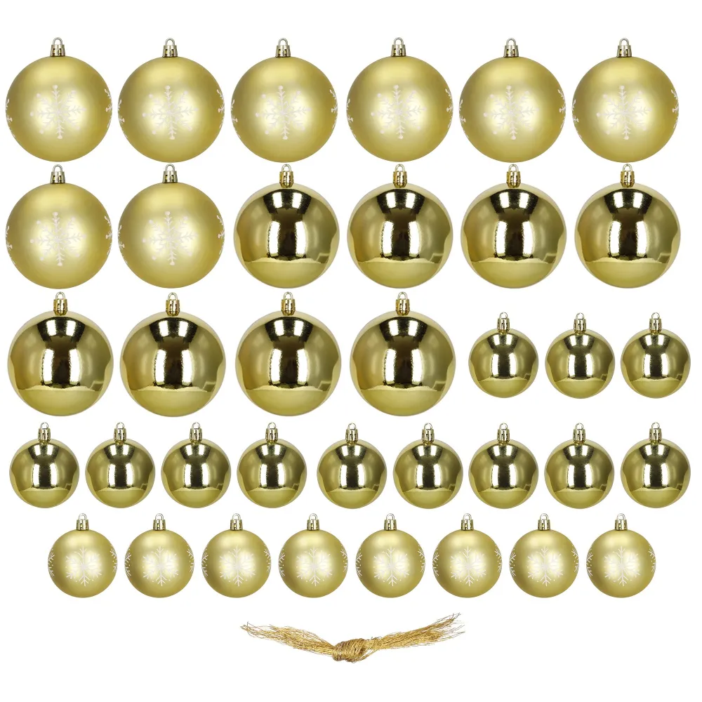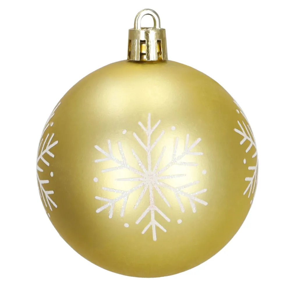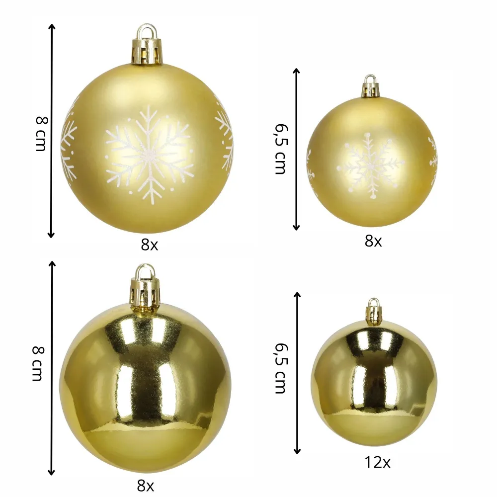 Štýlová sada vianočných ozdôb v lesklom a matnom zlatom prevedení s bielym vzorom snehovej vločky. Gule rôznych veľkostí sú ideálne na vianočný stromček aj ako doplnok do sviatočných aranžmánov. Vyrobené z nerozbitného plastu, bezpečné pre vnútorné aj vonkajšie použitie. Súčasťou balenia sú pútka na zavesenie. Priemer gulí 8 a 6,5 cm, celkom 36 kusov.