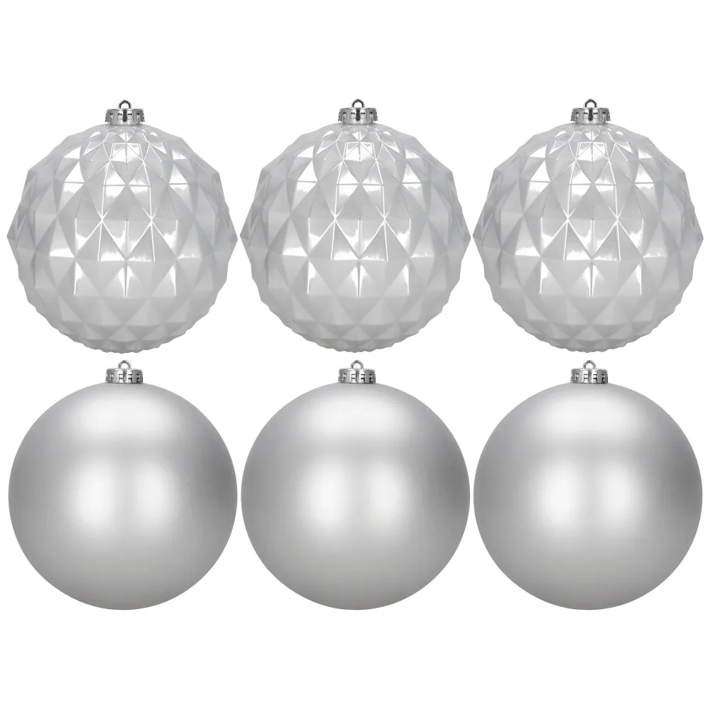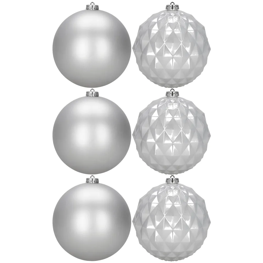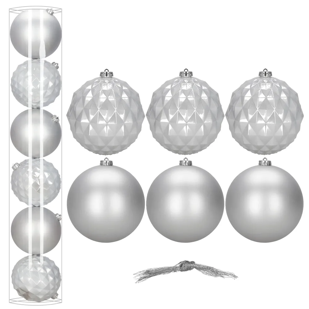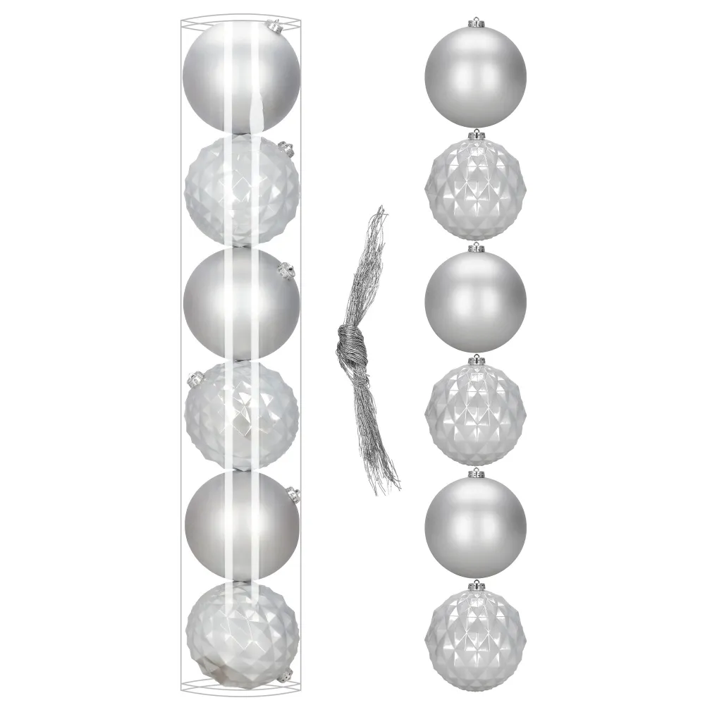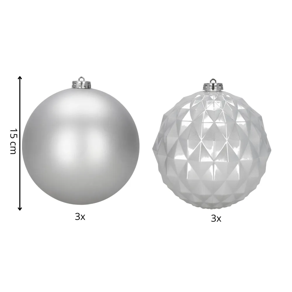 Elegantná sada vianočných ozdôb v striebornom mixe dodá vašej výzdobe moderný a luxusný vzhľad. Gule s priemerom 13,5 cm sú ideálne na vianočný stromček aj ako výrazná dekorácia. Vyrobené z nerozbitného plastu, vhodné na vnútorné i vonkajšie použitie. Súčasťou balenia sú pútka na zavesenie. Celkom 6 kusov v sade.