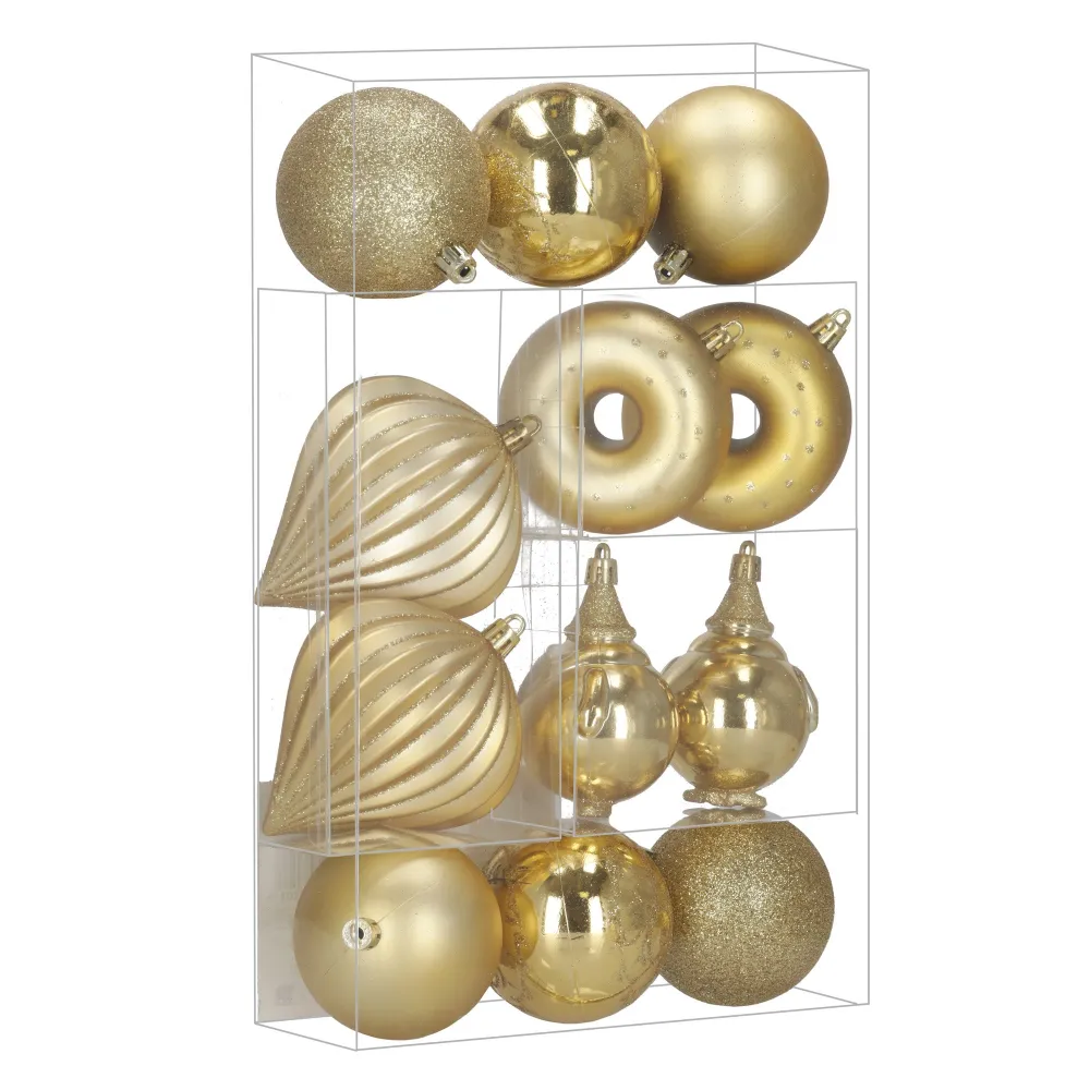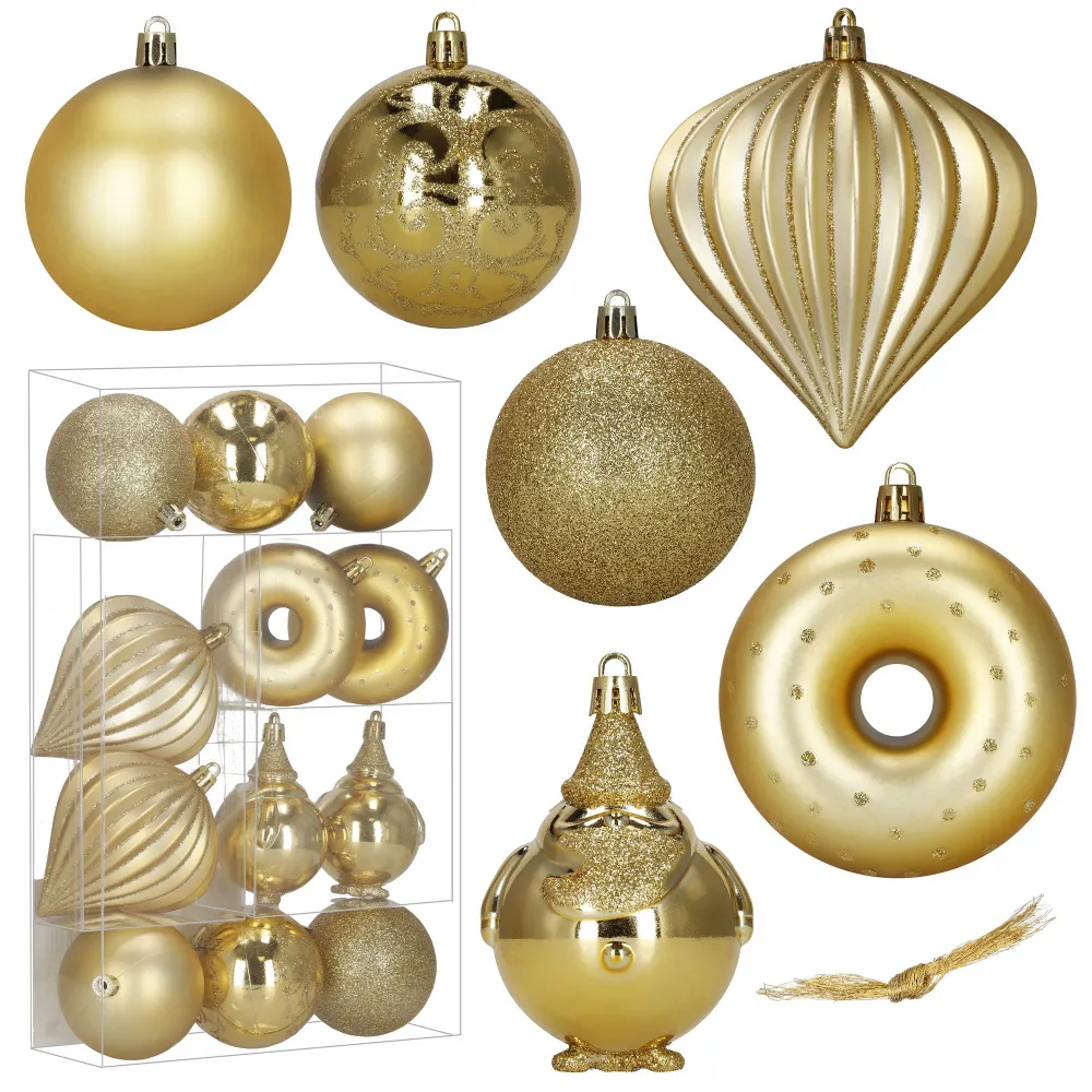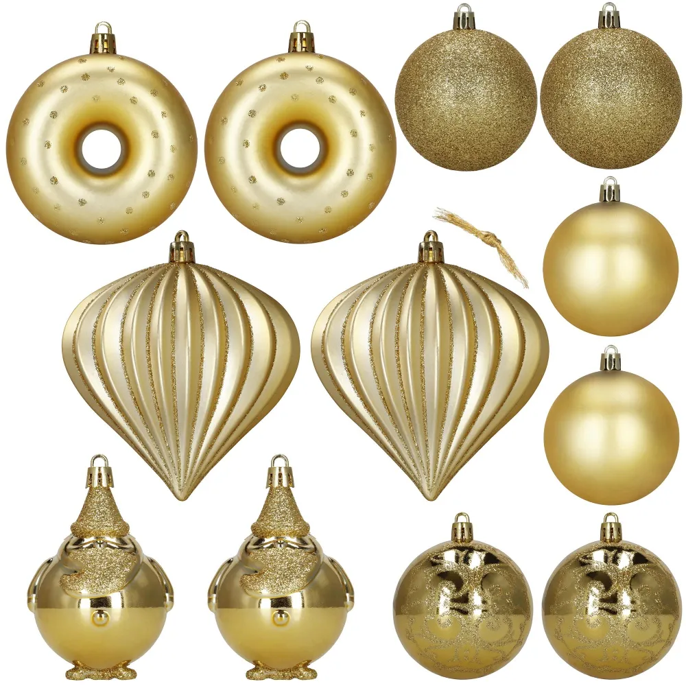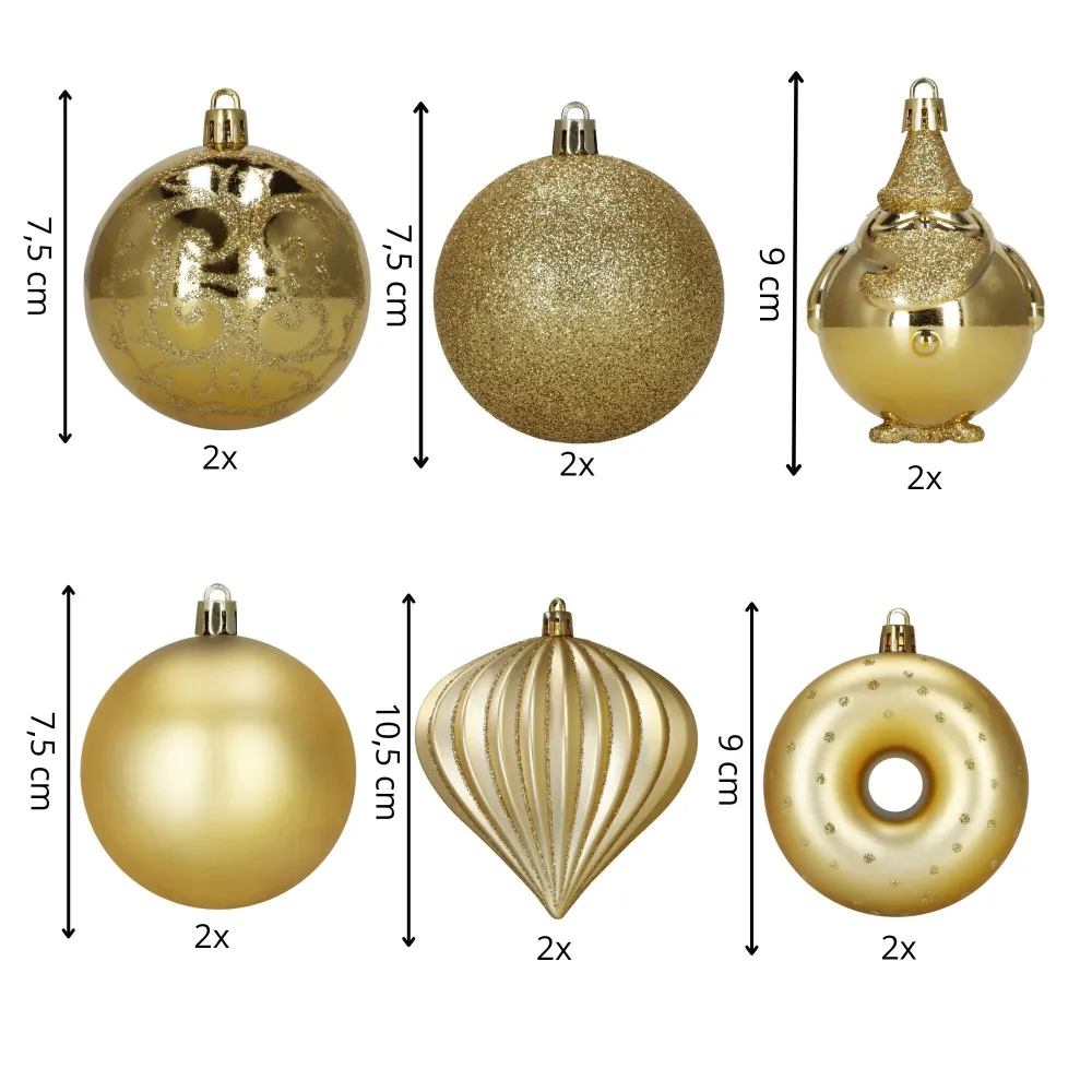 Elegantná sada vianočných ozdôb v rôznych tvaroch a odtieňoch zlatej farby dodá sviatočnej výzdobe luxusný vzhľad. Obsahuje ľahké, nerozbitné dekorácie z plastu s praktickými pútkami pre ľahké zavesenie. Skvele sa hodí na stromček aj ako doplnok interiérovej či vonkajšej dekorácie. Priemery ozdôb: 6 cm, 7,5 cm a 9 cm.