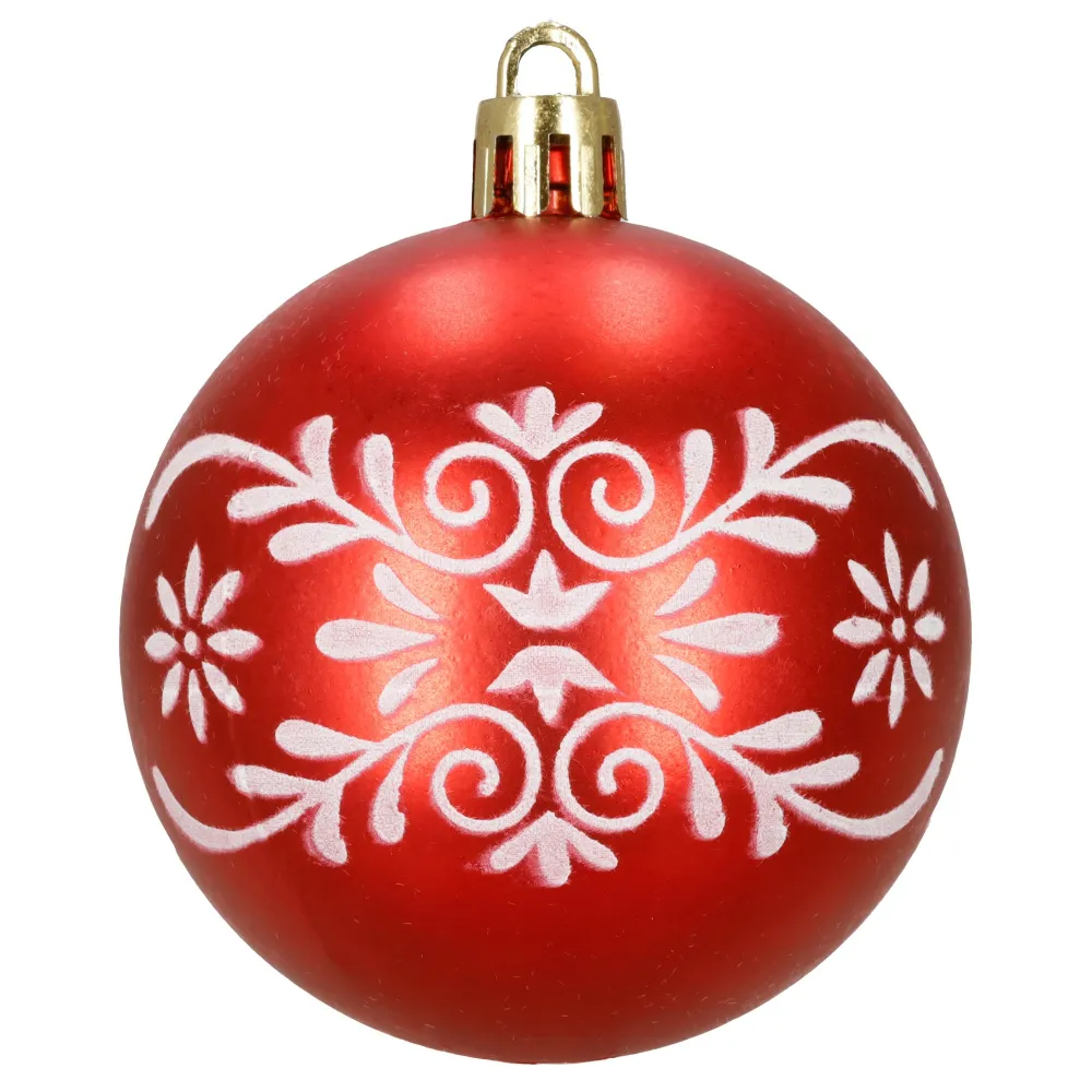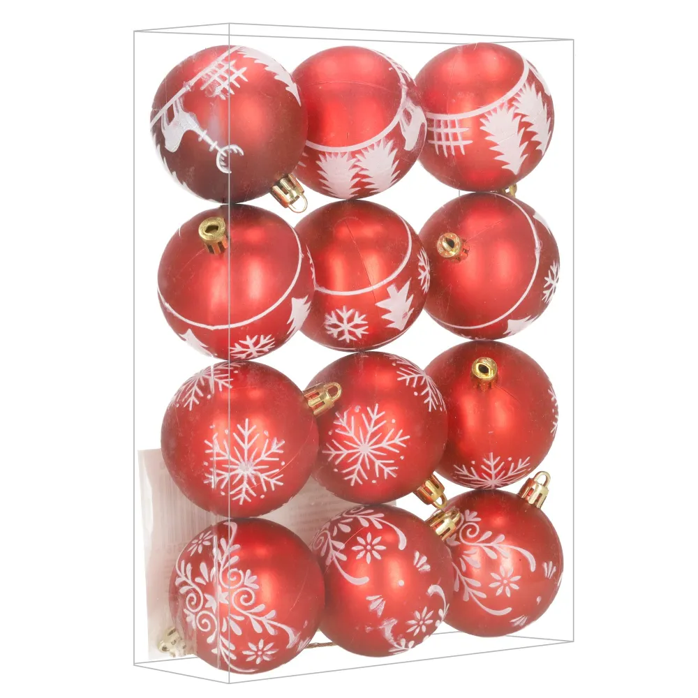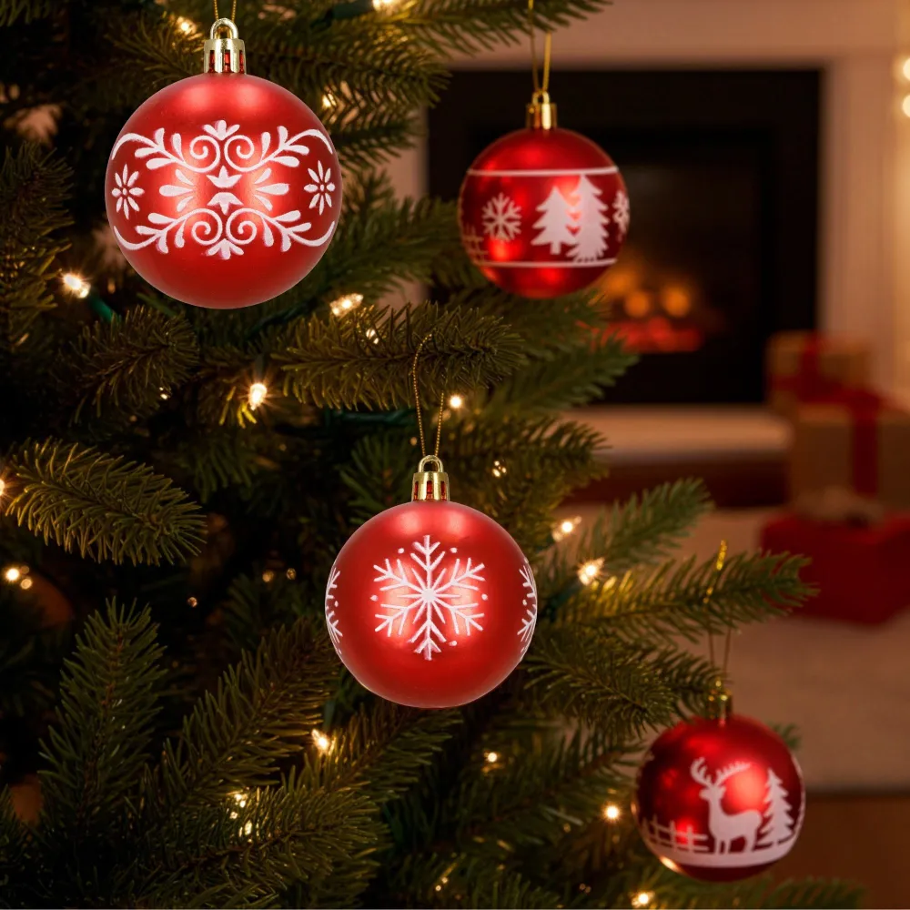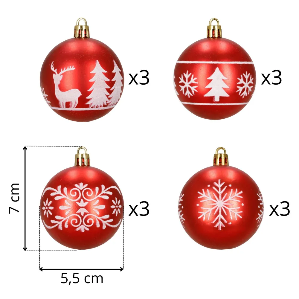 Sada červených vianočných ozdôb s bielym zimným zdobením dodá výzdobe tradičný a veselý vzhľad. Ideálna na vianočný stromček, sviatočný stôl aj do okien. Vyrobené z nerozbitného plastového materiálu, vhodné na vnútorné aj vonkajšie použitie. Súčasťou balenia sú pútka na zavesenie. Priemer 5,5 cm, celkom 12 kusov v sade.