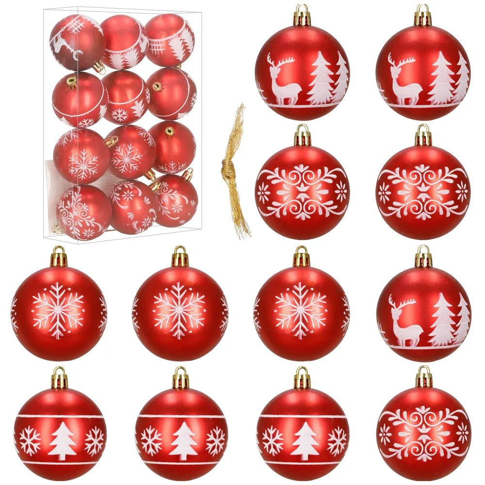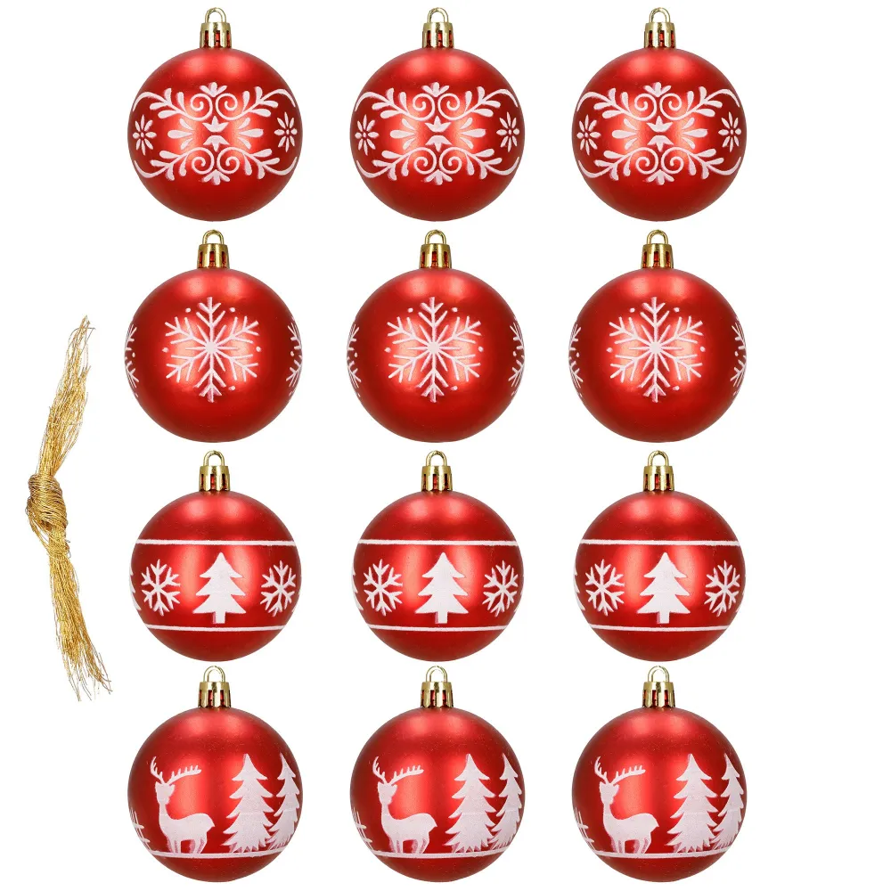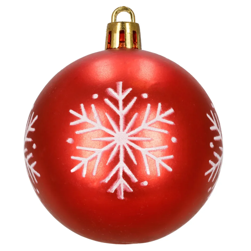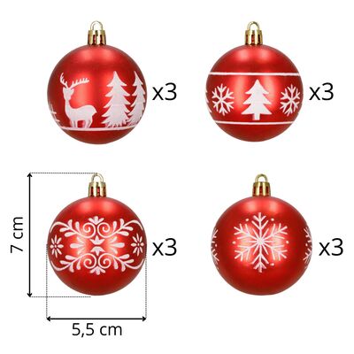 Sada červených vianočných ozdôb s bielym zimným zdobením dodá výzdobe tradičný a veselý vzhľad. Ideálna na vianočný stromček, sviatočný stôl aj do okien. Vyrobené z nerozbitného plastového materiálu, vhodné na vnútorné aj vonkajšie použitie. Súčasťou balenia sú pútka na zavesenie. Priemer 5,5 cm, celkom 12 kusov v sade.