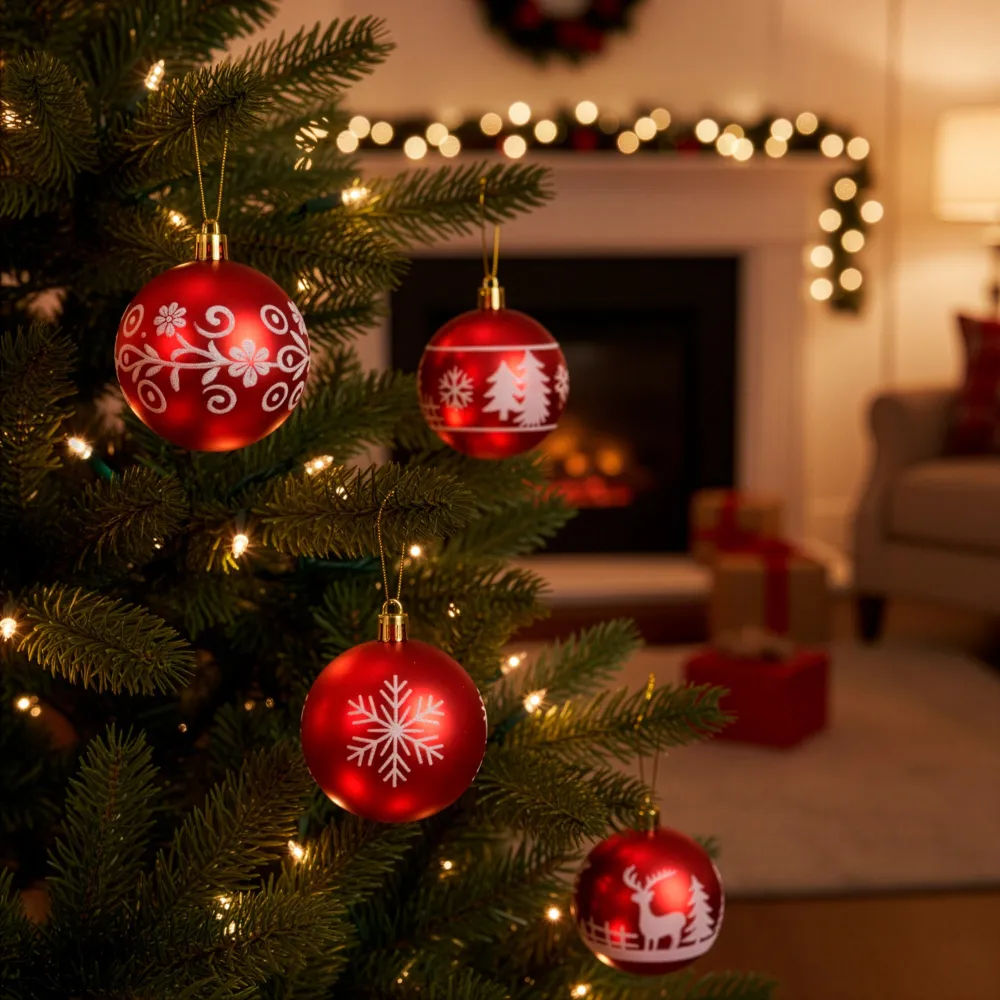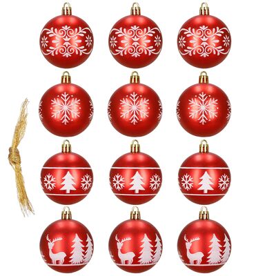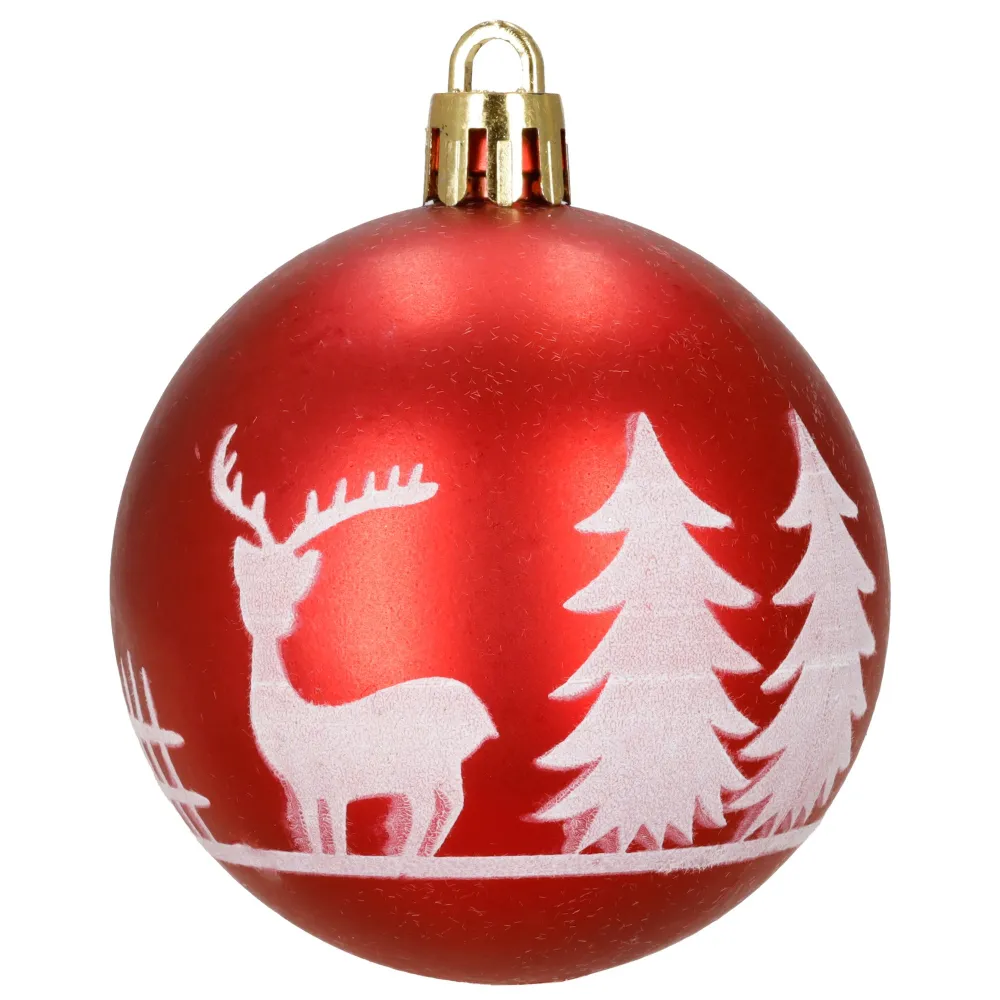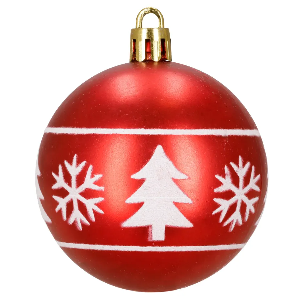 Sada červených vianočných ozdôb s bielym zimným zdobením dodá výzdobe tradičný a veselý vzhľad. Ideálna na vianočný stromček, sviatočný stôl aj do okien. Vyrobené z nerozbitného plastového materiálu, vhodné na vnútorné i vonkajšie použitie. Súčasťou balenia sú pútka na zavesenie. Priemer 5,5 cm, celkom 12 kusov v sade.