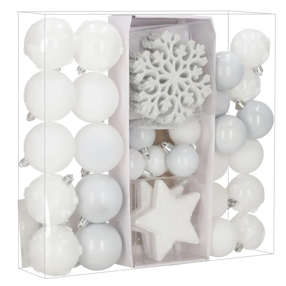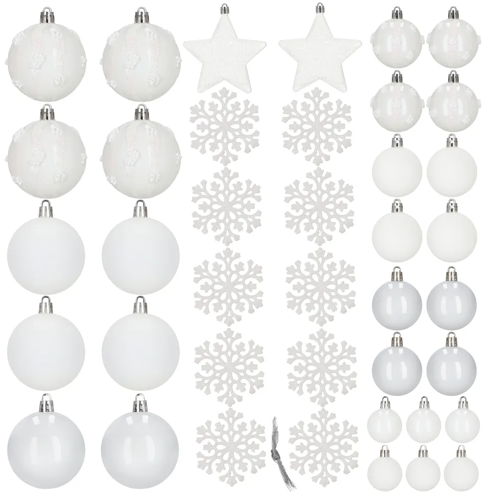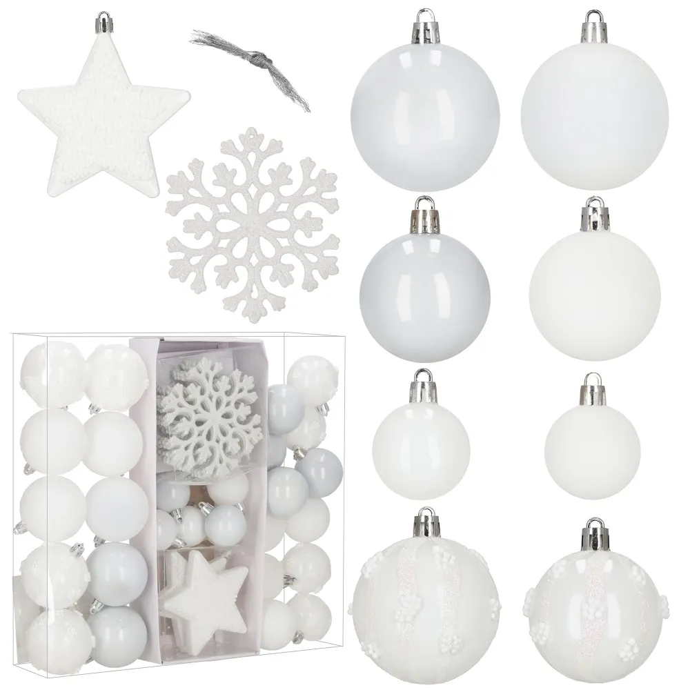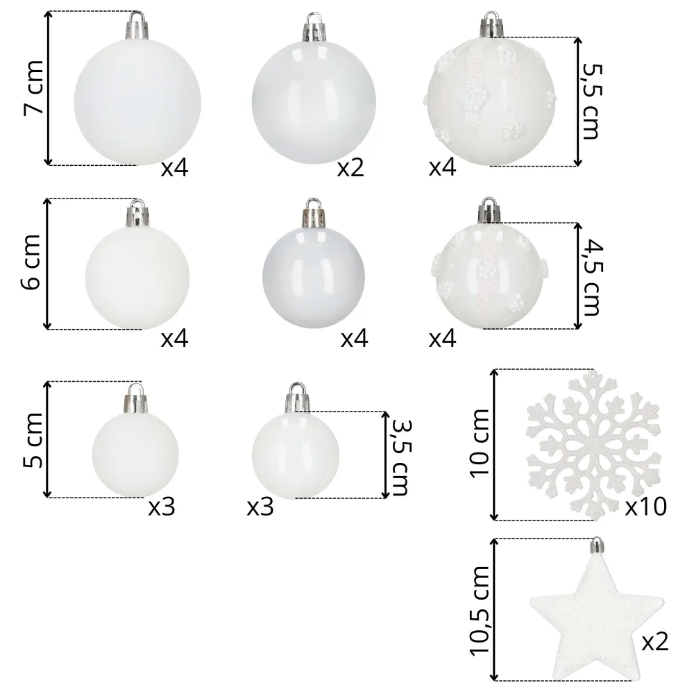 Sada bielych vianočných ozdôb v rôznych tvaroch a povrchových úpravách dodá výzdobe elegantný a zimný vzhľad. Obsahuje ľahké, nerozbitné plastové gule, vločky aj hviezdy s pútkami pre ľahké zavesenie. Vhodné na stromček aj ako dekorácia do interiéru či exteriéru. Priemery gulí: 3,5 cm, 4,5 cm a 5,5 cm.