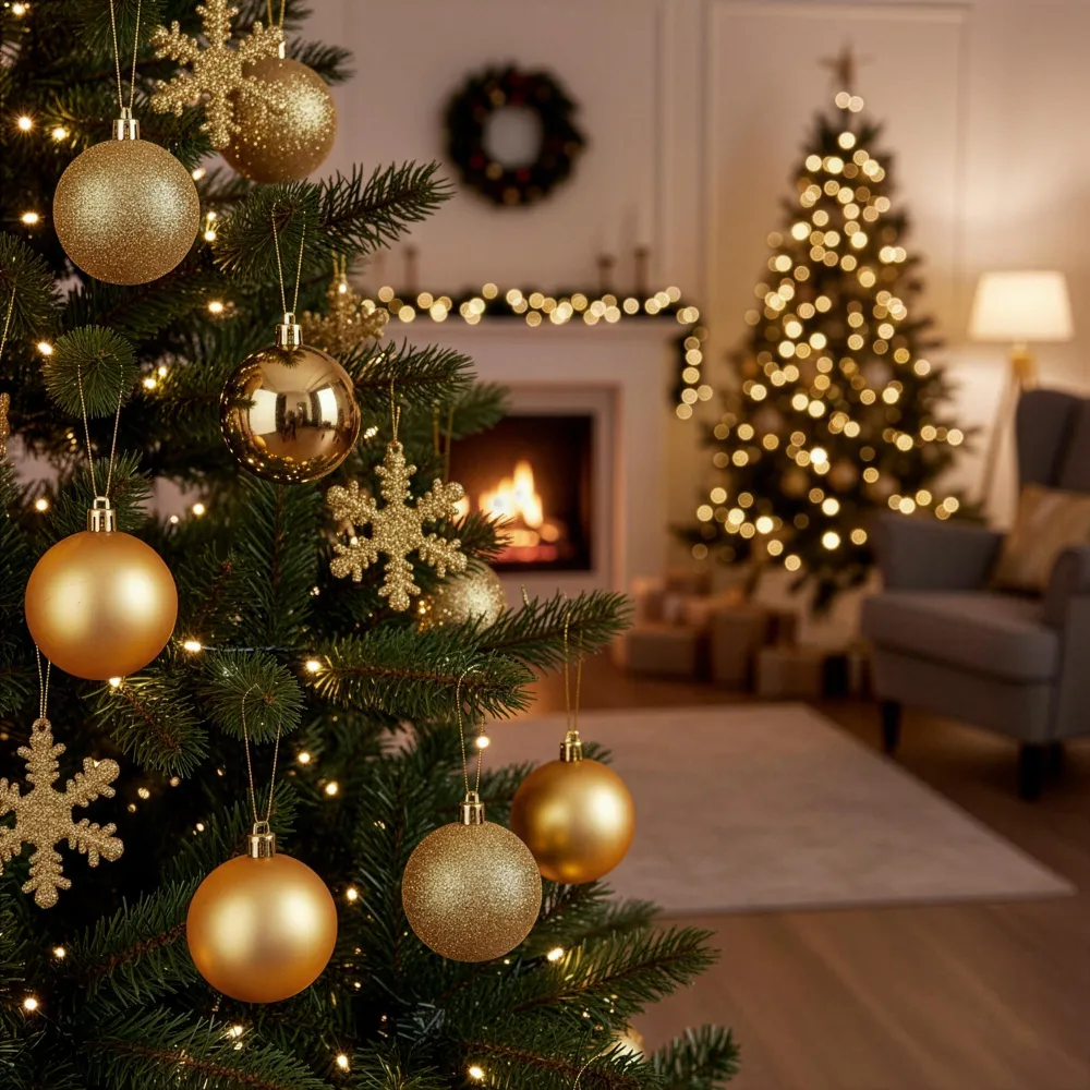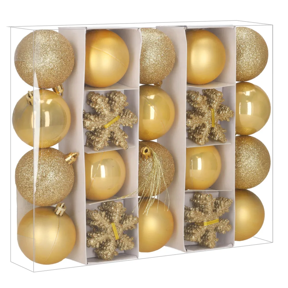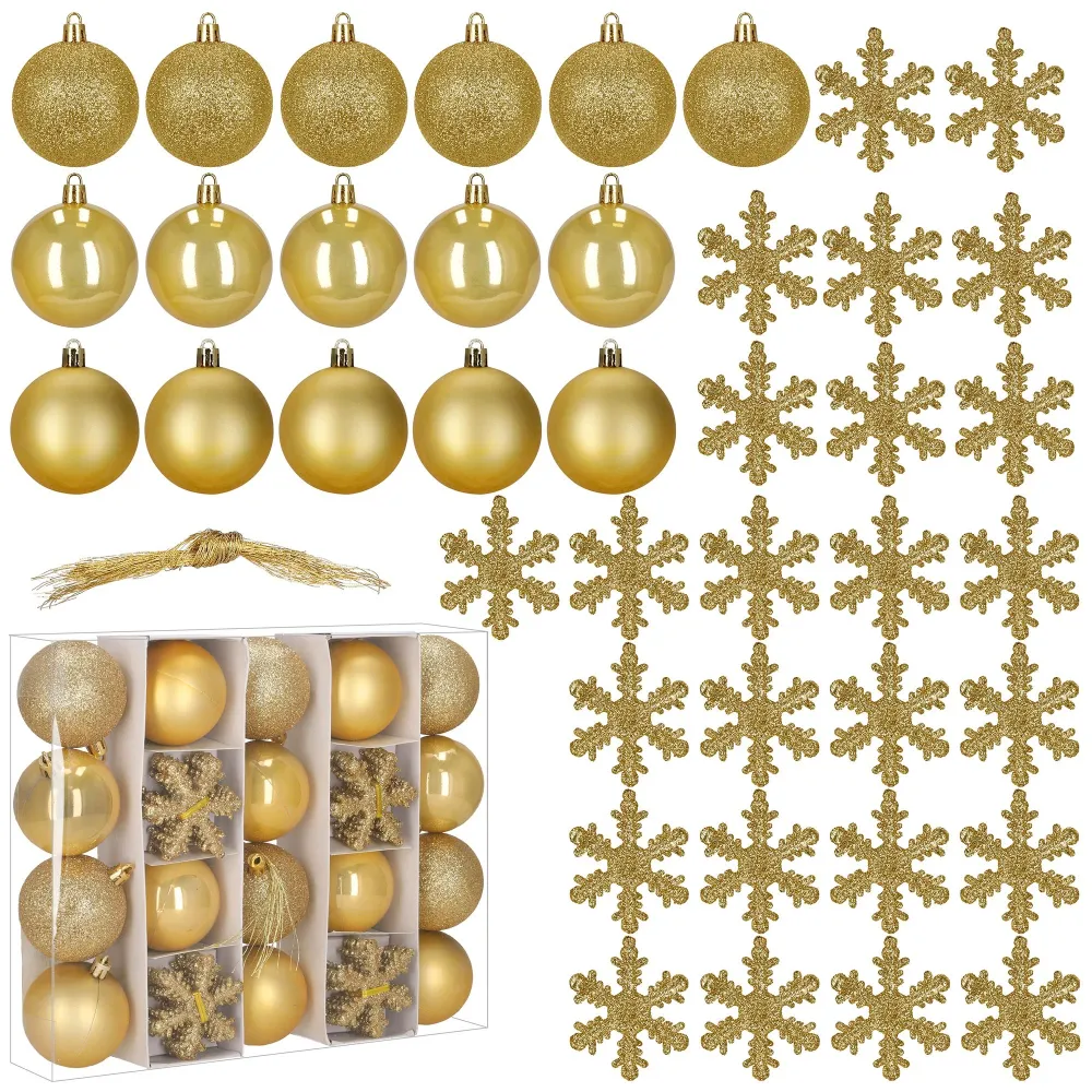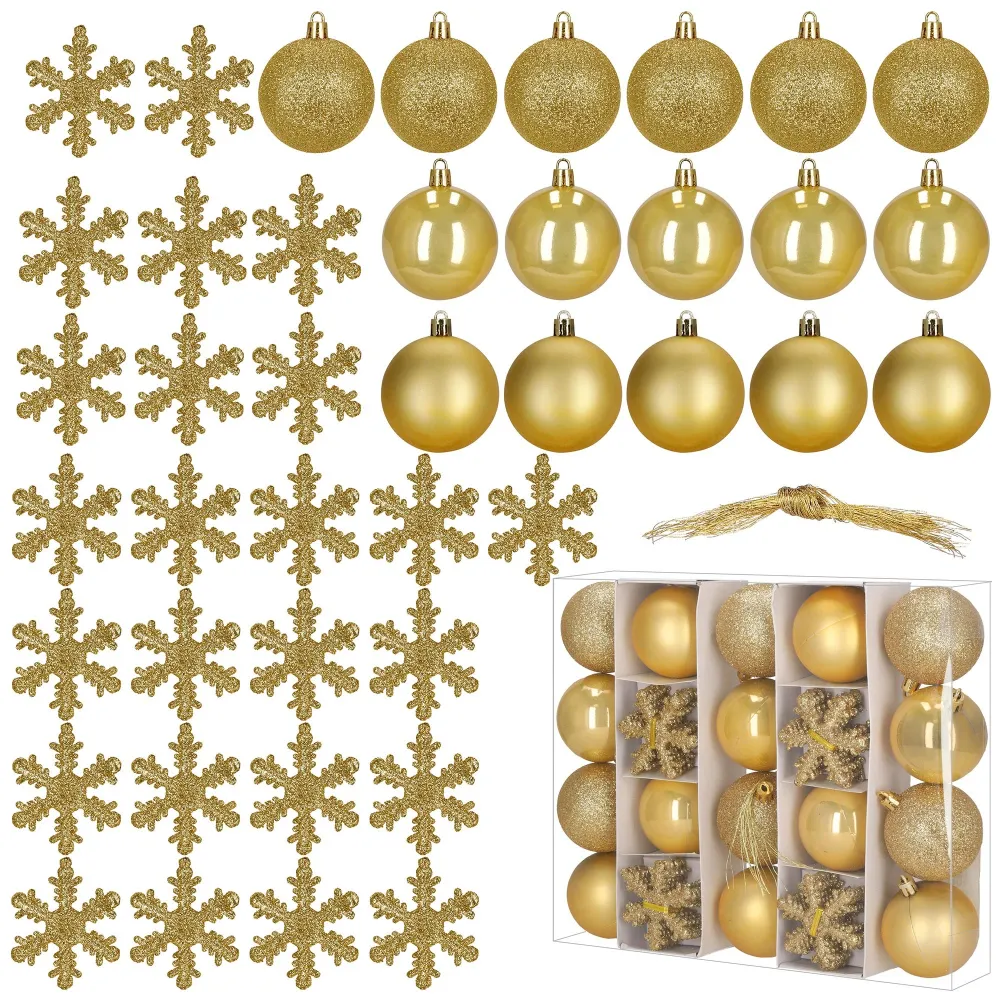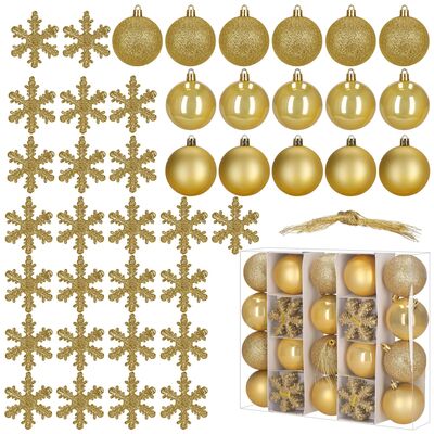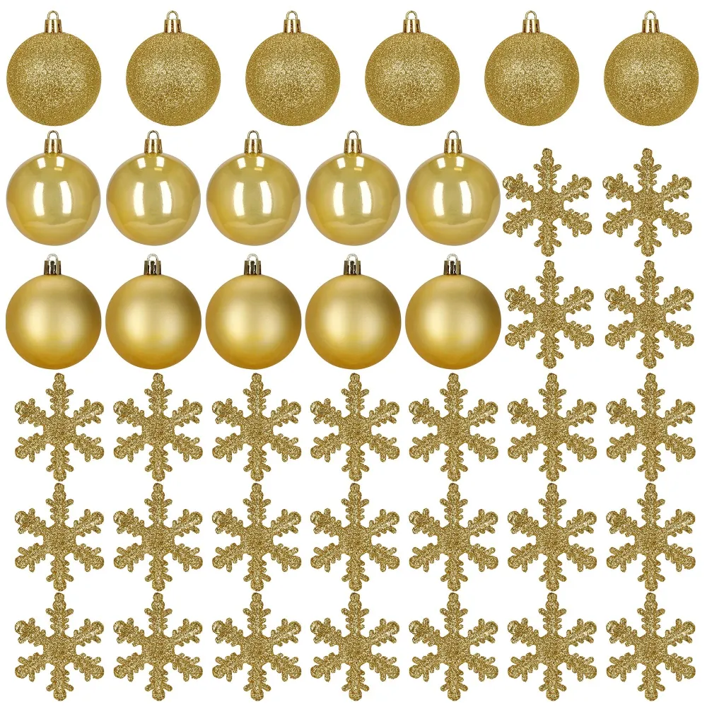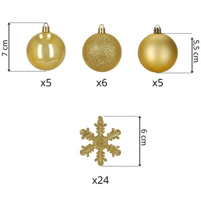 Luxusná sada zlatých vianočných ozdôb v lesklom, matnom i trblietavom prevedení dodá dekorácii slávnostný vzhľad. Obsahuje ľahké, nerozbitné plastové gule aj dekoratívne vločky, všetko s pútkami pre ľahké zavesenie. Skvelé na stromček aj na výzdobu interiéru či exteriéru. Priemer gulí je 5,5 cm.