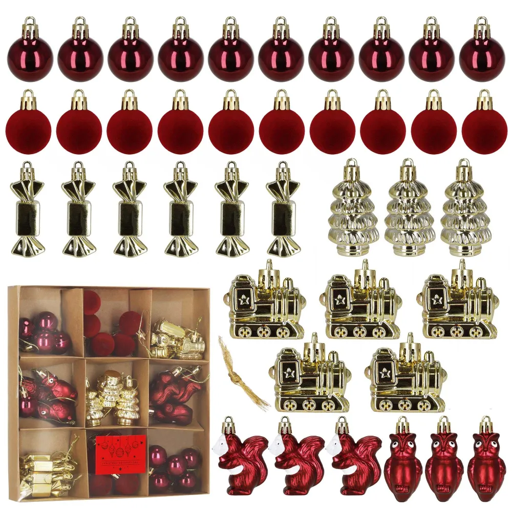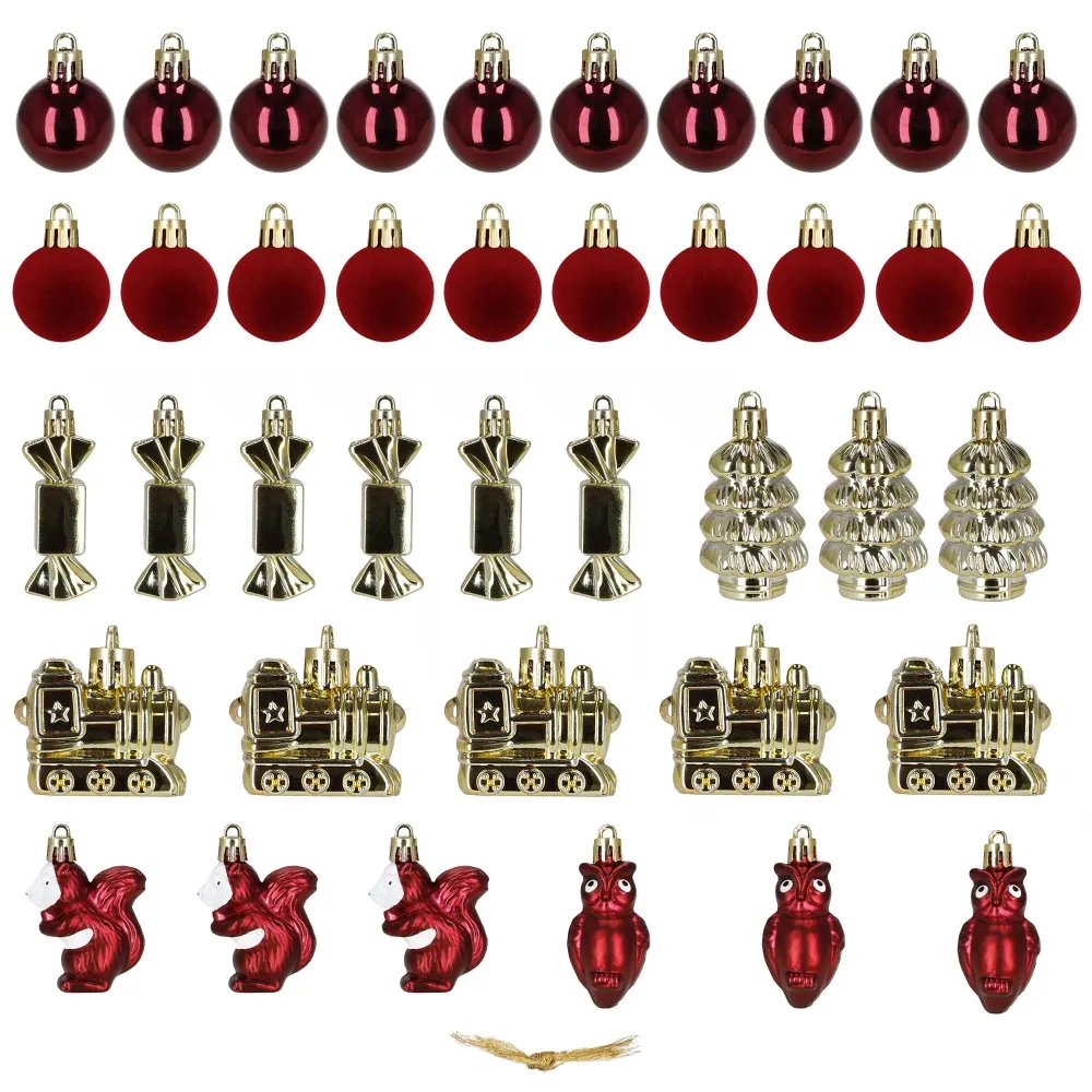 Vianočné banky červeno-zlatej mix - sada 41 ks prinášajú tradičnú, hrejivú a slávnostnú atmosféru, ktorá dokonale doplní vianočnú výzdobu v každom domove. Súprava zahŕňa širokú škálu ozdôb – od klasických gulí v lesklom, matnom a zamatovom prevedení až po originálne tematické tvary ako vláčiky, figúrky či stromčeky. Všetky ozdoby sú vyrobené z nerozbitného plastového materiálu , ktorý je ľahký, odolný a bezpečný aj pre domácnosti s deťmi či miláčikmi. Ku každému kusu patrí praktické pútko na zavesenie , vďaka čomu je dekorovanie jednoduché a rýchle.