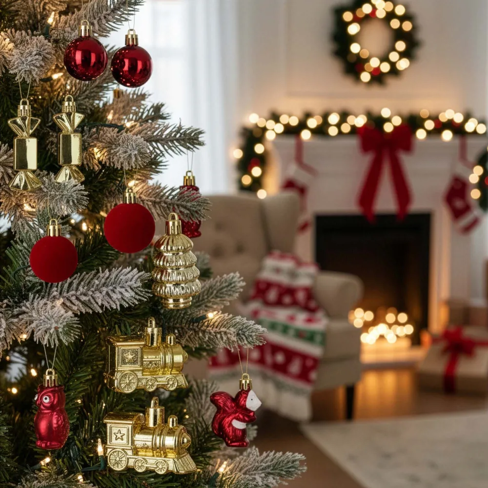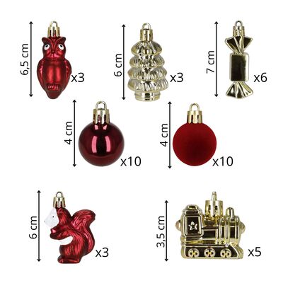 Sada červeno-zlatých vianočných ozdôb v rôznych tvaroch a veľkostiach dodá výzdobe tradičný, teplý a slávnostný vzhľad. Obsahuje ľahké, nerozbitné plastové gule aj tematické ozdoby s pútkami pre ľahké zavesenie. Ideálna na stromček aj ako dekorácia v interiéri či exteriéri. Mix priemerov a veľkostí.