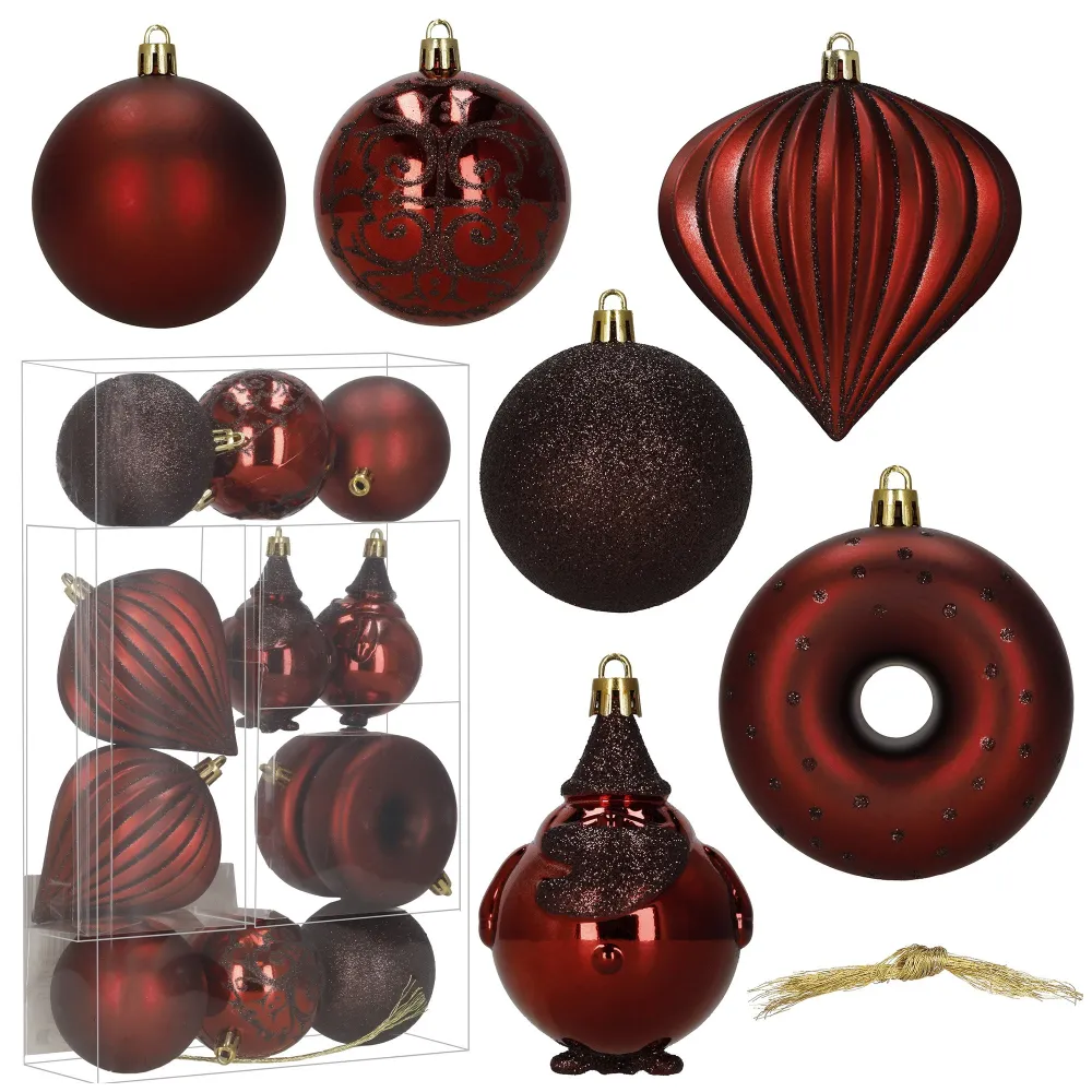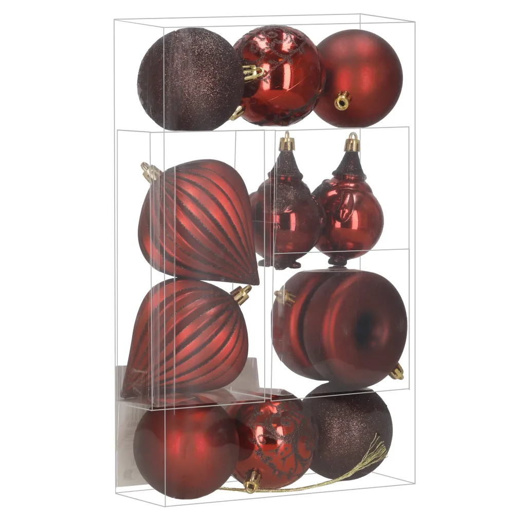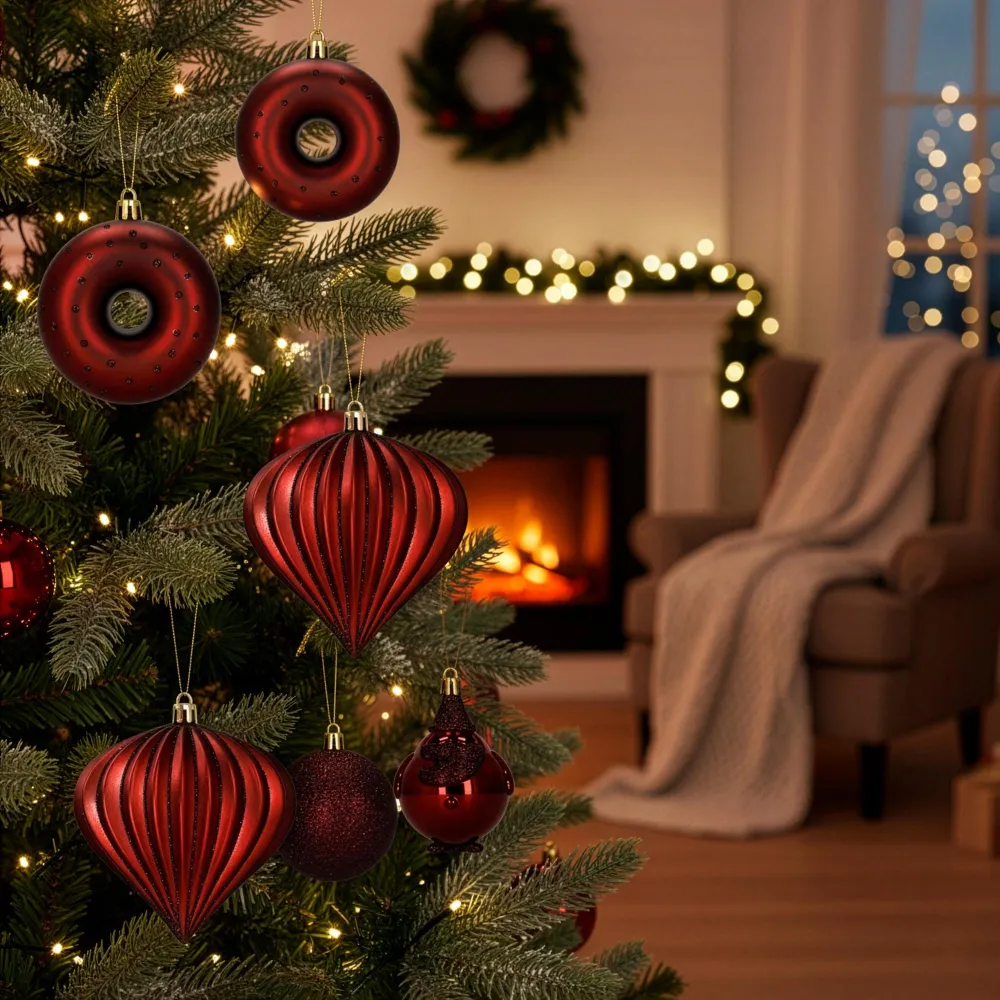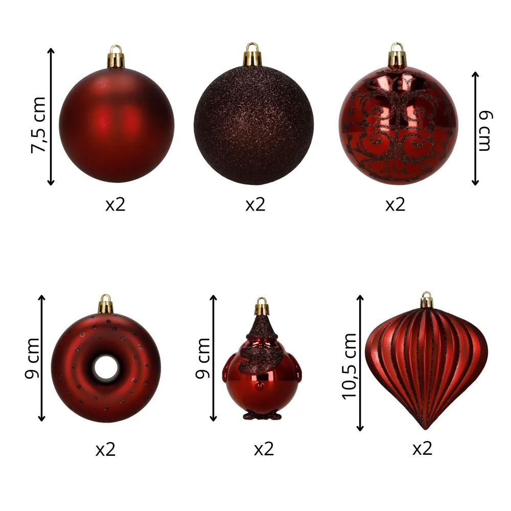 Táto sada červených vianočných ozdôb v rôznych tvaroch a veľkostiach dodá vašej výzdobe jedinečný charakter. Ozdoby sú ideálne na stromček aj do sviatočných aranžmánov. Vyrobené z nerozbitného plastového materiálu a vybavené pútkami na jednoduché zavesenie. Vhodné pre vnútorné aj vonkajšie použitie. Veľkosti priemerov: 6 cm, 7,5 cm a 9 cm. Celkom 12 kusov.