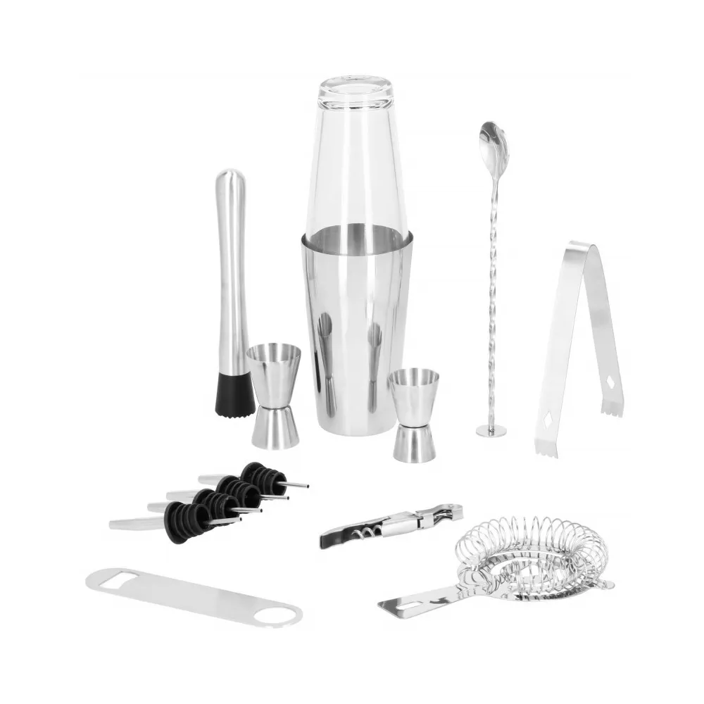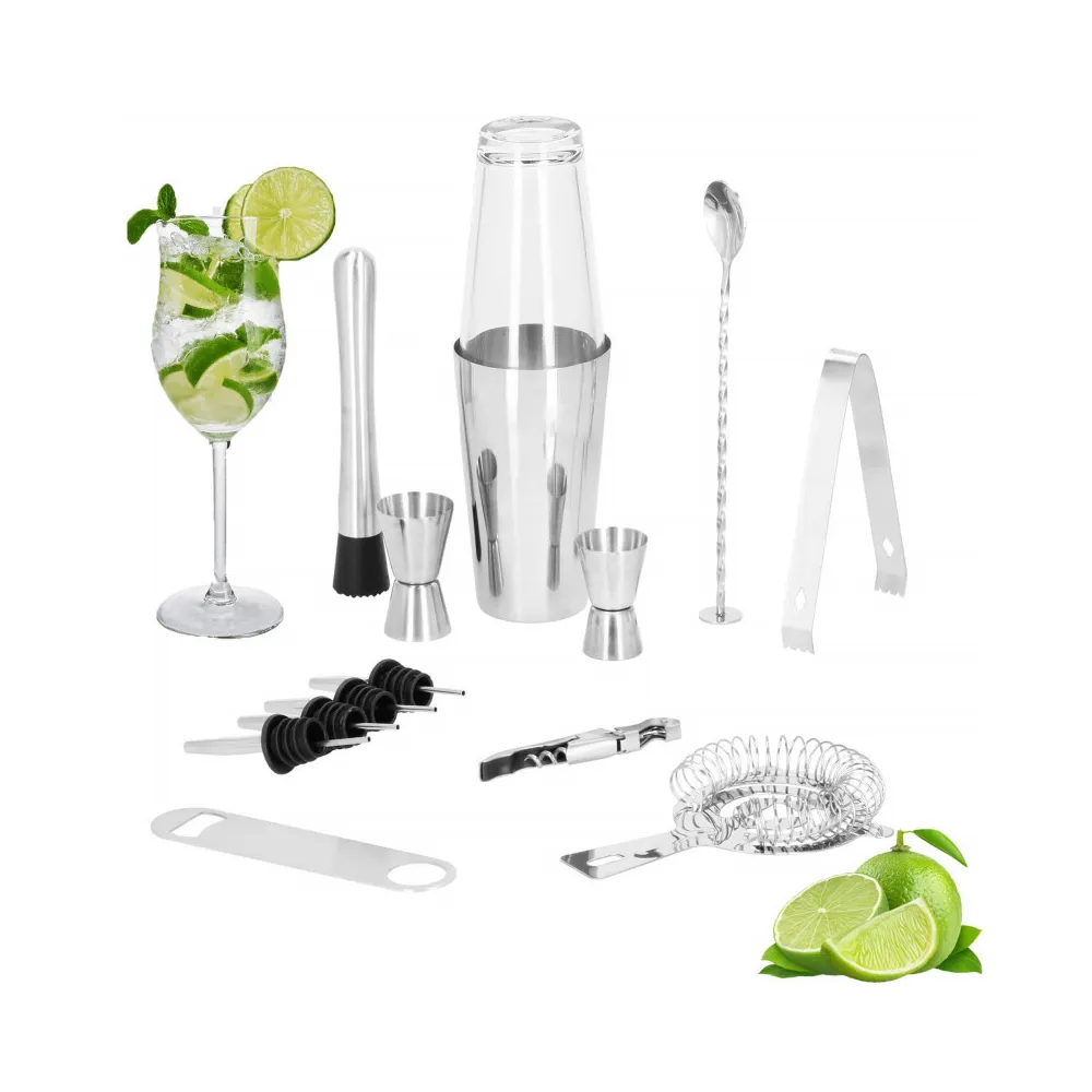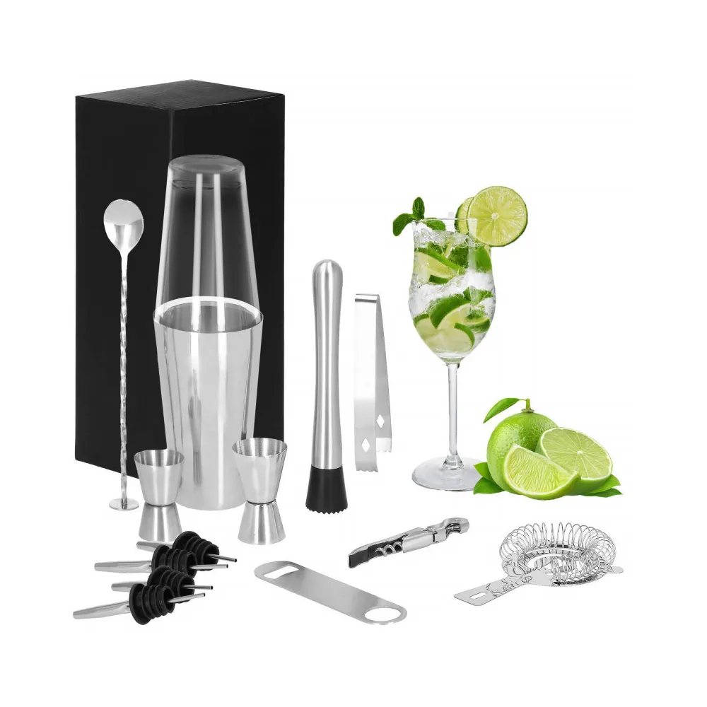 Profesionálna sada na prípravu drinkov, ktorá obsahuje 14 dielov. Nerezová oceľ, certifikovaný materiál na prácu s potravinami. Kvalitné spracovanie, elegantný povrch. Zlepšuje barmanské zručnosti. Rozširuje možnosti prípravy koktailov. Kompletný set na pre každú oslavu.