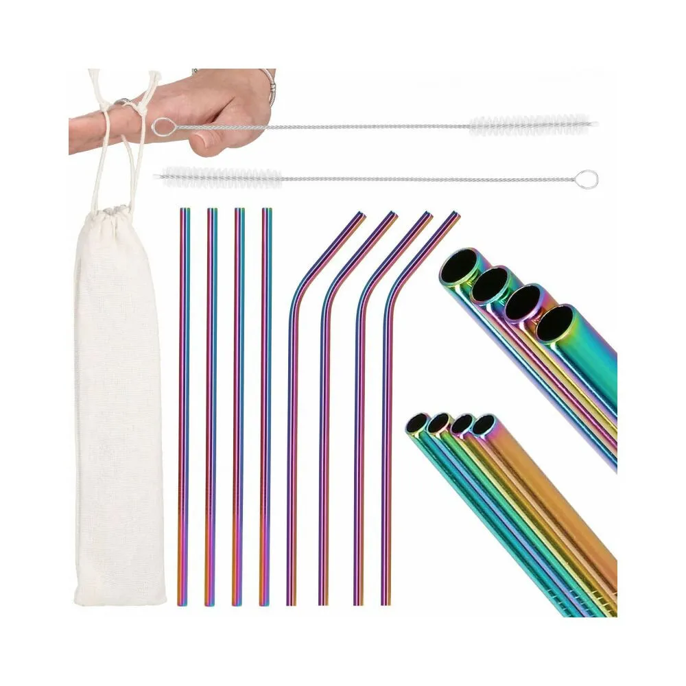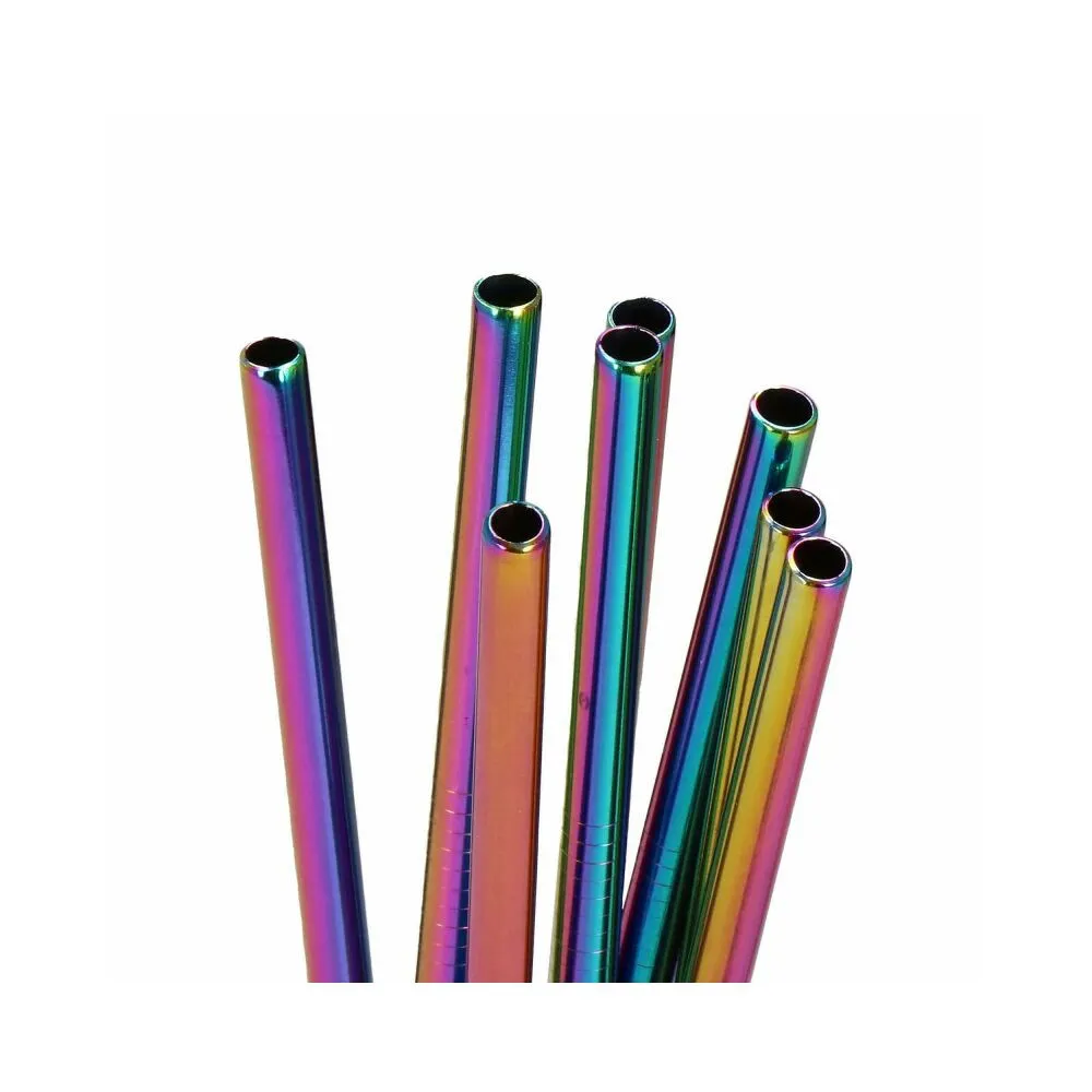 Sada 8ks kovových slamiek na miešané nápoje . Ekologická alternatíva. Zdravotne nezávadné, neobsahuje škodlivé látky. Odolná nerezová oceľ, dúhové farby. Dva druhy - zahnuté a rovné. V sade tiež 2 čistiace kefky a plátené puzdro s lemom. Vhodné aj na cesty.