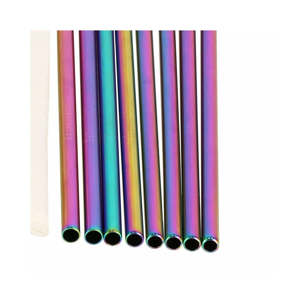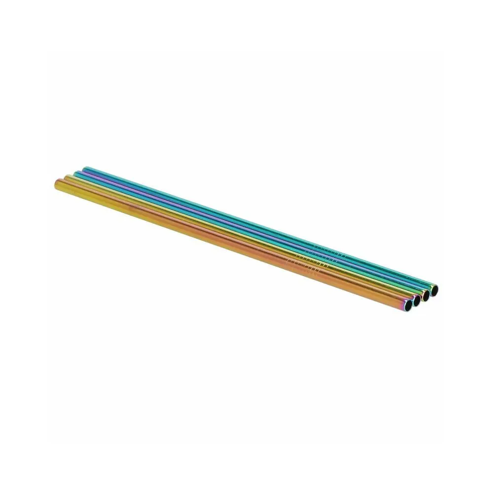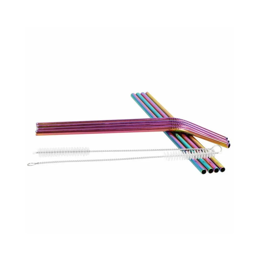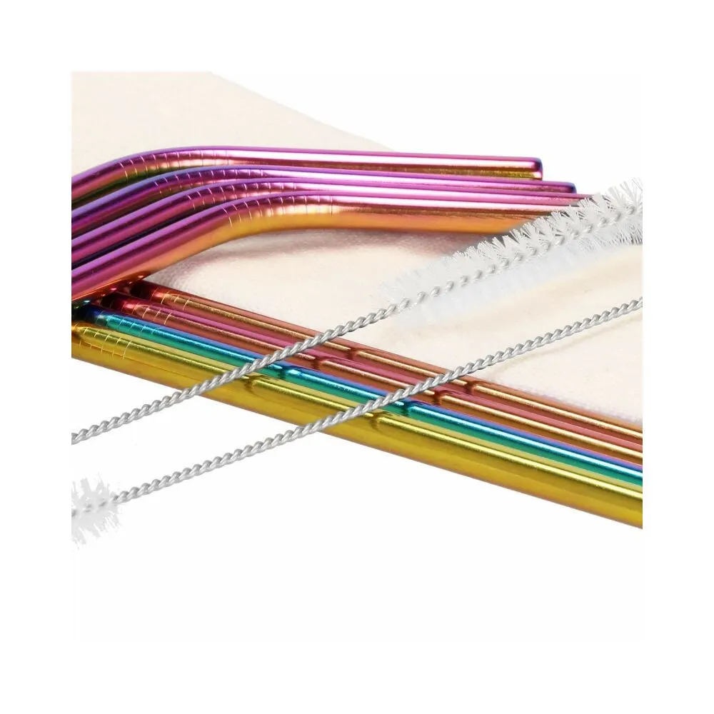 Sada 8ks kovových slamiek na miešané nápoje. Ekologická alternatíva. Zdravotne nezávadné, neobsahuje škodlivé látky. Odolná nerezová oceľ, dúhové farby. Dva druhy - zahnuté a rovné. V sade tiež 2 čistiace kefky a plátené puzdro s lemom. Vhodné aj na cesty.