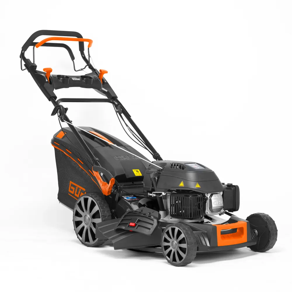 Najštýlovejšia kosačka s pojazdom zo série PREMIUM 2020 značky Güde so záberom 480 mm, centrálnym nastavením výšky kosenia, mulčovacím nožom, mulčovacou záslepkou a bočným vyhadzovaním. zvýšenie pohodlia pri práci dopomáhajú veľké kolieska uložené na ložiskách, ktoré majú puklice z oboch strán, čím sa zabráni zachytávaniu pokosenej trávy do kolies a následnému problému s čistením. Zároveň však zostávajú štýlové a dopĺňajú celkový dojem kosačiek. vrátane náhonového remeňa. Čistenie noža a vnútornej časti skeletu je jednoduché vďaka rýchlospojke na pripojenie záhradnej hadice.