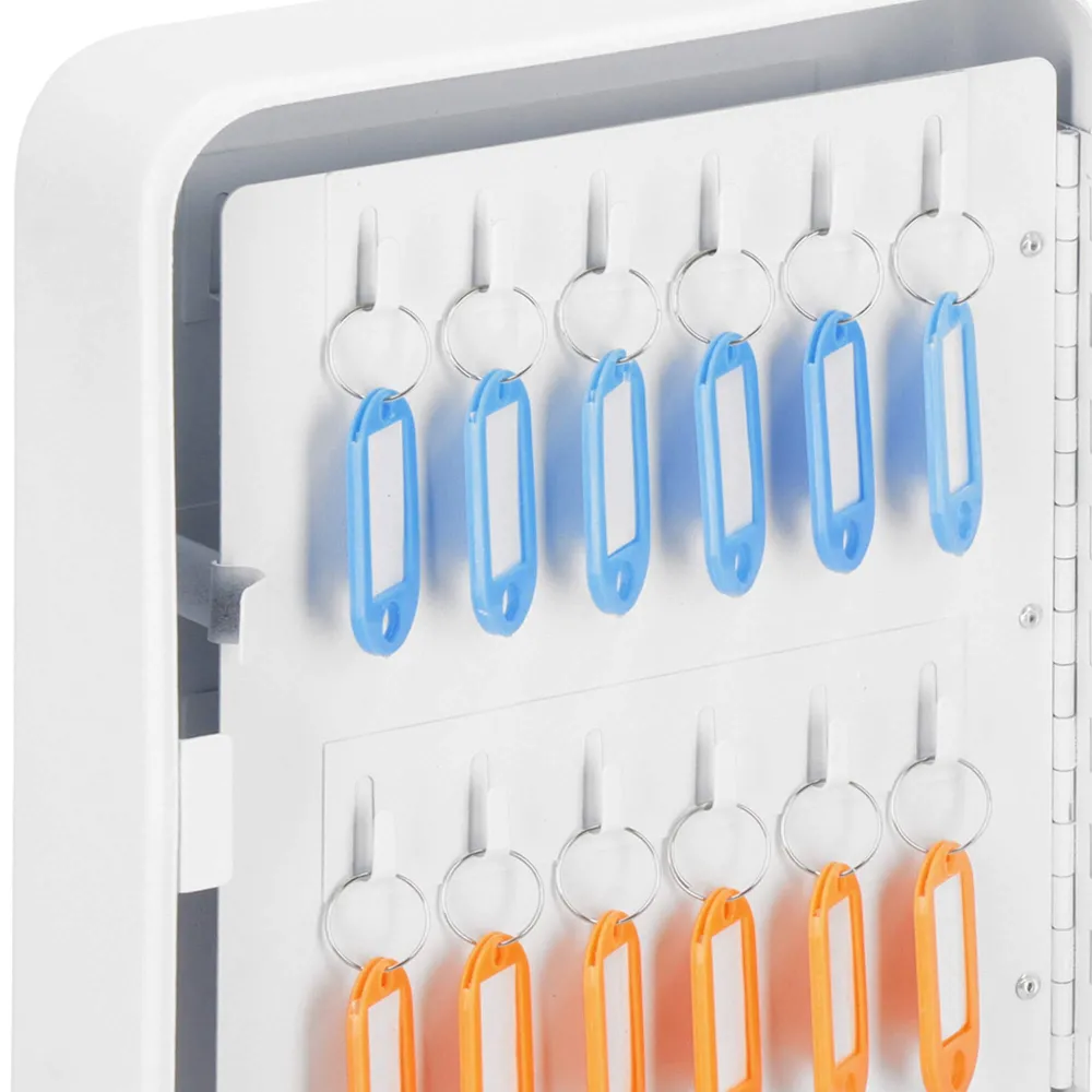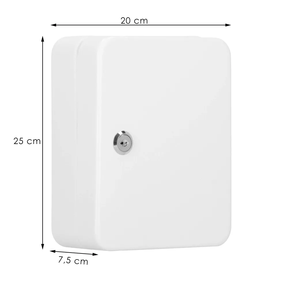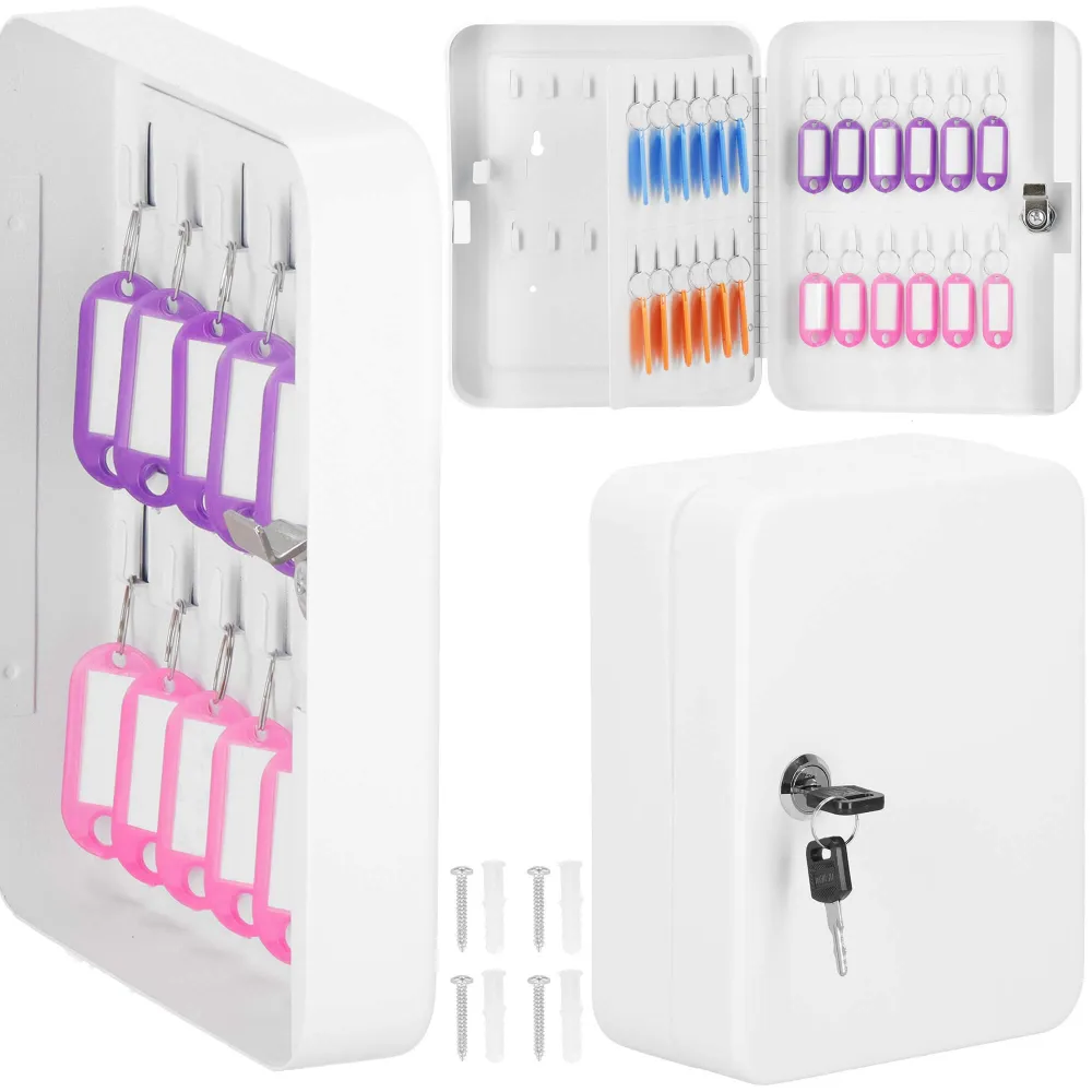 Uzamykateľná schránka na kľúče, ktorú ľahko zavesíte na stenu. Vyrobené z odolných materiálov, má silné steny. Predchystané otvory na zadnej strane umožňujú zavesenie na stenu. 48 háčikov na kľúče. Súčasťou tiež 48 príveskov na kľúče pre ľahšiu orientáciu. Bude sa hodiť v každej domácnosti, kancelárii, škole, vrátnici alebo šatni.
