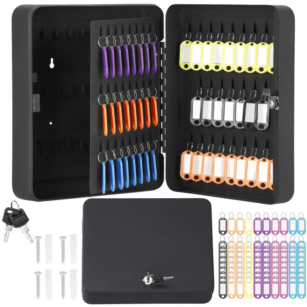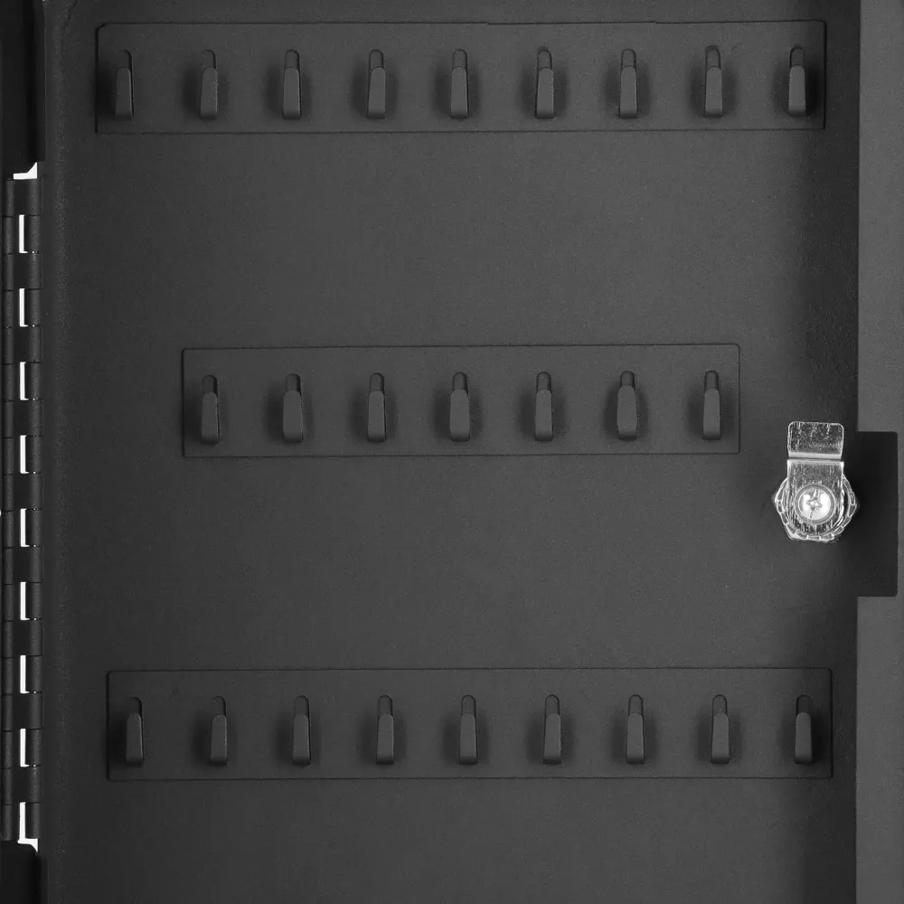 Uzamykateľná schránka na kľúče, ktorú ľahko zavesíte na stenu. Vyrobené z odolných materiálov, má silné steny. Predchystané otvory na zadnej strane umožňujú zavesenie na stenu. 100 háčikov na kľúče. Súčasťou tiež 100 príveskov na kľúče pre ľahšiu orientáciu. Bude sa hodiť v každej domácnosti, kancelárii, škole, vrátnici alebo šatni.