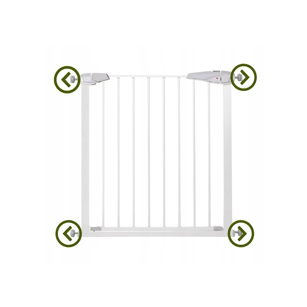 Robustná kovová zábrana je vybavená celou bezpečnostnými prvkami, ktoré v maximálnej možnej miere prispievajú k ochrane vašich detí. K hlavným prvkom bezpečnosti bezpochyby patrí poistka proti otvoreniu alebo automatický systém zatvárania dvierok. Riziko úrazu ďalej významne elimujú zaoblené hrany alebo špeciálne navrhnuté oválne tvary, ktoré zamedzujú dieťaťu kamkoľvek zasúvať a zvierať prsty. Ojedinelou funkciou je blokácia zatvárania dvierok, tá sa aktivuje pri ich otvorení pod uhlom viac ako 90 stupňov, tak aby sa zabránilo ich nekotrolovanému zatvoreniu.