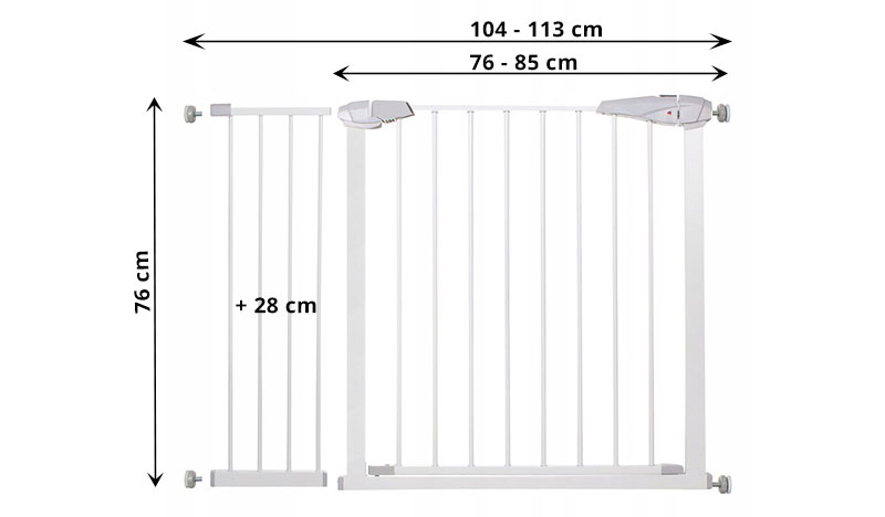 Kvalitná kovová bezpečnostná zábrana s rozširujúcim modulom, vhodná pre otvory s rozmermi 76 – 85 cm a 104 – 113 cm. Spoľahlivá ochrana častí domu pred nekontrolovateľným vstupom detí alebo zvierat. Jednoducho nastaviteľná s radom bezpečnostných prvkov zvyšujúcich stupeň ochrany. Certifikácia podľa EN 1930:2011.