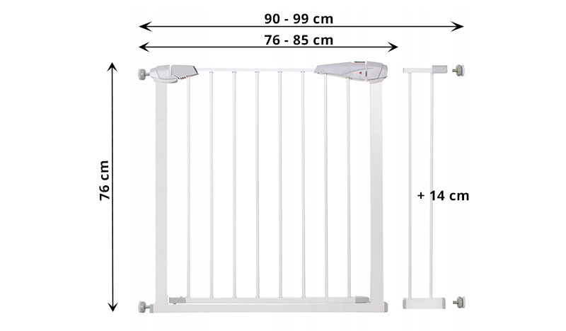 Kvalitná kovová bezpečnostná zábrana s rozširujúcim modulom, vhodná pre otvory s rozmermi 76 – 85 cm a 90 – 99 cm. Spoľahlivá ochrana častí domu pred nekontrolovateľným vstupom detí alebo zvierat. Jednoducho nastaviteľná s radom bezpečnostných prvkov zvyšujúcich stupeň ochrany. Certifikácia podľa EN 1930:2011.