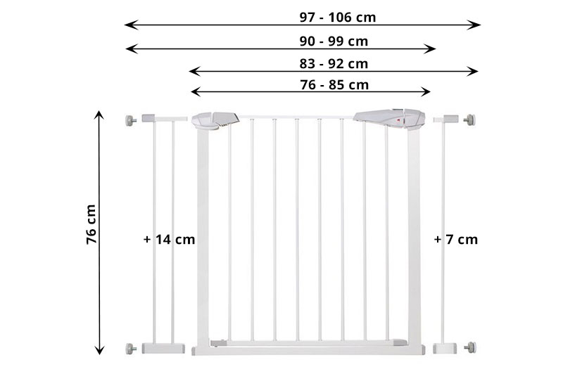 Kvalitná kovová bezpečnostná zábrana s rozširujúcimi modulmi, vhodná pre otvory s rozmermi 76 – 106 cm. Spoľahlivá ochrana častí domu pred nekontrolovateľným vstupom detí alebo zvierat. Jednoducho nastaviteľná s radom bezpečnostných prvkov zvyšujúcich stupeň ochrany. Certifikácia podľa EN 1930:2011.