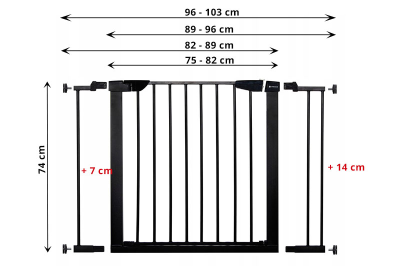 Kvalitná kovová bezpečnostná zábrana s rozširujúcimi modulmi, vhodná pre otvory s rozmermi 75 - 103 cm. Spoľahlivá ochrana častí domu pred nekontrolovateľným vstupom detí alebo zvierat. Jednoducho nastaviteľná s radom bezpečnostných prvkov zvyšujúcich stupeň ochrany. Certifikácia podľa ASTMF1004-13 / EN 1930:2011.