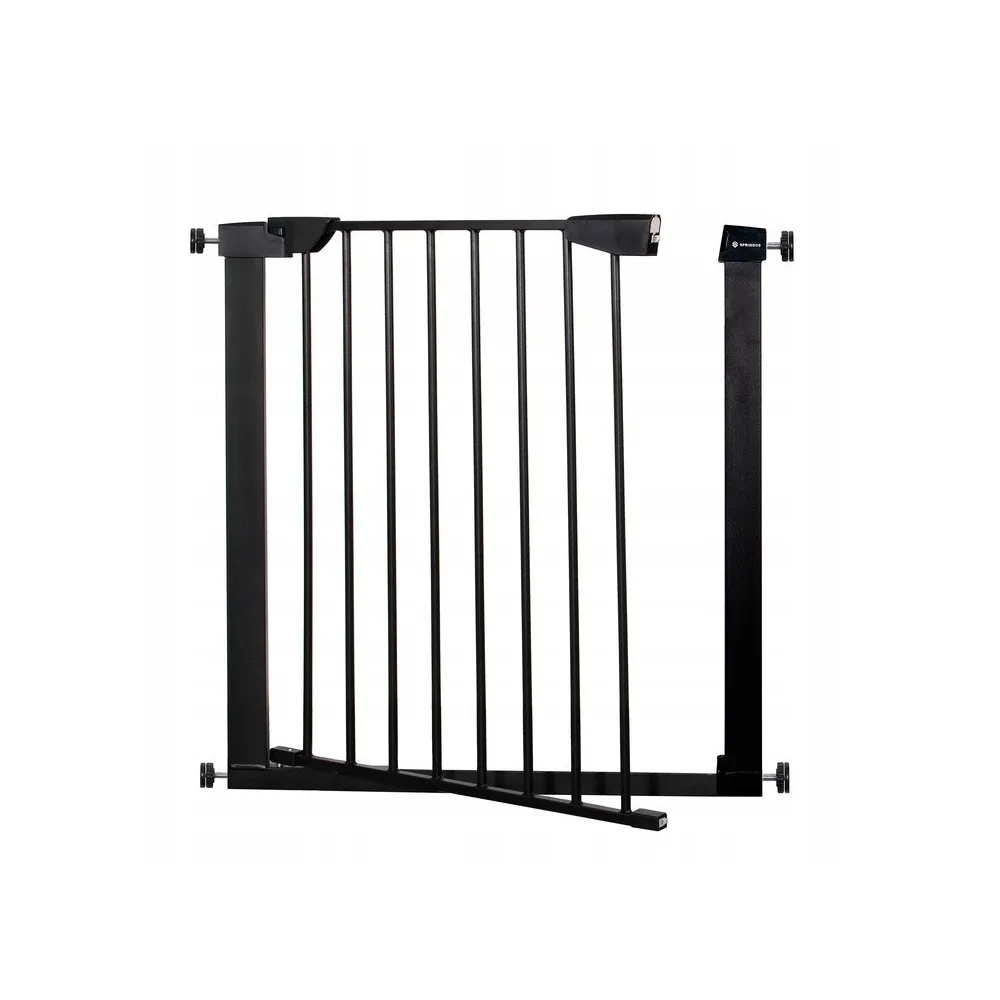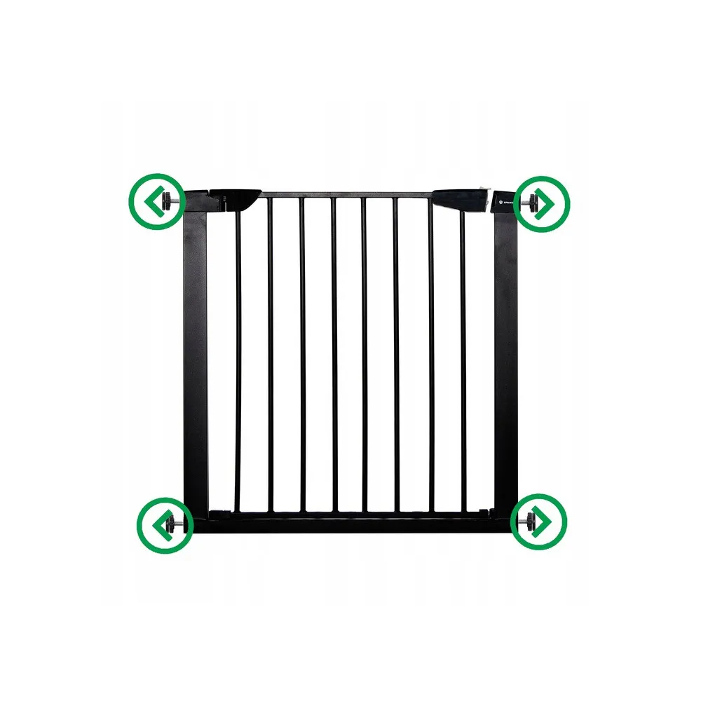 Robustná kovová zábrana je vybavená celou bezpečnostnými prvkami, ktoré v maximálnej možnej miere prispievajú k ochrane vašich detí. K hlavným prvkom bezpečnosti bezpochyby patrí poistka proti otvoreniu alebo automatický systém zatvárania dvierok. Riziko úrazu ďalej významne elimujú zaoblené hrany alebo špeciálne navrhnuté oválne tvary, ktoré zamedzujú dieťaťu kamkoľvek zasúvať a zvierať prsty. Ojedinelou funkciou je blokácia zatvárania dvierok, tá sa aktivuje pri ich otvorení pod uhlom viac ako 90 stupňov, tak aby sa zabránilo ich nekotrolovanému zatvoreniu.