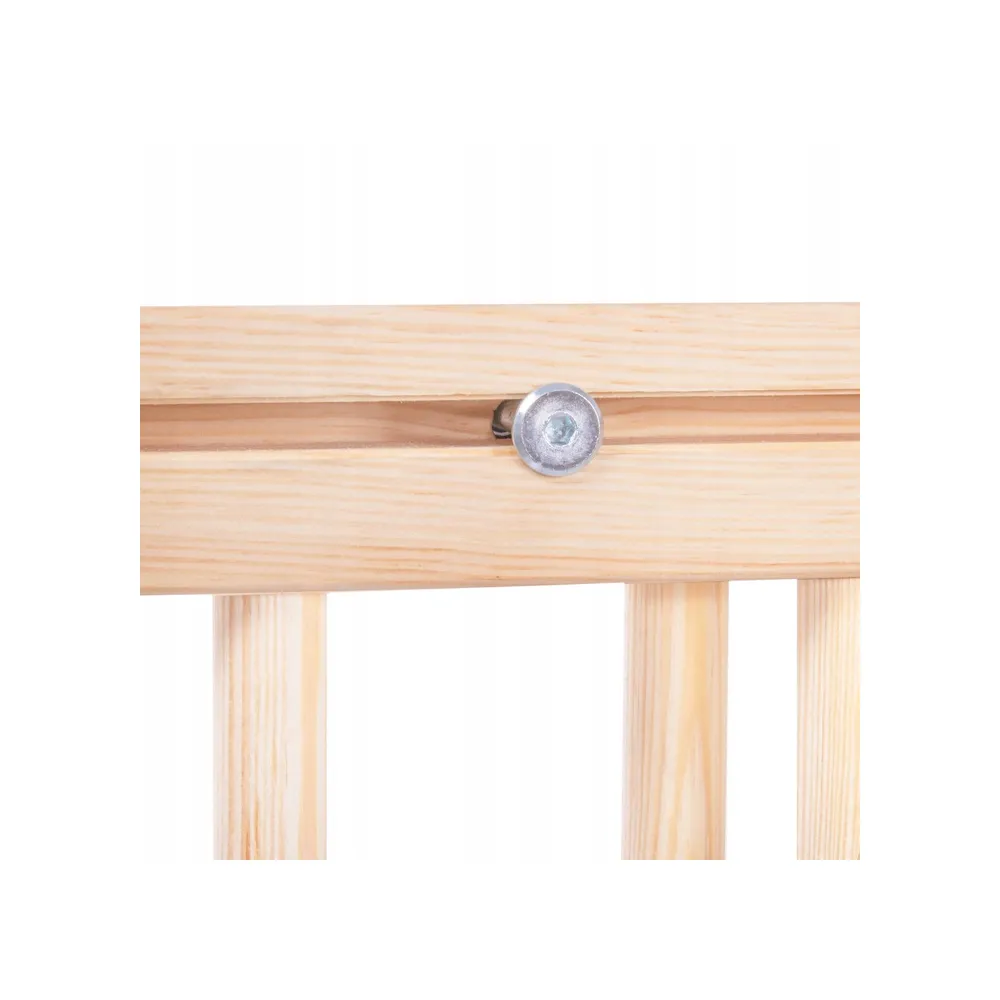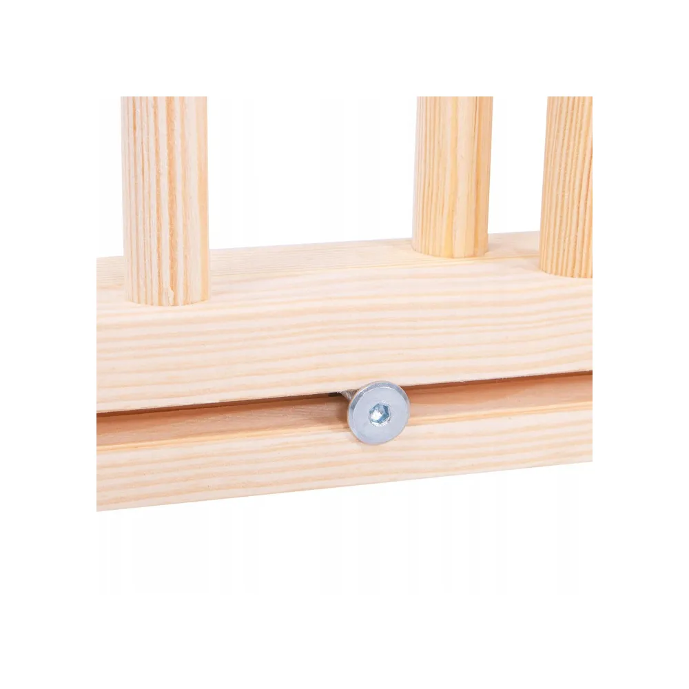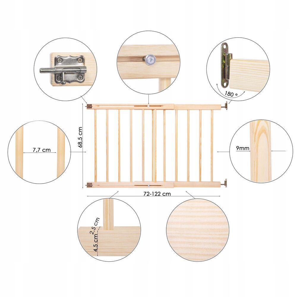 Zábrana je vyrobená z masívneho borovicového dreva s precízne zabrúsenými hranami. Vďaka plynule nastaviteľnému systému uchytenia sa hodí takmer pre akýkoľvek otvor s rozmermi 77-122 cm . Zábranu je možné upevniť ako medzi dva pevné body, napr. do rámu dverí, tak aj na vonkajšiu alebo vnútornú stenu. Sama montáž je veľmi jednoduchá a intuitívna . Všetok spojovací materiál je súčasťou balenia.