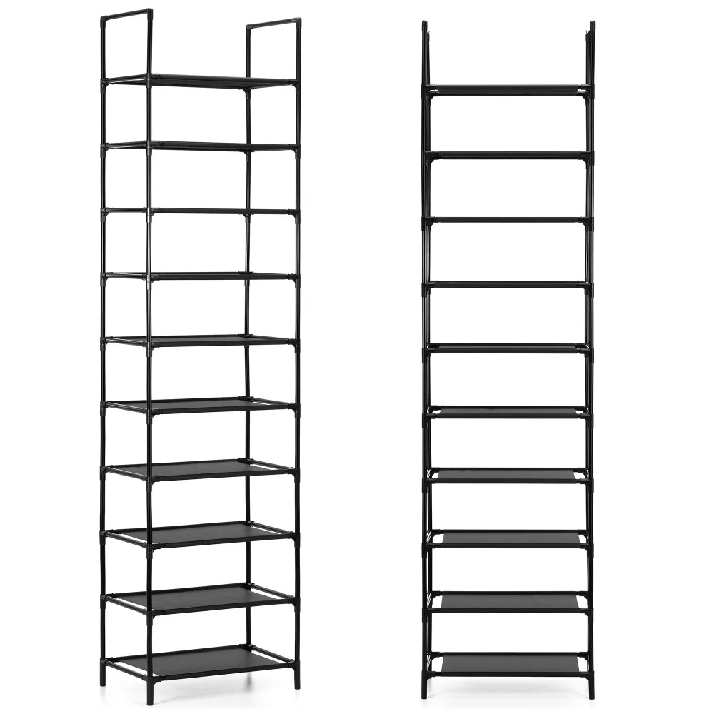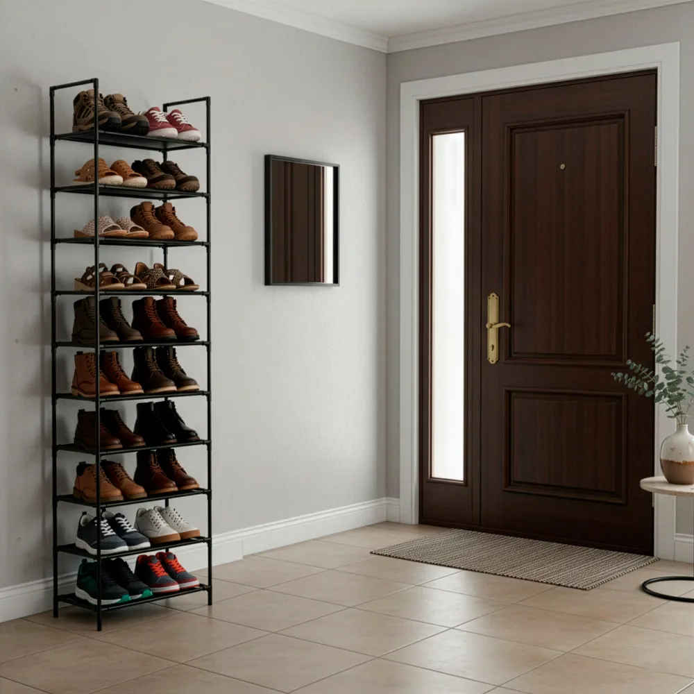 Kovový botník 10 políc SPRINGOS HA7550 čierny je praktickým riešením pre prehľadné uloženie veľkého množstva obuvi v predsieni, chodbe alebo šatni. Vďaka desiatim políciam ponúka dostatok priestoru pre každodenné aj sezónne topánky celej rodiny. Vysoké a úzke prevedenie efektívne šetrí miesto a umožňuje využiť aj menšie priestory bez obmedzenia priechodu.