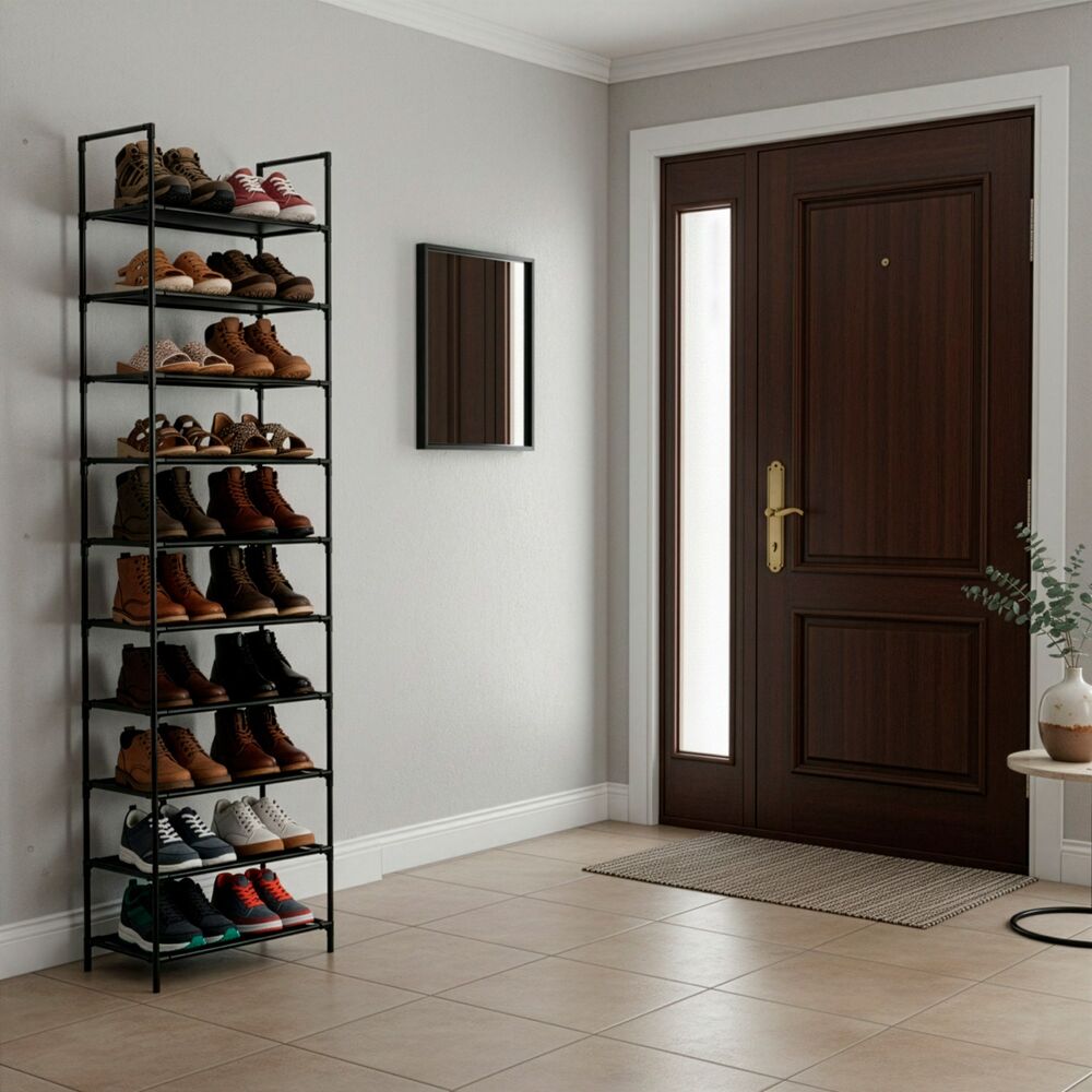 Vysoký kovový botník ponúka prehľadné a úsporné riešenie na uloženie väčšieho množstva obuvi. Desať políc poskytuje dostatok priestoru pre každodenné aj sezónne topánky, zatiaľ čo úzke prevedenie šetrí miesto v predsieni, šatni alebo chodbe. Pevná konštrukcia zaisťuje stabilitu a vysokú nosnosť, otvorený dizajn podporuje cirkuláciu vzduchu a ľahký prístup k obuvi.