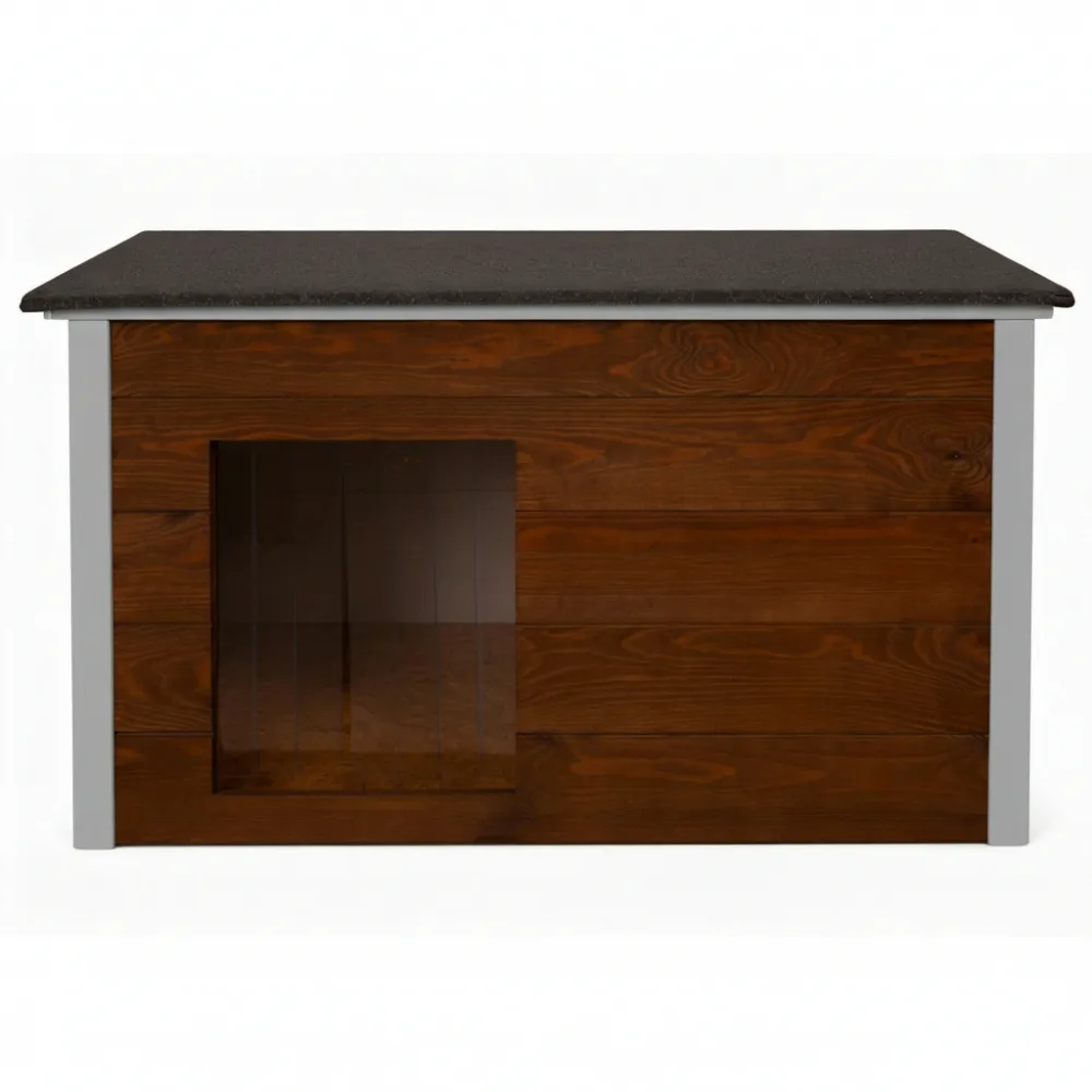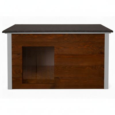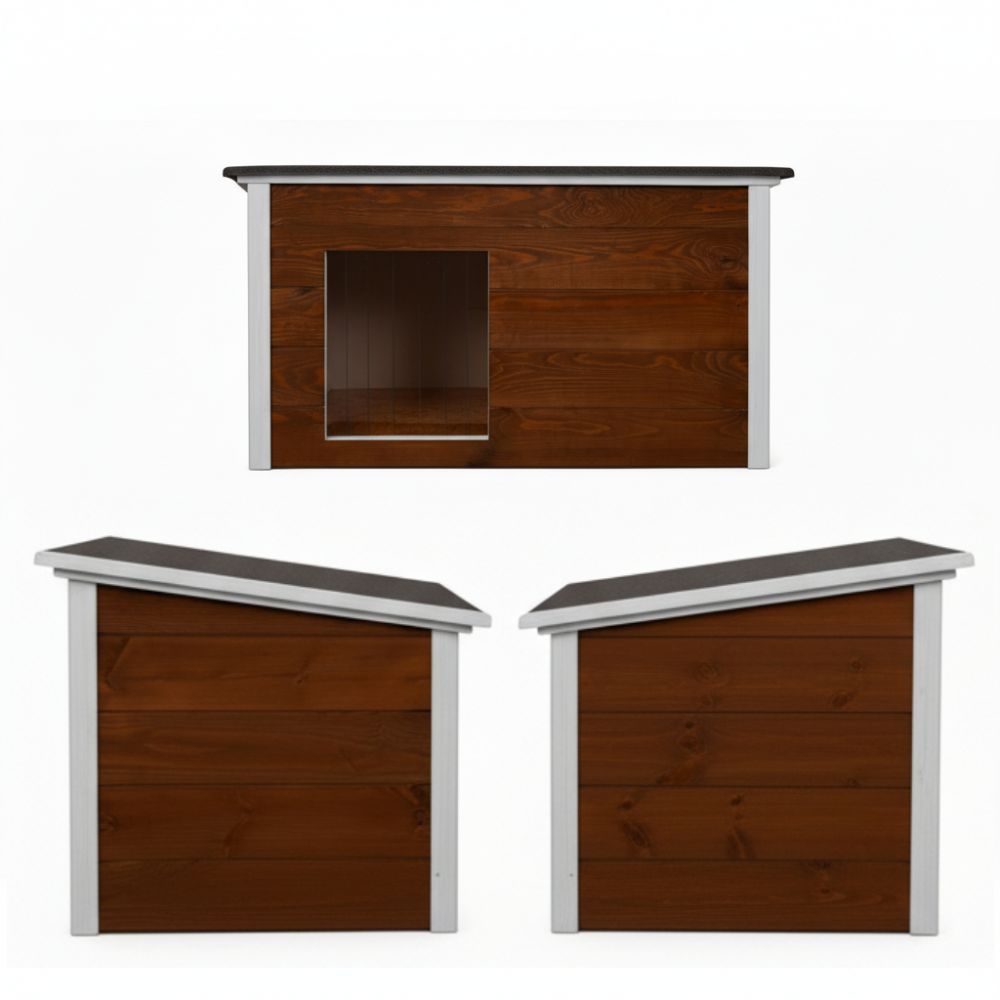 XL psie búda určená pre celoročné vonkajšie použitie. Drevená búda so sendvičovým zateplením zaisťuje tepelný komfort v každom počasí. Lamelový vchod obmedzuje prienik chladu a vetra. Šikmá vodeodolná strecha chráni pred dažďom aj snehom. Vyvýšená izolovaná podlaha zabraňuje vlhkosti od zeme a udržuje vnútorný priestor suchý a teplý. Celkové rozmery 106x72x67 cm, rozmery vstupu 36x41 cm.