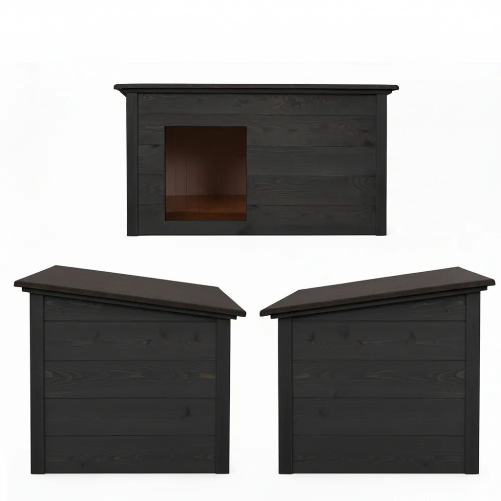 XL psie búda určená pre celoročné vonkajšie použitie. Drevená búda so sendvičovým zateplením zaisťuje tepelný komfort v každom počasí. Lamelový vchod obmedzuje prienik chladu a vetra. Šikmá vodeodolná strecha chráni pred dažďom aj snehom. Vyvýšená izolovaná podlaha zabraňuje vlhkosti od zeme a udržuje vnútorný priestor suchý a teplý. Celkové rozmery 106x72x67 cm, rozmery vstupu 36x41 cm.