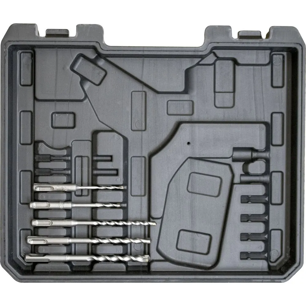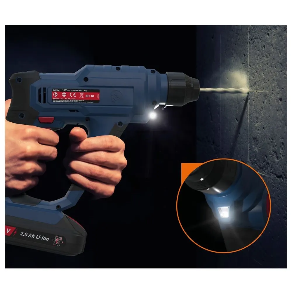 Akumulátorové búracie kladivo zo série akumulátorového náradia 18V E3. Búracie práce (s použitím príklepu) alebo vŕtanie (bez použitia príklepu). Možnosť vypnutia príklepu pri vŕtaní do dreva alebo do kovu. Rýchloupínacie skľučovadlo SDS plus na výmenu vrtákov bez použitia náradia. Regulácia otáčok. Poistka proti preťaženiu. Ľahký a kompaktný design. Pravo/ľavotočivý chod. Integrovaná LED pre osvetlenie pracovnej oblasti. Mäkká ergonomicky tvarovaná rukoväť na bezpečnú prácu. Akumulátor 18V/2,0 Ah s kontrolou jednotlivých článkov a ochranou proti preťaženiu, rýchlonabíjačka 3,0 A, 5 x SDS-plus vrták Ø 4/5/6/8/10 mm, kufrík s kovovými uzávermi.