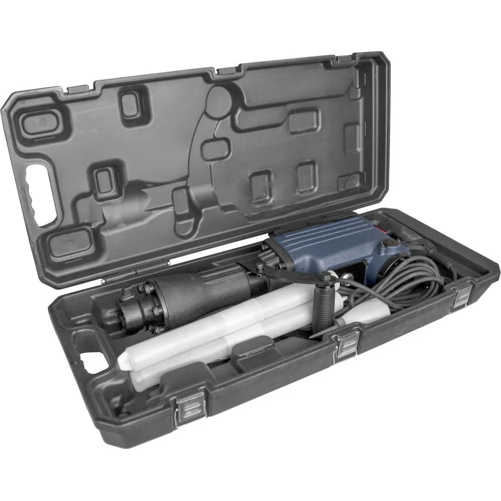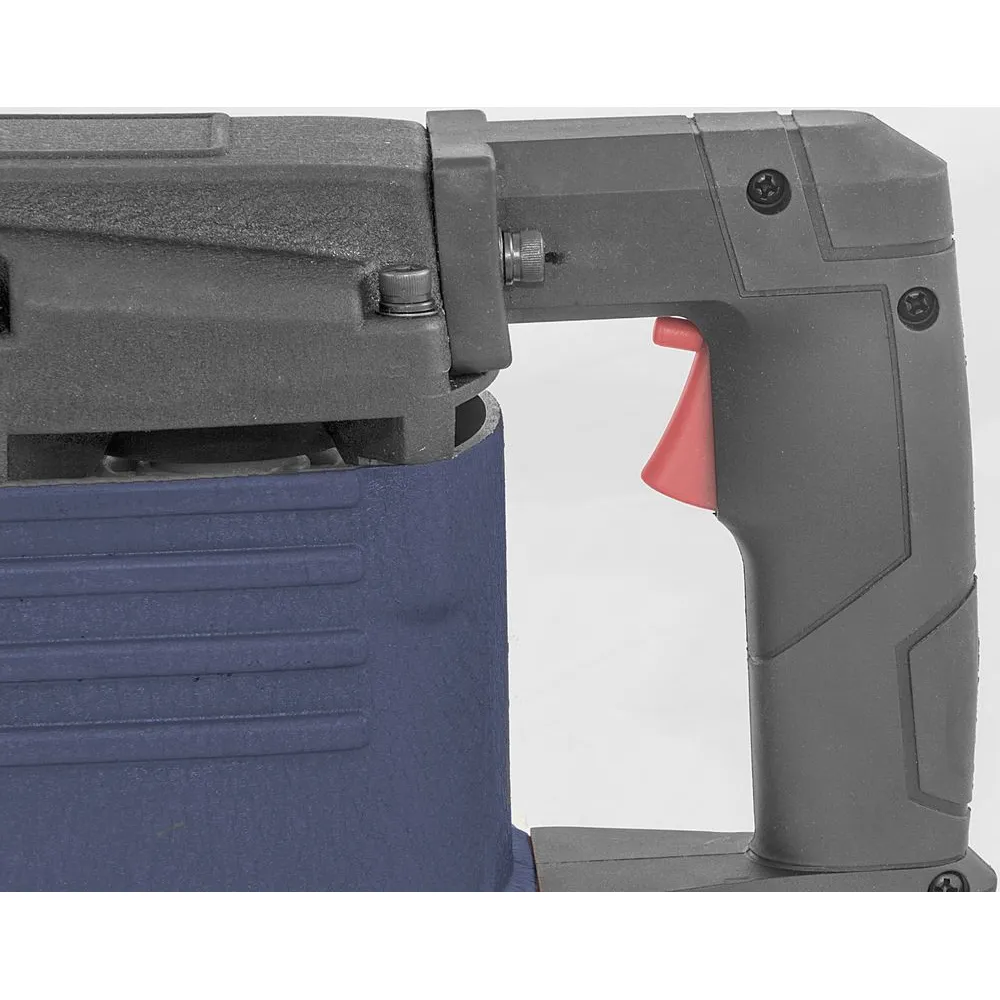 Sekacie kladivo s robustným kovovým puzdrom a ergonomicky tvarovanou prídavnou rukoväťou s tlmením vibrácií pre šetrnú prácu bez únavy. Na všetky materiály ako murivo, obkladačky, potery a podobne. S beznástrojovým držiakom dláta je výmena sekáčov bleskurýchla, 30 mm šesťhranný držiak nástrojov. Uzamykateľný spínač pre nepretržitú prevádzku poskytuje ďalší pracovný komfort. Vysoko kvalitný gumový kábel s dĺžkou 5 m (H07RN-F) vám poskytuje čo najväčšiu mobilitu počas práce. Vrátane plochého a špicatého sekáča 400 mm, kľúča, nádoby na skladovanie oleja. Kvalitný prepravný kufor s kovovými prackami a pevnými kolieskami.