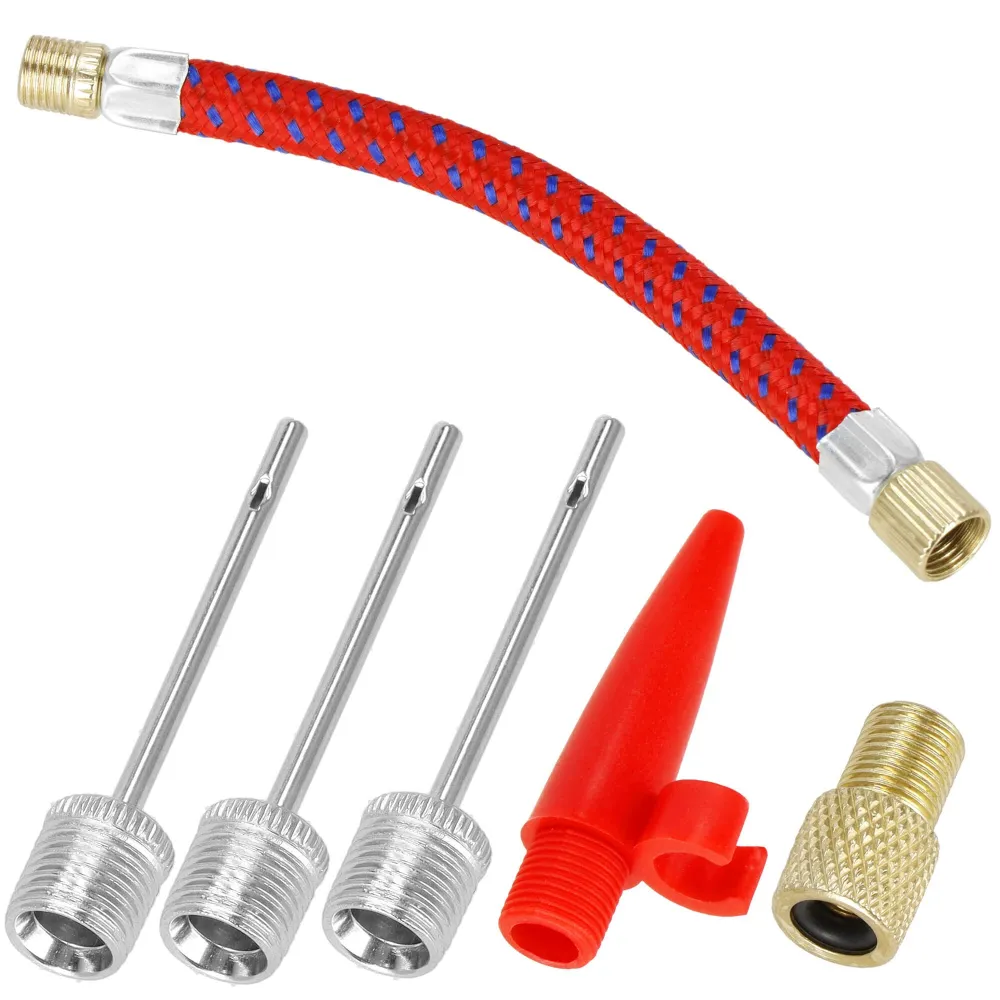 Súčasťou pumpičky je sada adaptérov , ktoré sa skrutkujú do výstupného konektora. Nájdete tu 3 ihly, 1 adaptér s červenou koncovkou, 1 FV/DV/AV adaptér a pletenú hadičku.