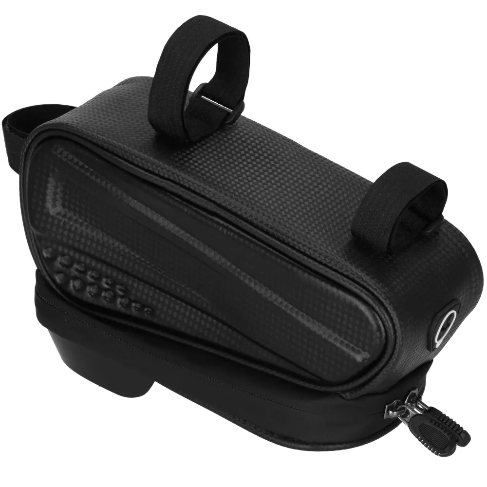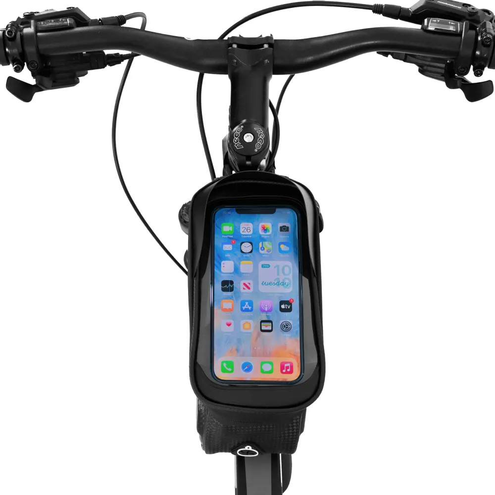 Vodeodolná taška na bicykel s priehľadným dotykovým panelom pre telefón. Umožňuje ľahké ovládanie mobilu počas jazdy, ponúka výstup na slúchadlá a hlavnú priehradku so zipsom. Kompaktná veľkosť pojme všetky nevyhnutnosti. Uchytenie na suchý zips zaisťuje bezpečné pripevnenie na každé koleso. Rozmery 23x10x13 cm (dšxv), panel pre telefón 16x8,5 cm.
