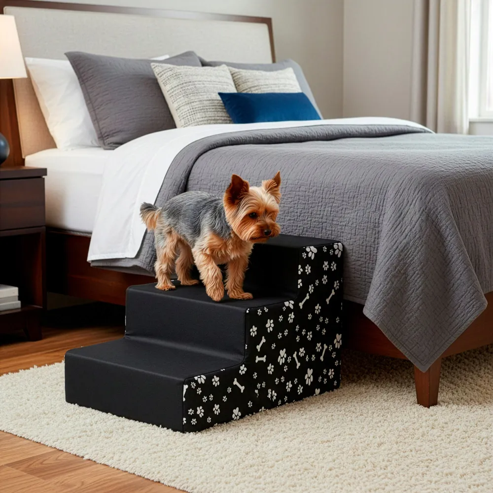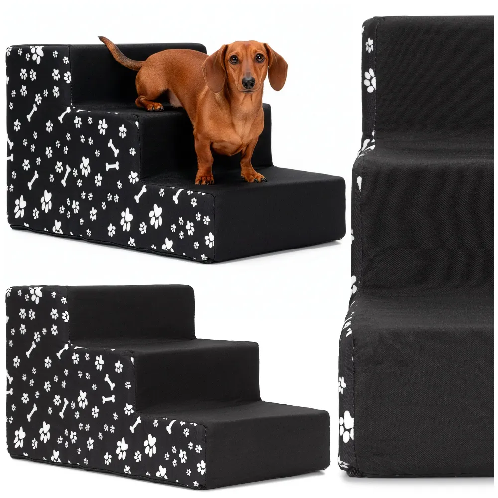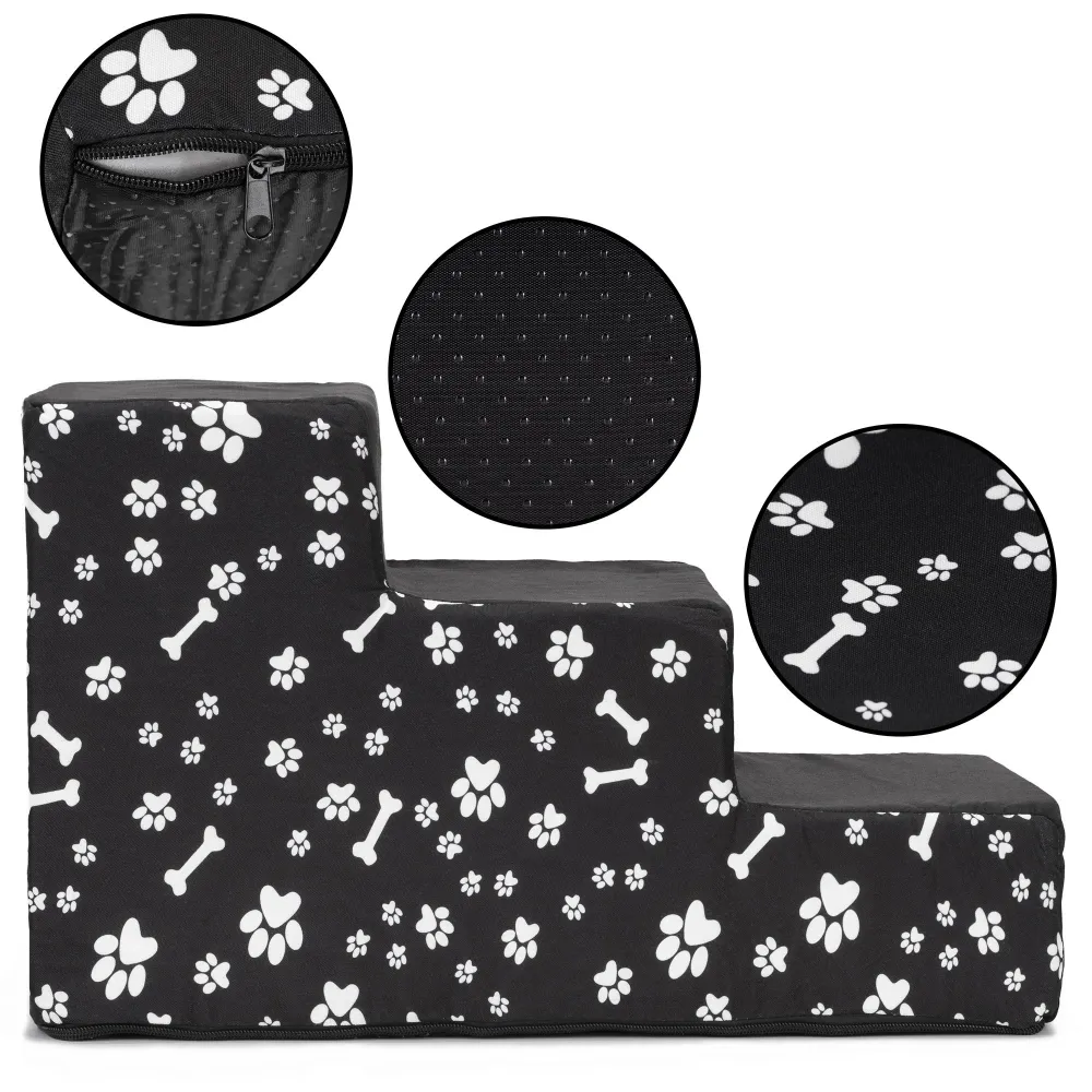 Praktické schodíky uľahčujú psom bezpečné nastupovanie do auta, na posteľ alebo gauč a pomáhajú šetriť ich kĺby. Tri stabilné schody poskytujú pohodlný prístup, zatiaľ čo protišmyková základňa zaisťuje stabilitu. Poťah z polyesteru je opatrený zipsom, možno ho ľahko sňať a prať v práčke. Pevná, ale ľahká konštrukcia má nosnosť až 25 kg a originálny vzor dodáva atraktívny vzhľad.