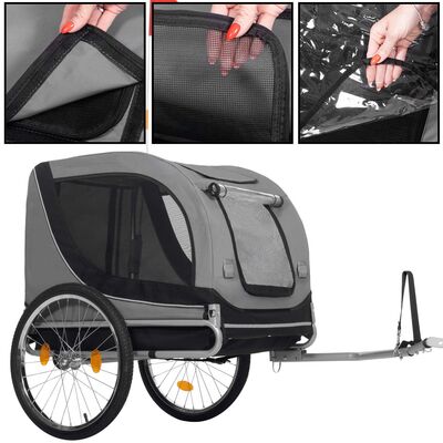 Vozík za bicykel pre psa ponúka vodeodolný materiál, ktorý ochráni vášho maznáčika za každého počasia. Má dva vstupy. Veľké okná z priedušnej sieťoviny a reflexné prvky zaisťujú bezpečie aj ventiláciu. Podlaha je vystužená a obsahuje kovové očko na pripevnenie vodidla. Kovové oje s pevným látkovým pásom umožňuje ľahké a bezpečné uchytenie k bicyklu. Tento vozík je spoľahlivý spoločník pre komfortné a bezpečné výlety s vašim psom v prírode.
