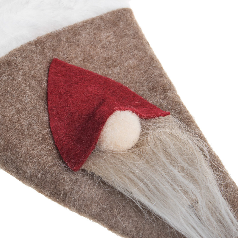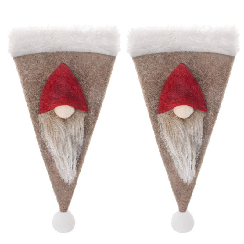Súprava dvoch obalov na príbory s motívom vianočnej čiapky so škriatok Gnomom. Plastický vzor škriatka, čiapka zakončená brmbolcom. Štýlová a elegantná dekorácia sviatočného stola. Rozmery 18x10 cm.