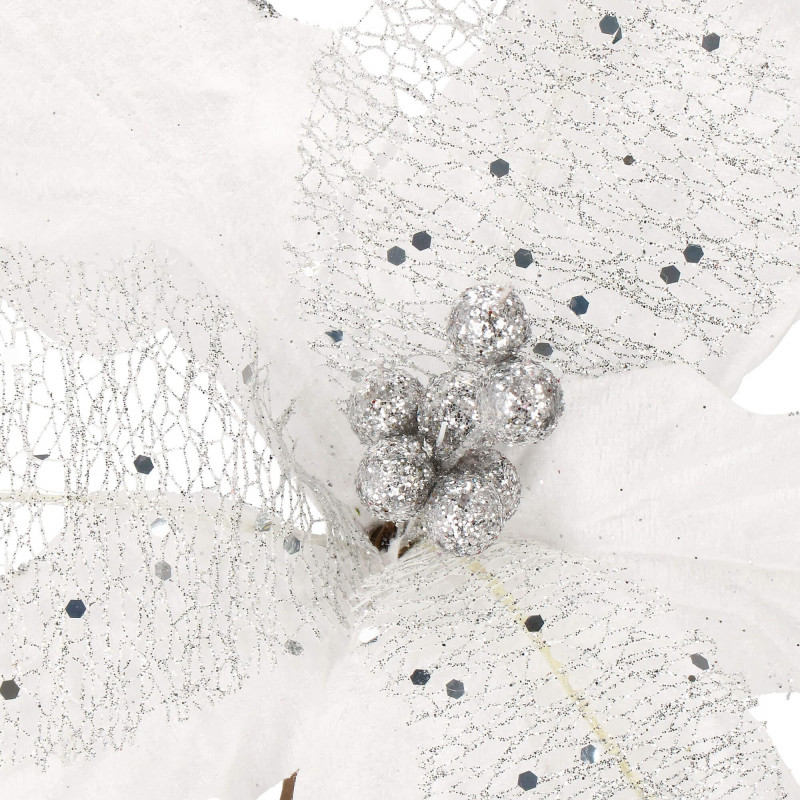Umelý kvet vianočnej ruže s ružovými okvetnými lístkami zdobenými trblietkami. Realistické spracovanie, ohybná stonka pre ľahké pripevnenie do...