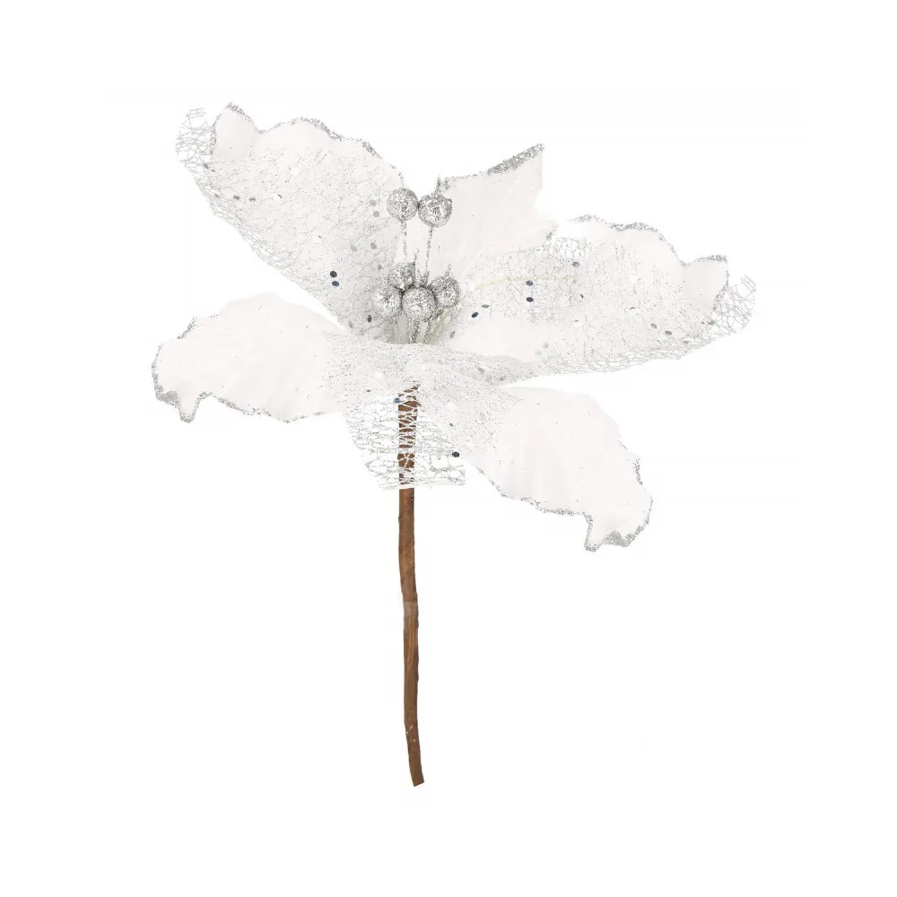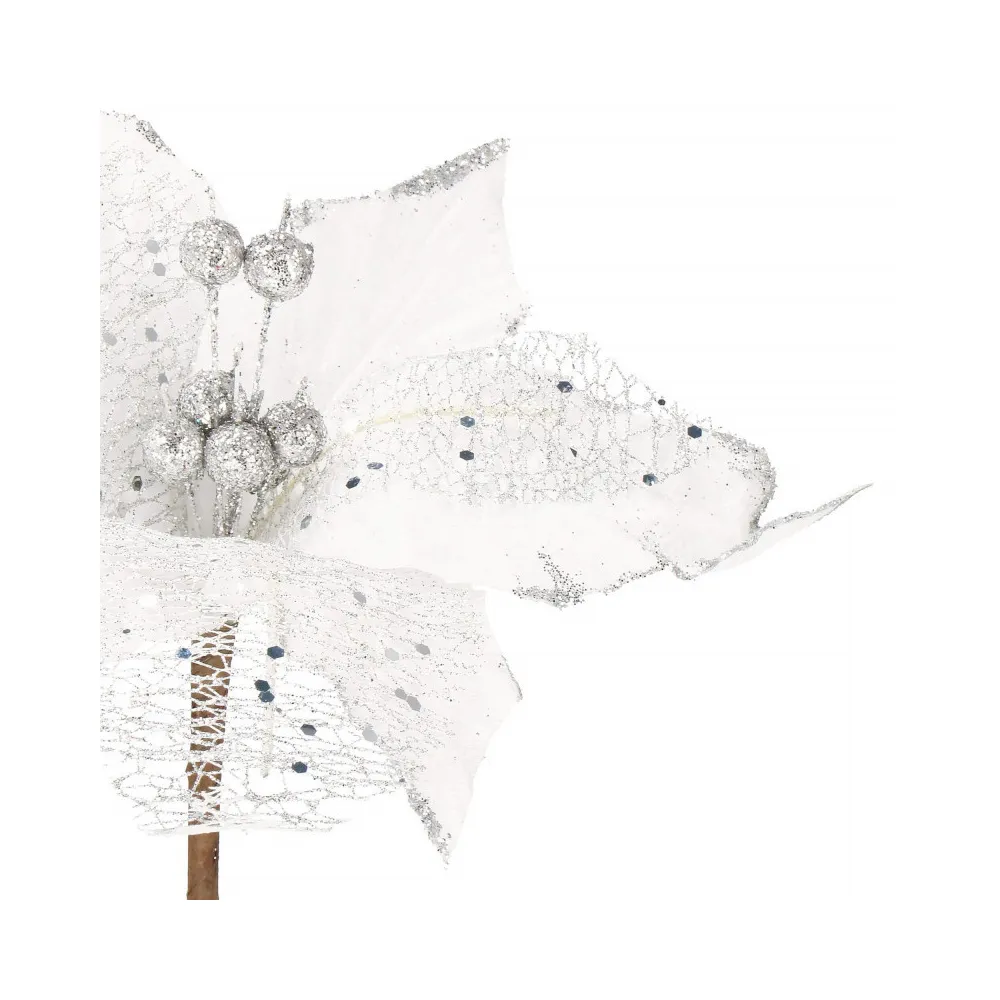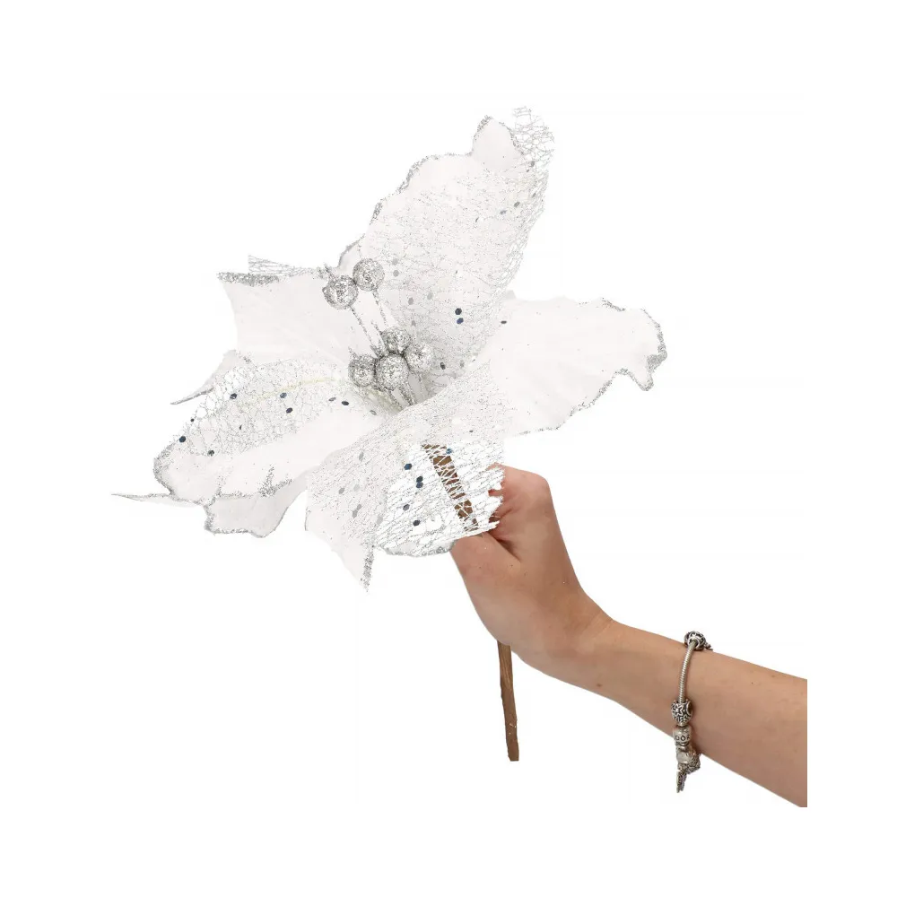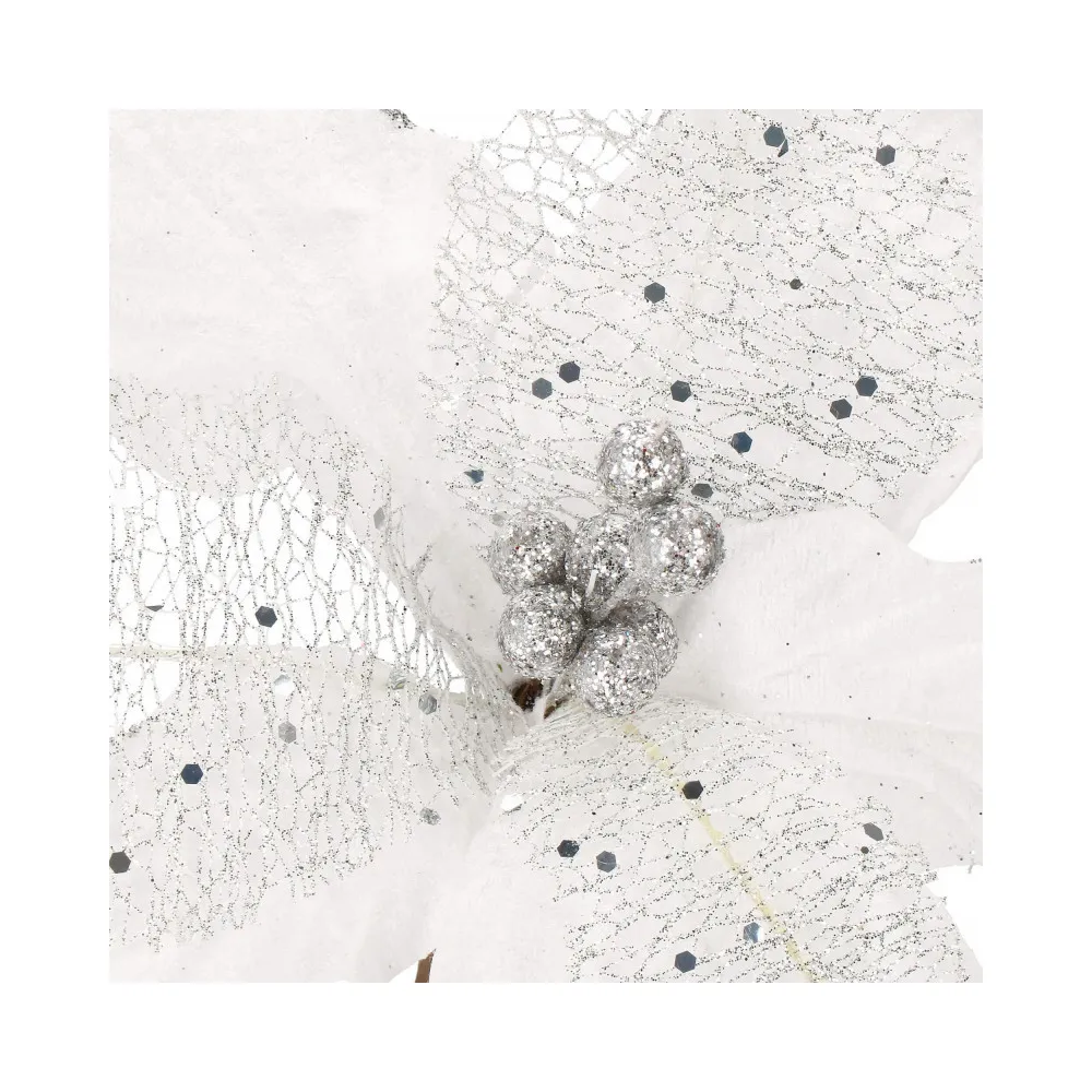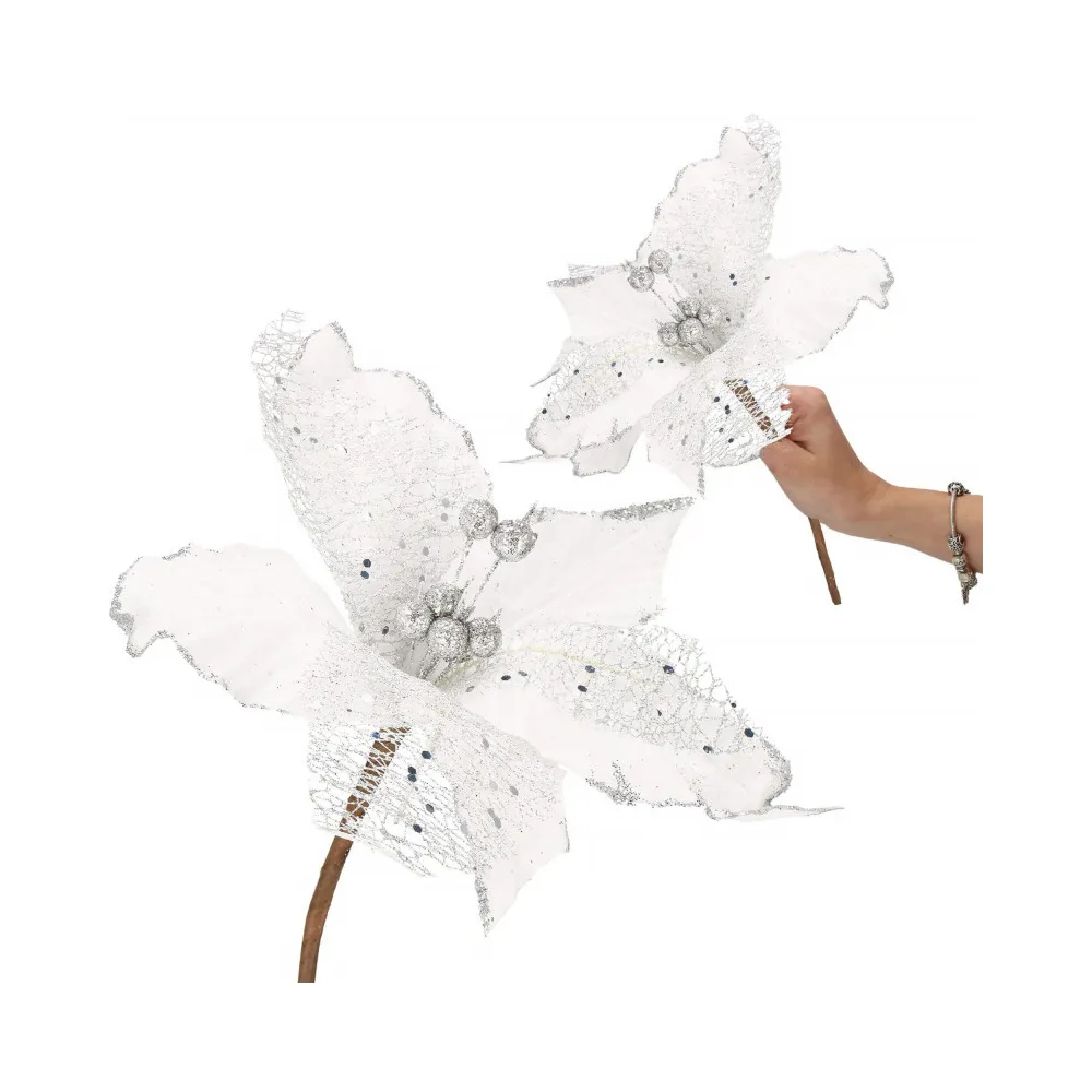 Umelý kvet vianočnej ruže s ružovými okvetnými lístkami zdobenými trblietkami. Realistické spracovanie, ohybná stonka pre ľahké pripevnenie do...