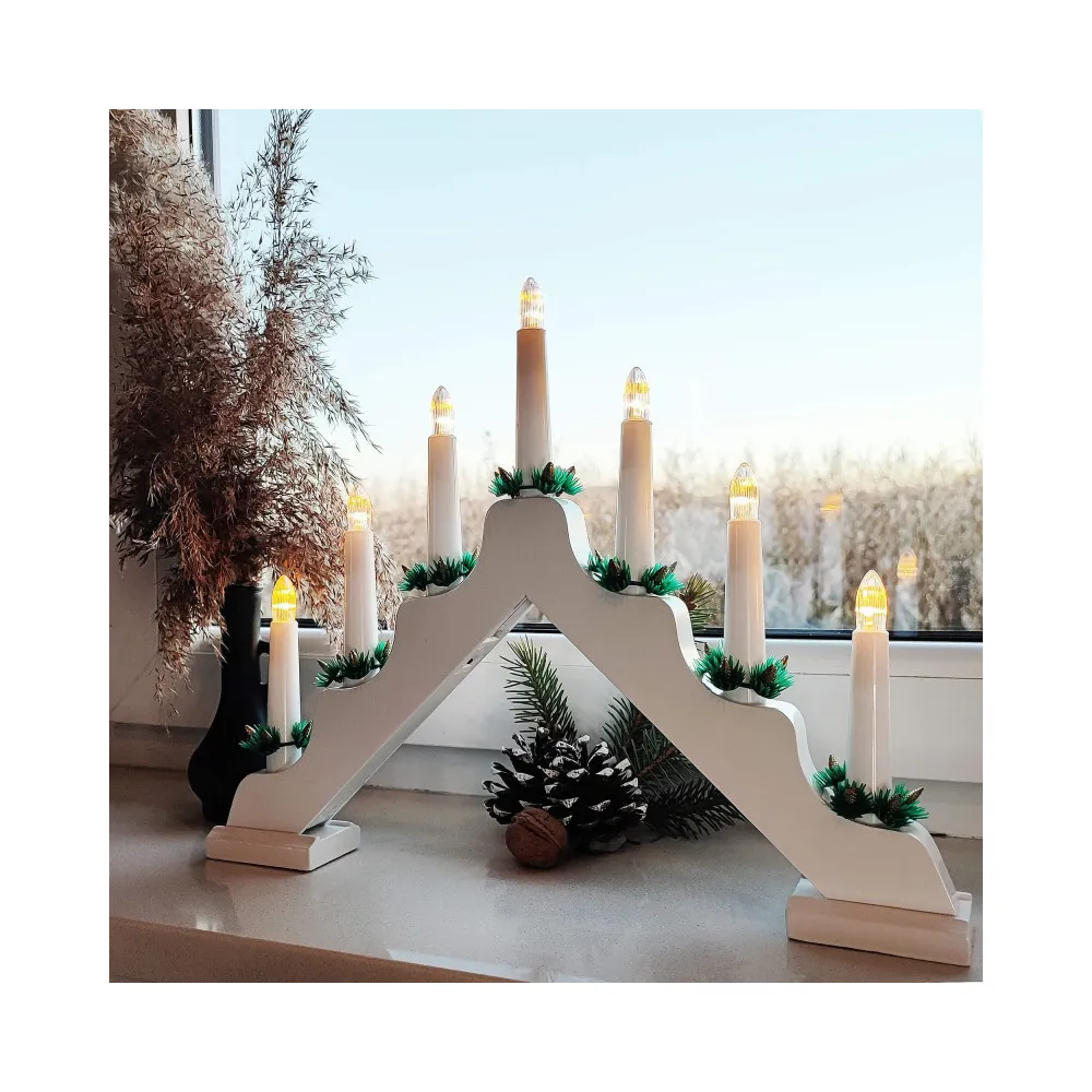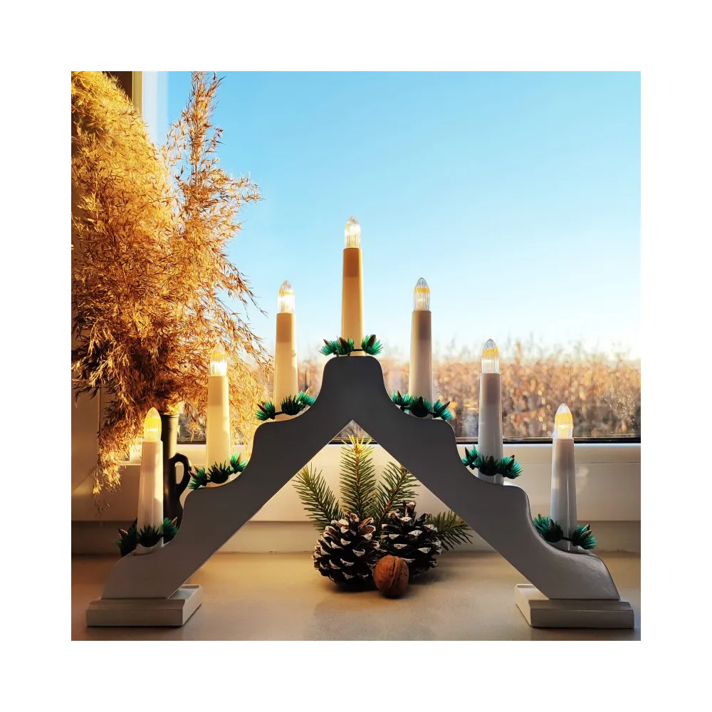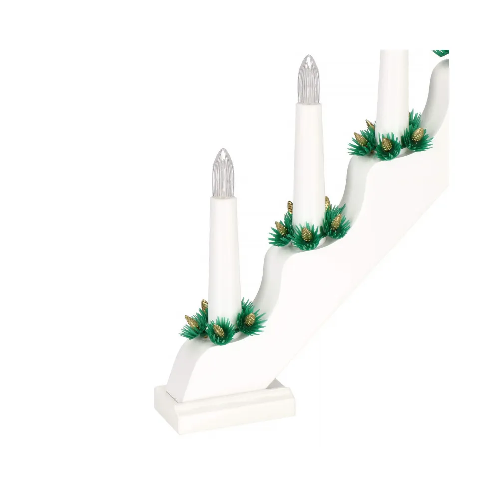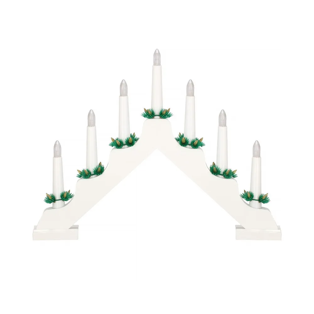 Drevený adventný svietnik so 7 ľad sviečkami a napájaním na batérie. Sviečky zdobené zeleným vencom so šiškami. Úsporné ľad diódy, vnútorné použitie. Farba svetla teplá biela, 7 ľad, napájanie 2x AA batérie.