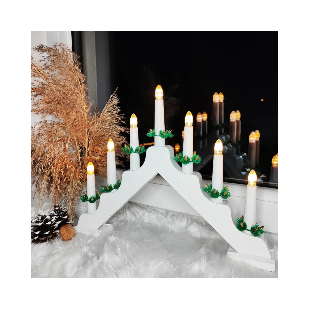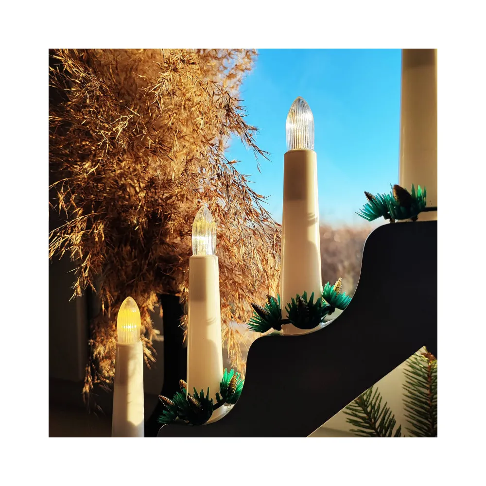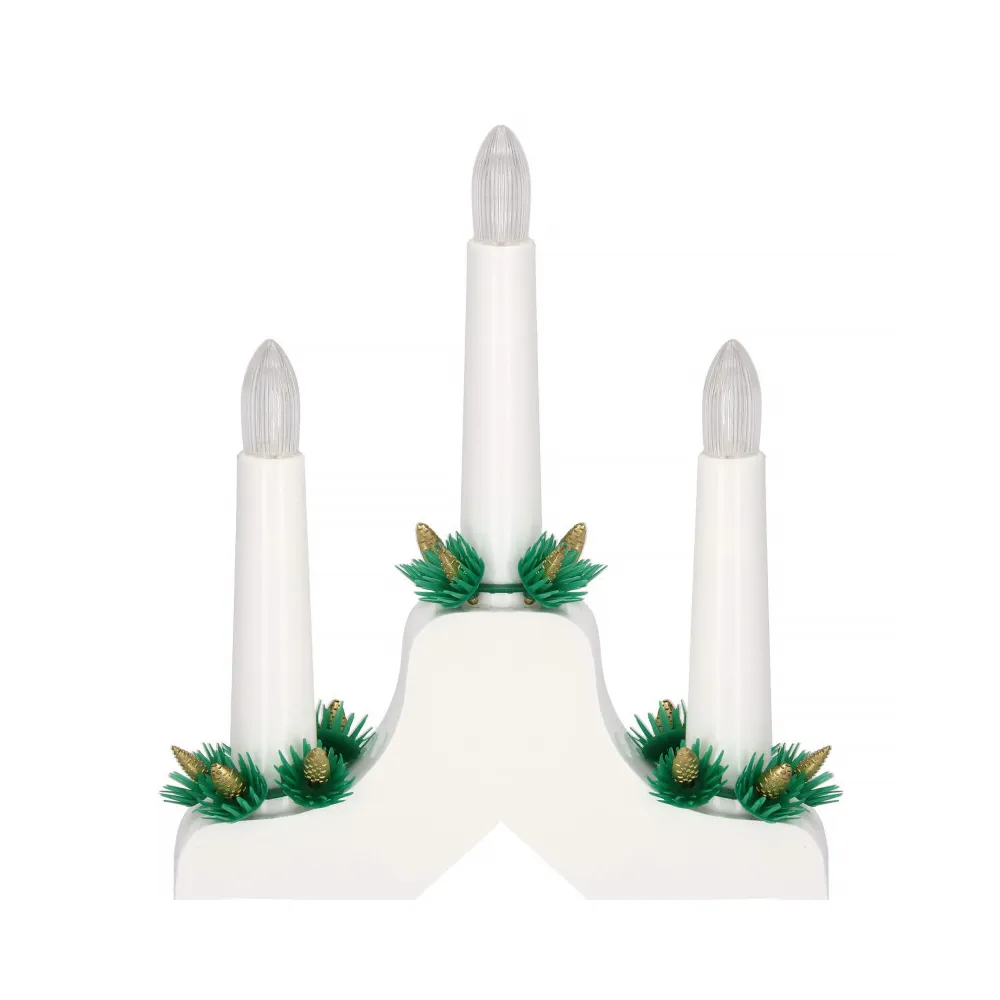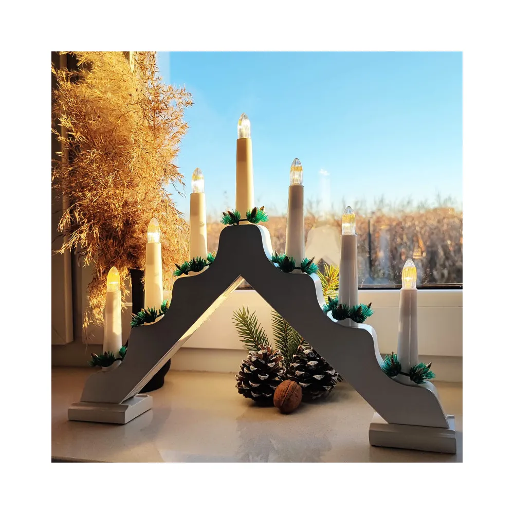 Drevený adventný svietnik so 7 ľad sviečkami a napájaním na batérie. Sviečky zdobené zeleným vencom so šiškami. Úsporné ľad diódy, vnútorné použitie. Farba svetla teplá biela, 7 ľad, napájanie 2x AA batérie.