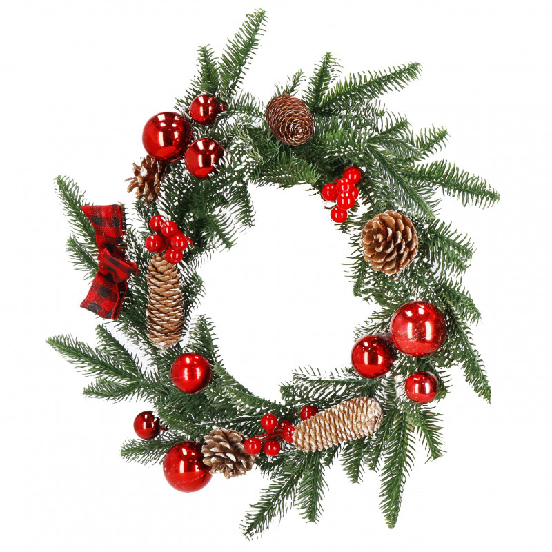 Prekrásny vianočný veniec s priemerom 50 cm. Bohato zdobený prírodnými a červenými ozdobami. Ideálne ako adventný veniec na stôl alebo dvere. Na vnútorné aj vonkajšie použitie.