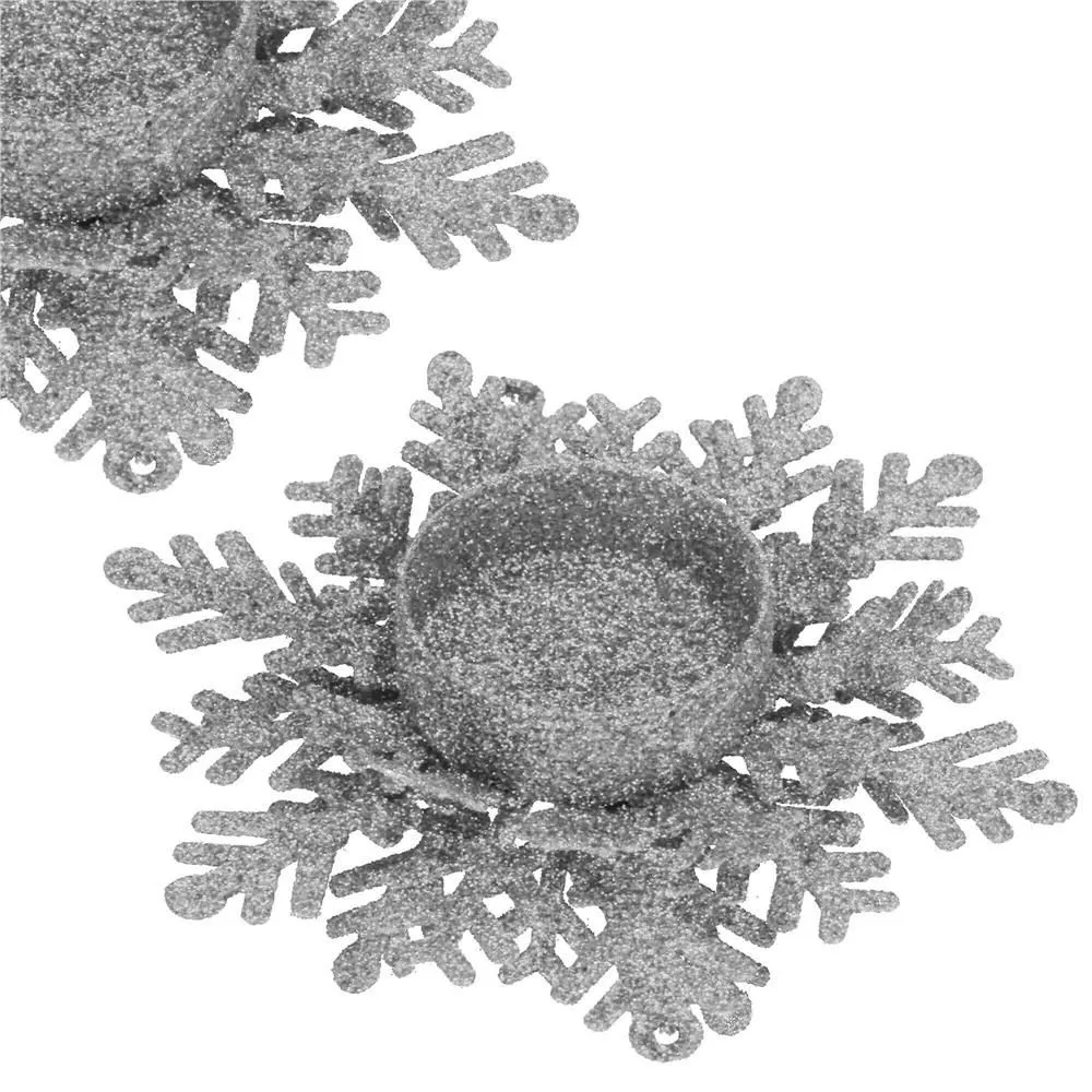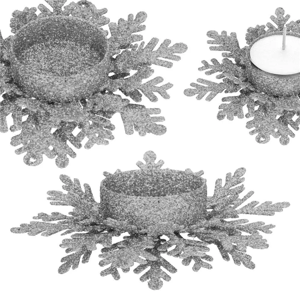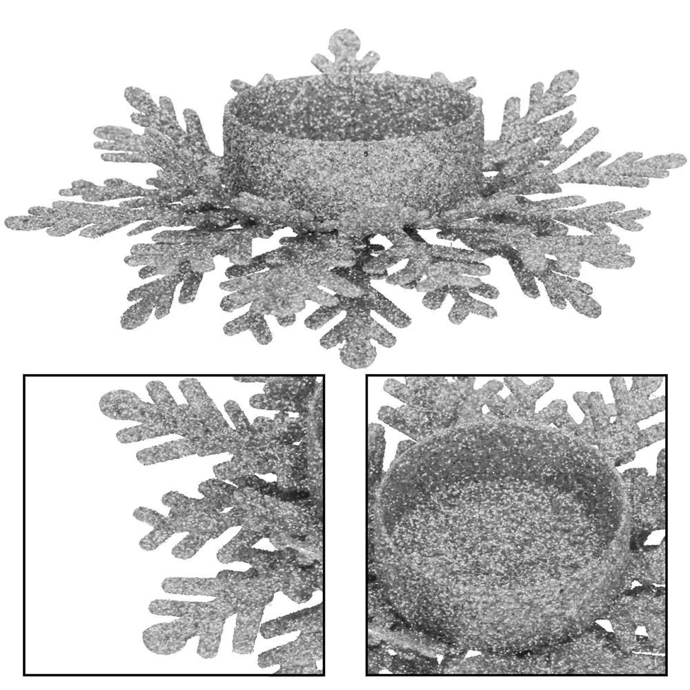 Tradičný kovový svietnik na čajovú sviečku. Dekoratívne zdobený striebornými vetvičkami a trblietkami. Perfektný pre obdobie Vianoc a adventu. Výška 3,5 cm, šírka 12 cm, priemer otvoru na sviečku 4 cm.