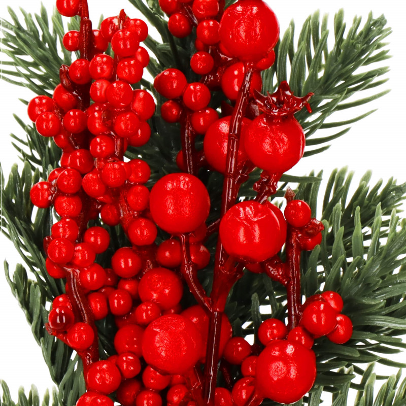 Bohato zdobená vetvička s bobuľami červených jarebín a jabĺčkom. Zužený koniec pre ľahké zapichnutie. Výška 32 cm, šírka 9 cm. Prekrásna dekorácia, ktorá môže byť použitá samostatne alebo ako prvok väčších aranžmánov. Vhodné pre vnútorné aj vonkajšie použitie.