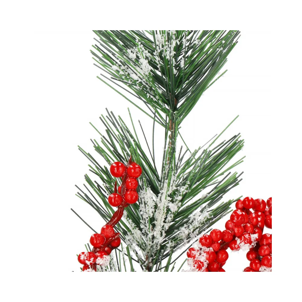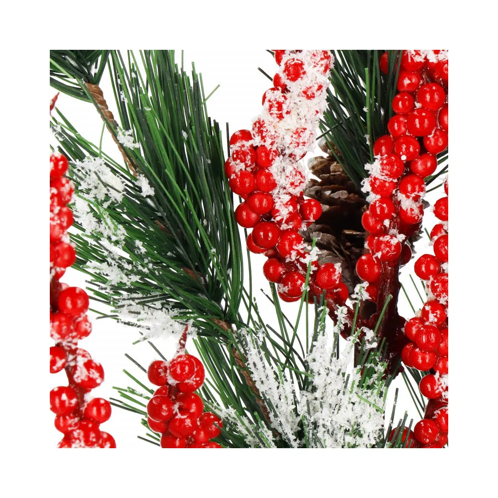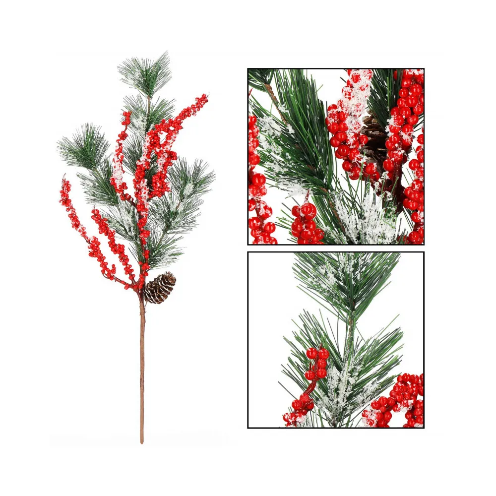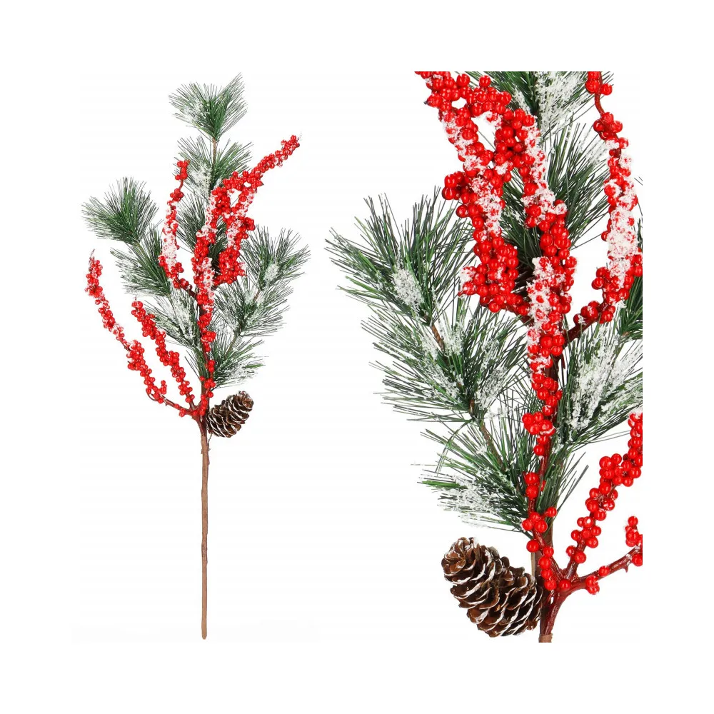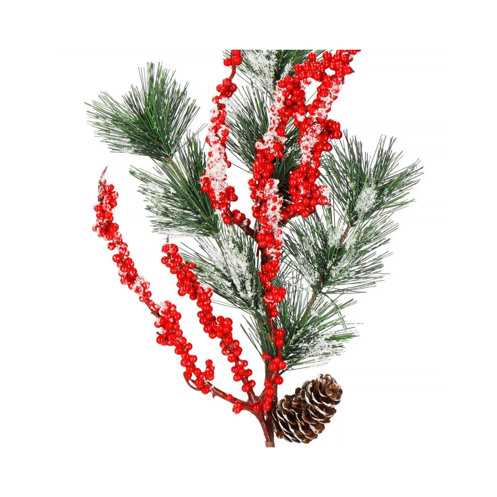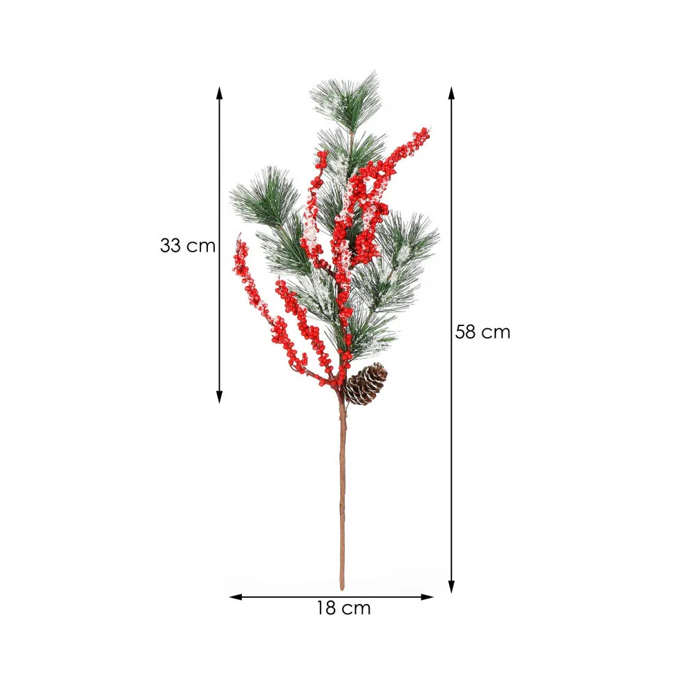 Bohato zdobená vetvička thuje s bobuľami červených jarebín a šiškou. Efekt námrazy, zúžený koniec pre ľahké zapichnutie. Výška 58 cm, šírka 18 cm. Prekrásna dekorácia, ktorá môže byť použitá samostatne alebo ako prvok väčších aranžmánov. Vhodné pre vnútorné aj vonkajšie použitie.
