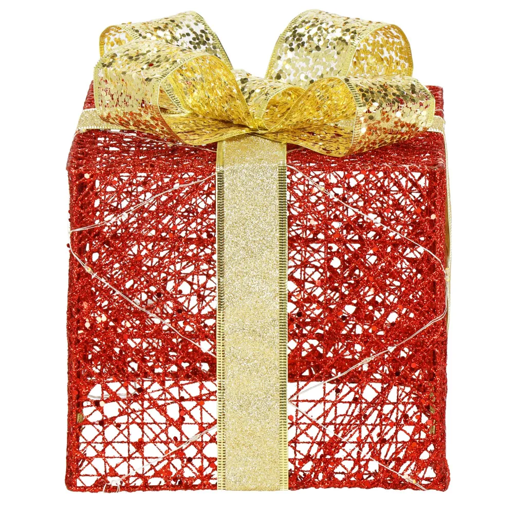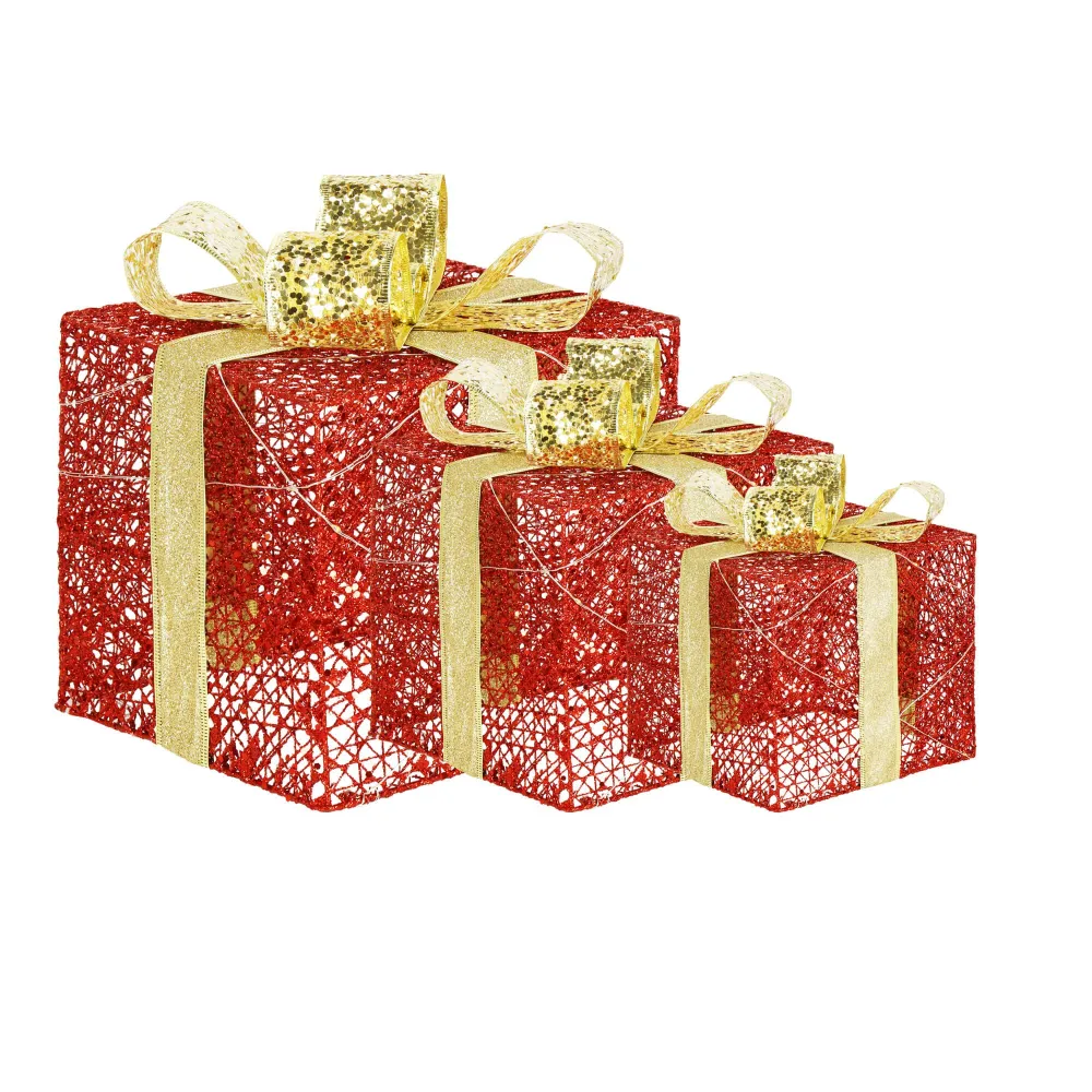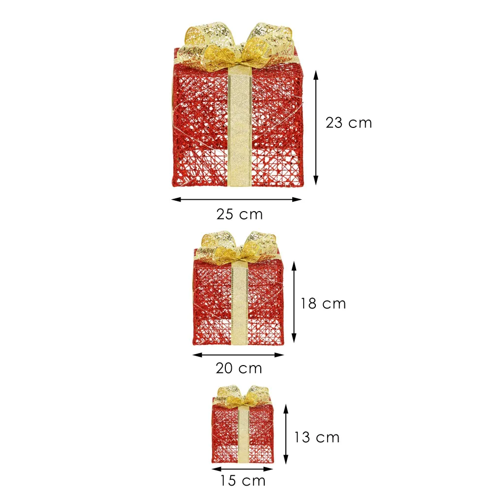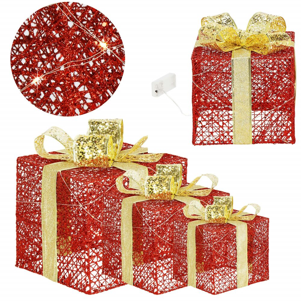 Nádherný set 3 kusov svietiacich darčekov rôznych veľkostí - 15x15, 20x20 a 25x25 cm. Drôtený vzhľad, husto zdobené červenými trblietkami a previazané trblietavou zlatou stuhou. Darčeky sú opletené LED osvetlením. Je možné ľubovoľne umiestniť, každý darček má svoj vlastný box na batérie. Detailné spracovanie. Prekrásna vianočná dekorácia, ktorá sa stane ozdobou každého interiéru.