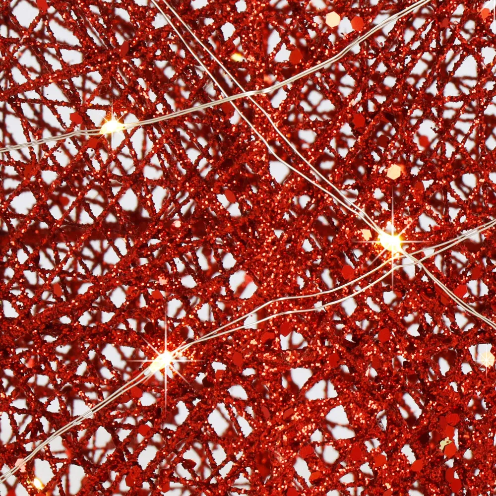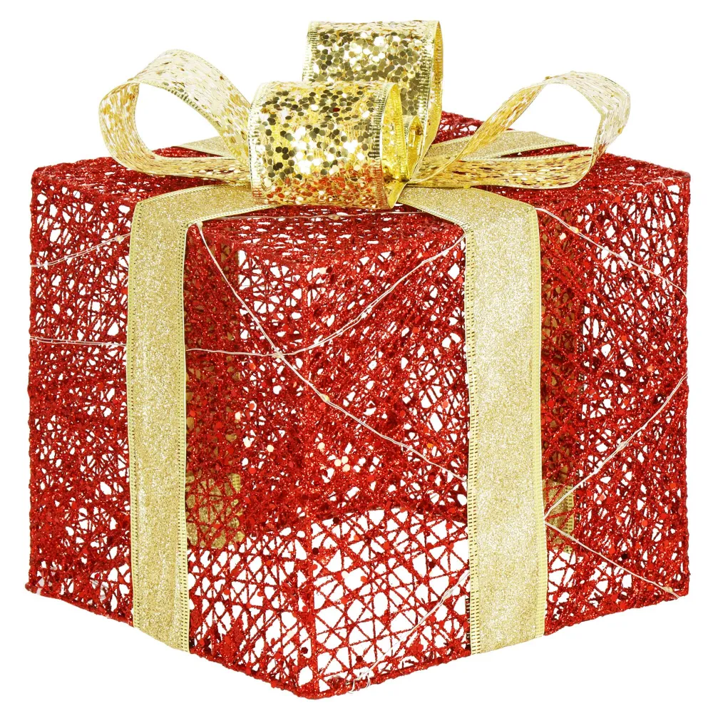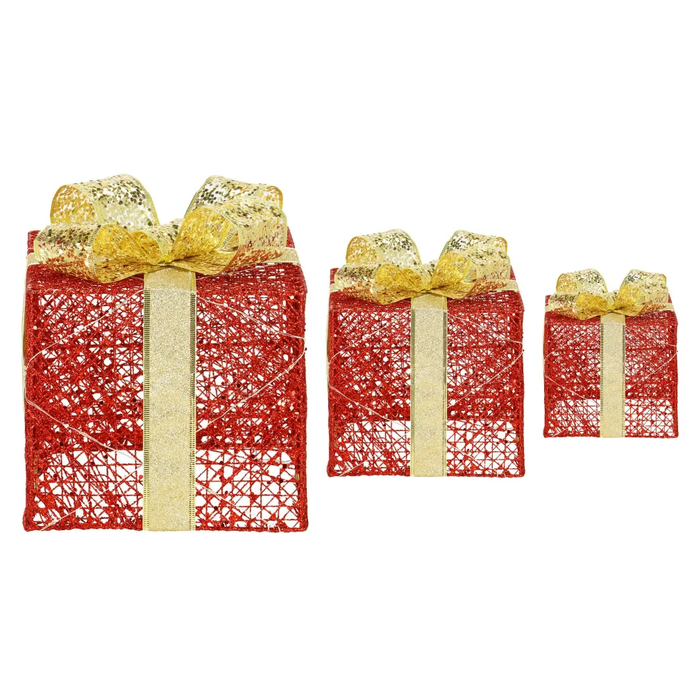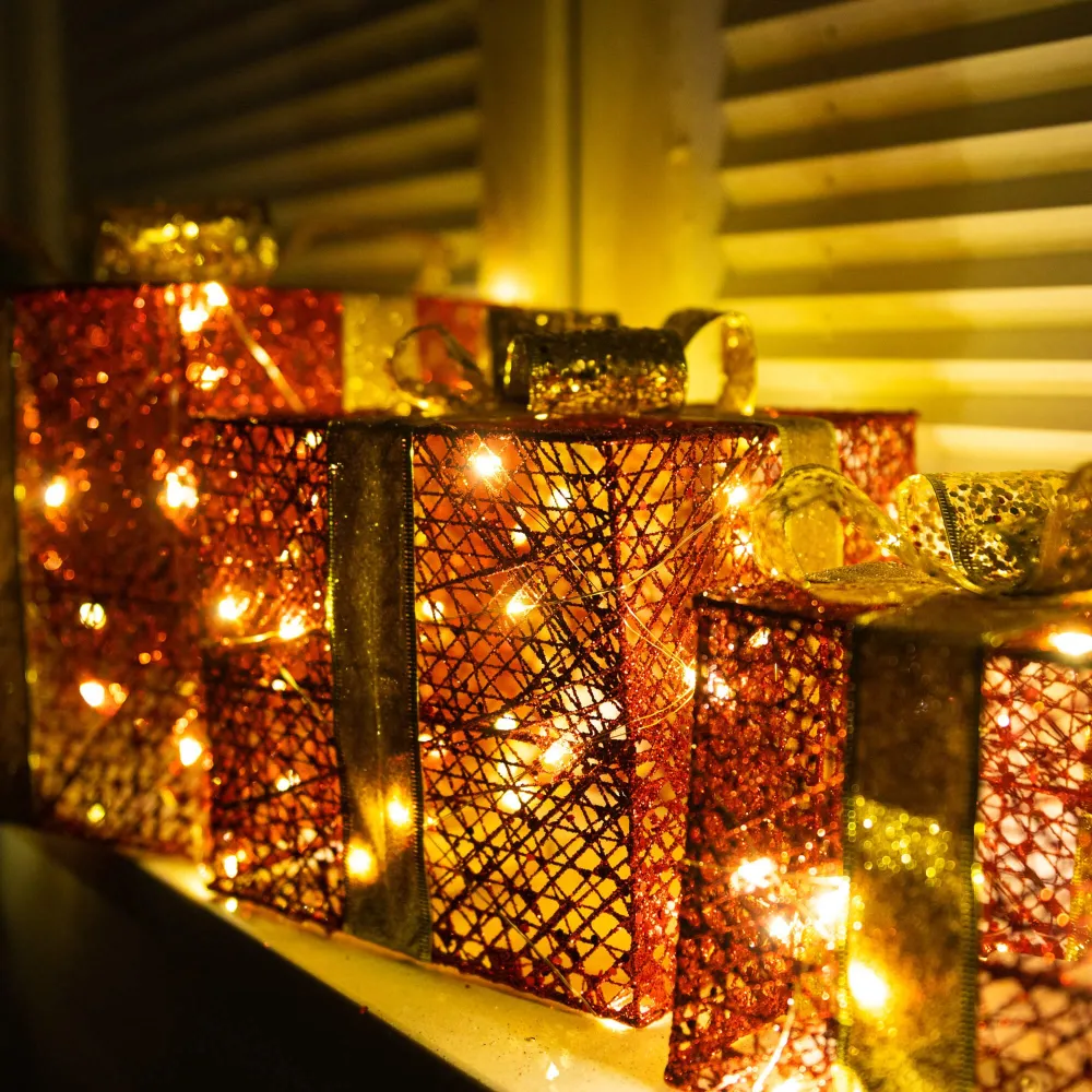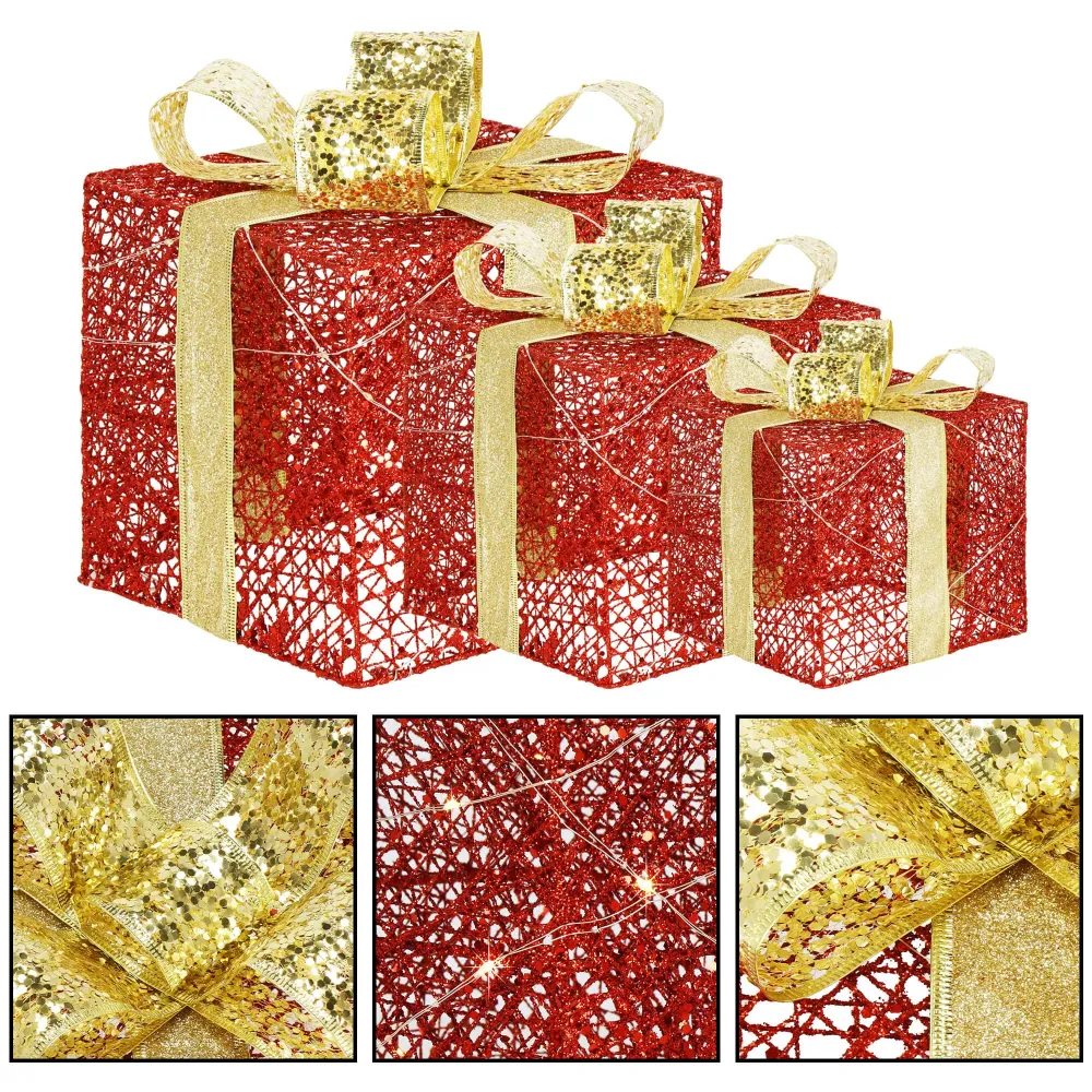 Nádherný set 3 kusov svietiacich darčekov rôznych veľkostí - 15x15, 20x20 a 25x25 cm. Drôtený vzhľad, husto zdobené červenými trblietkami a previazané trblietavou zlatou stuhou. Darčeky sú opletené LED osvetlením. Je možné ľubovoľne umiestniť, každý darček má svoj vlastný box na batérie. Detailné spracovanie. Prekrásna vianočná dekorácia, ktorá sa stane ozdobou každého interiéru.