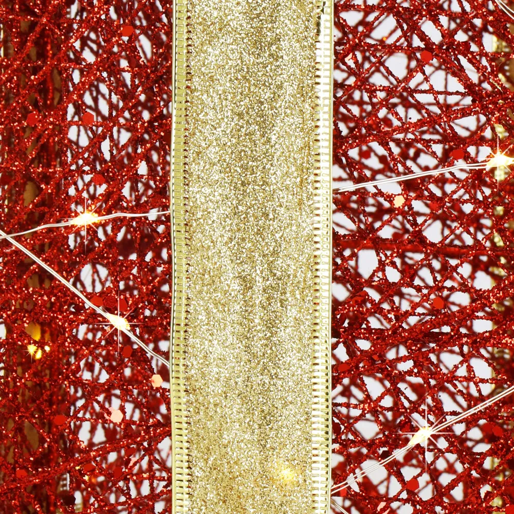 Drôtený prelamovaný dizajn je husto posiaty červenými trblietkami, ktoré podčiarkujú slávnostný vzhľad. Celkový dojem završuje nádherná zlatá stuha, ktorá obopína každý z darčekov a dodáva im luxusný nádych. Táto dekorácia je ideálna pre umiestnenie na okenný parapet, pod stromček, na poličku alebo kamkoľvek inam vo vašom domove, kde chcete navodiť vianočnú náladu. Perfektná voľba pre tých, ktorí si potrpia na štýl a eleganciu.