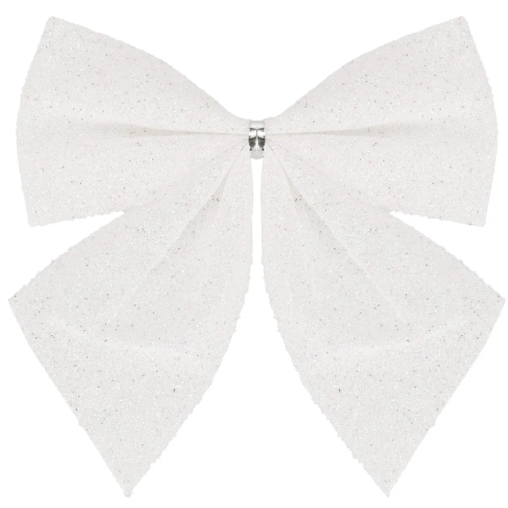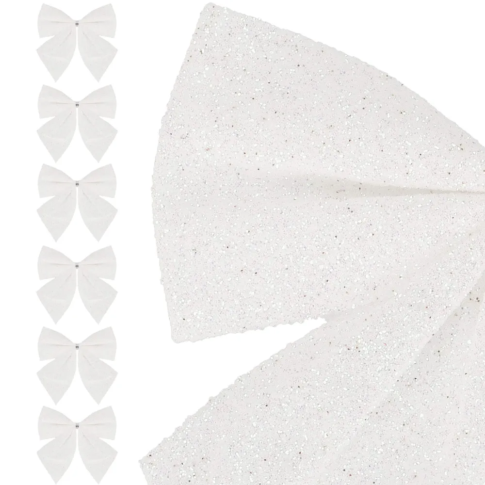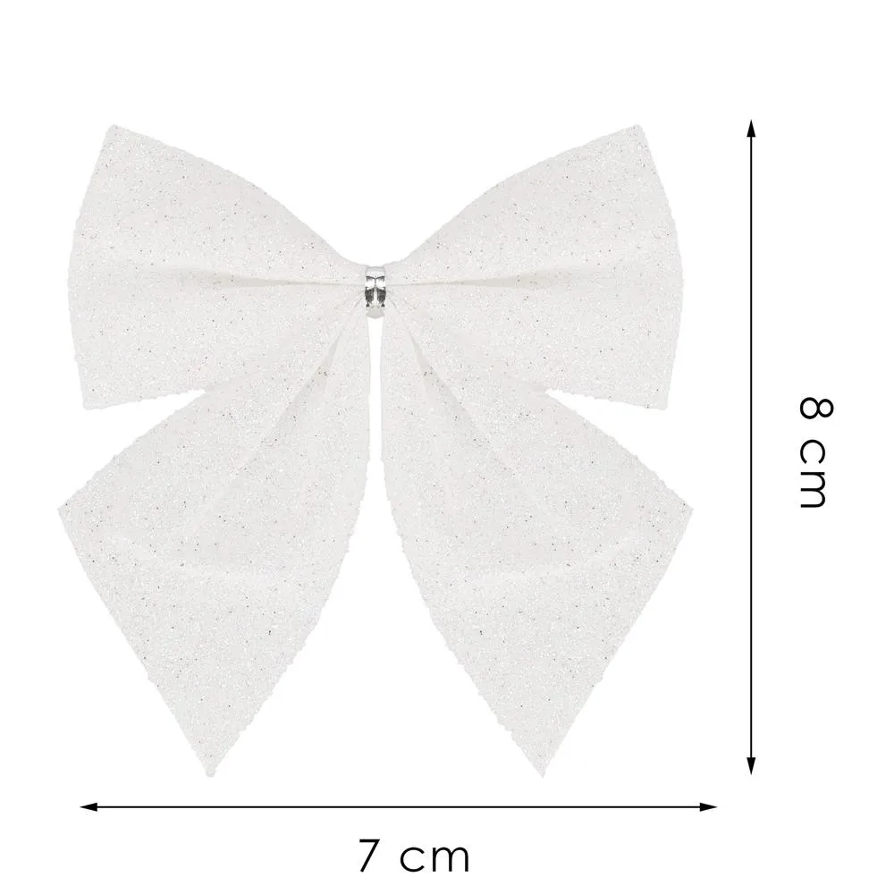 Sada 6 ks vianočných mašlí s drôtikom, vďaka ktorému sa dá ľahko a rýchlo pripevniť na vetvu vianočného stromčeka, trstinu alebo girlandu. Farba mašlí je biela s trblietkami. Perfektný na zdobenie darčekov, vencov, tvorbu vianočných dekorácií alebo ako ozdoba vianočného stromčeka.