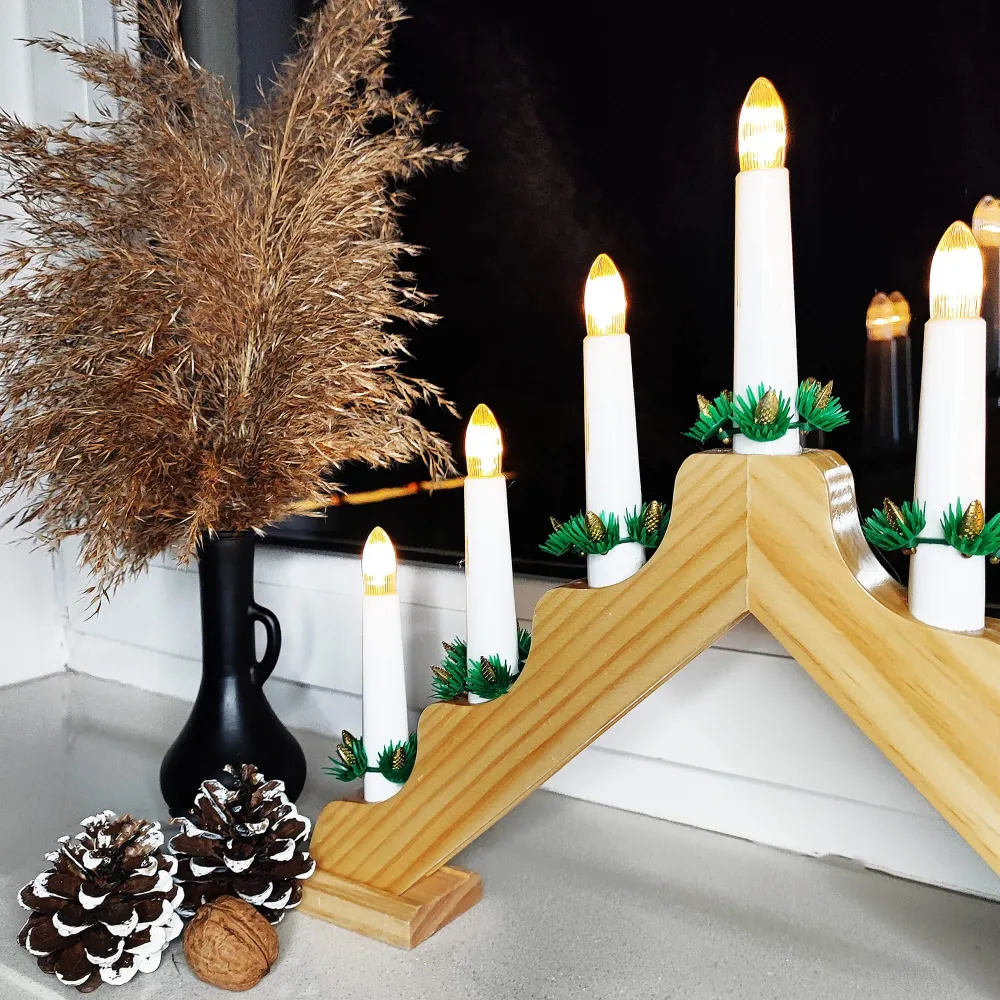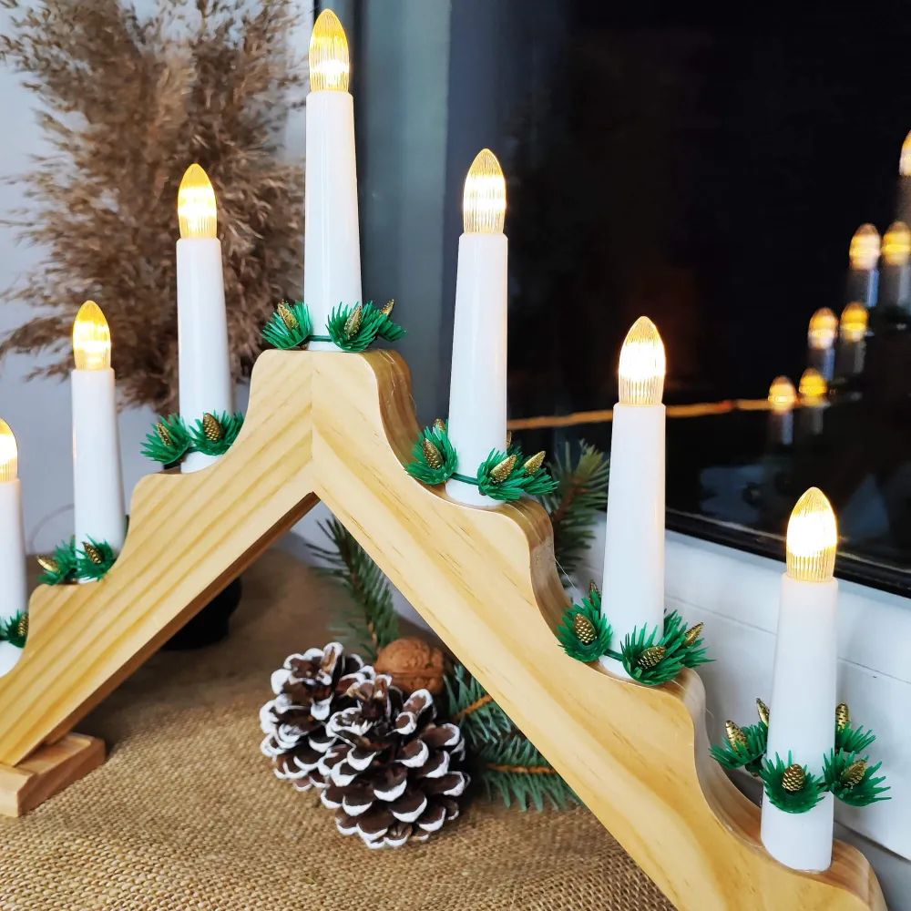 Prekrásny adventný svietnik so 7 ľad sviečkami, ktoré sú zdobené zeleným vencom so šiškami. Úsporné ľad diódy, farba svetla teplá biela, napájanie 2x AA batérie. Certifikácia CE, IP20, na vnútorné použitie.