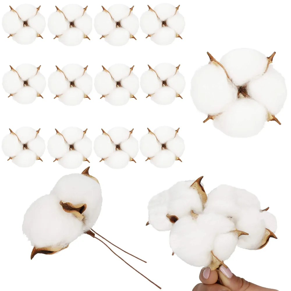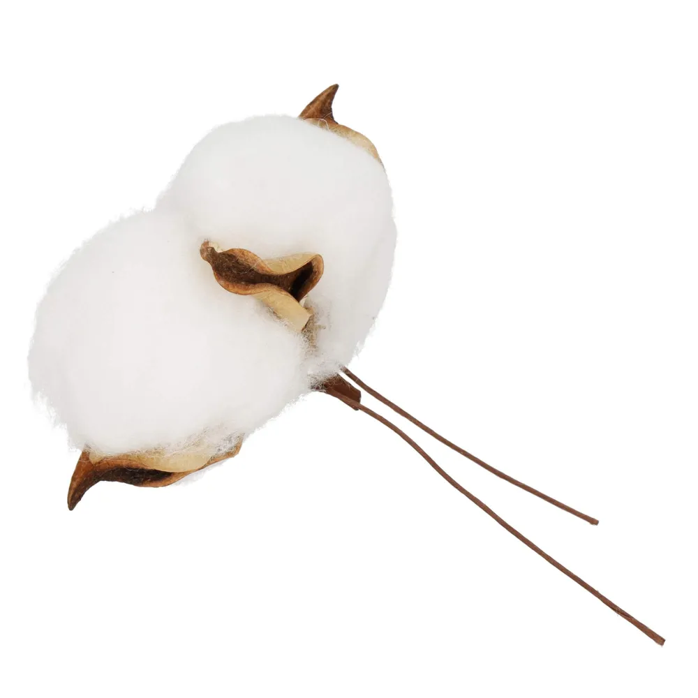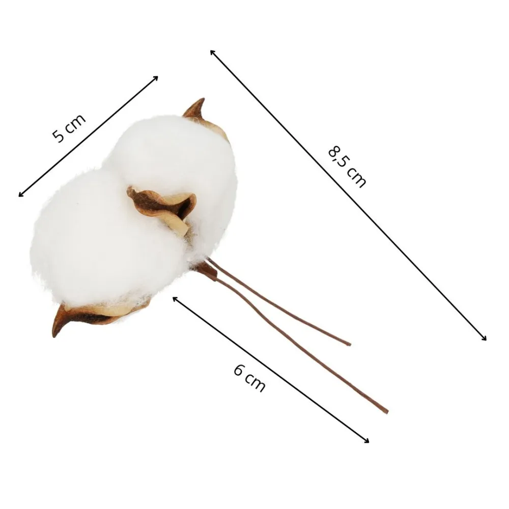 Súprava 12 kusov kvetov bavlny z prírodného materiálu, veľkosť kvetu 5 cm. Realistické spracovanie, zakončené drôtikmi pre ľahké pripevnenie do rôznych vianočných aranžmánov. Skvele sa tiež hodí ako ozdoba stromčeka alebo ako samostatná dekorácia.